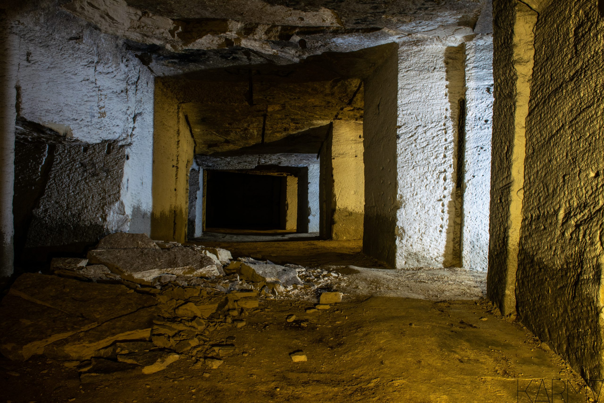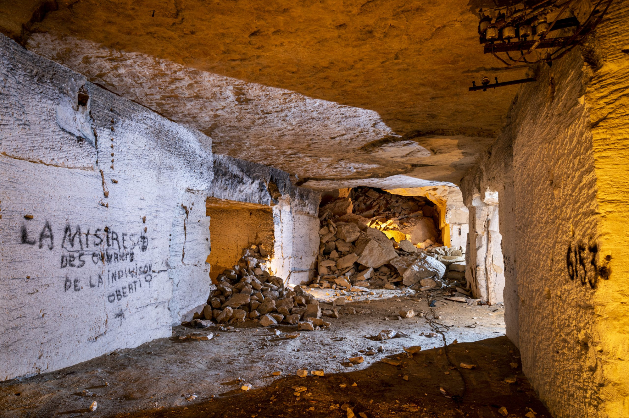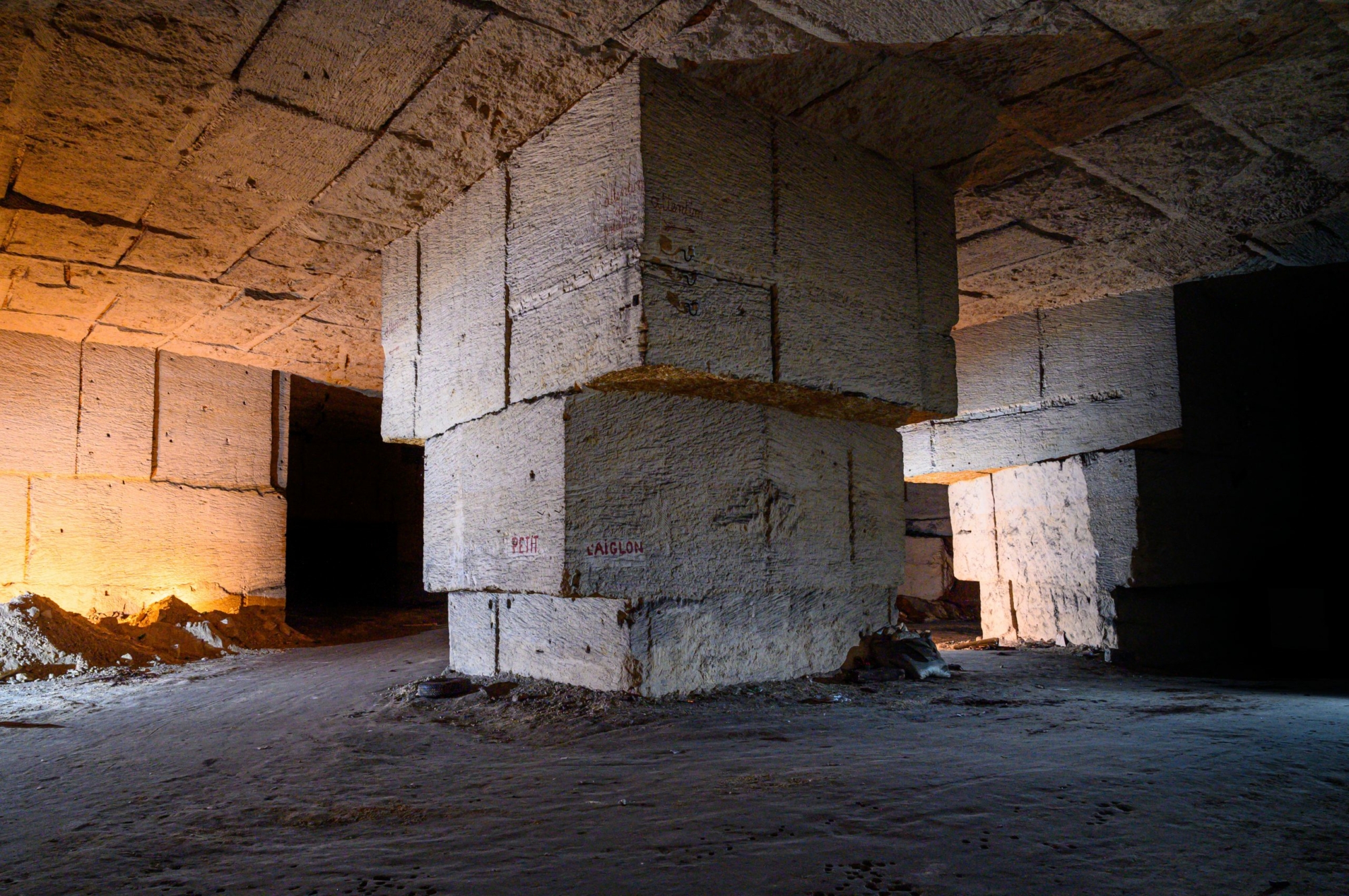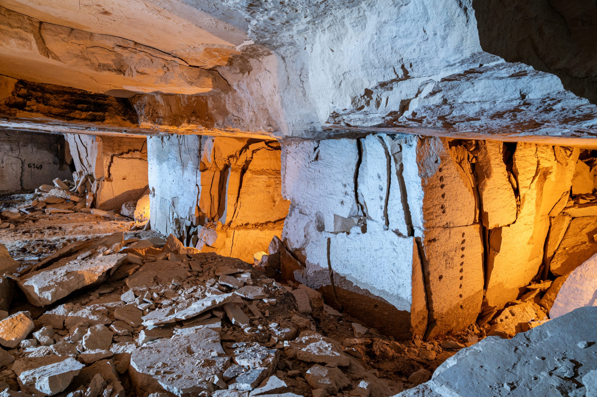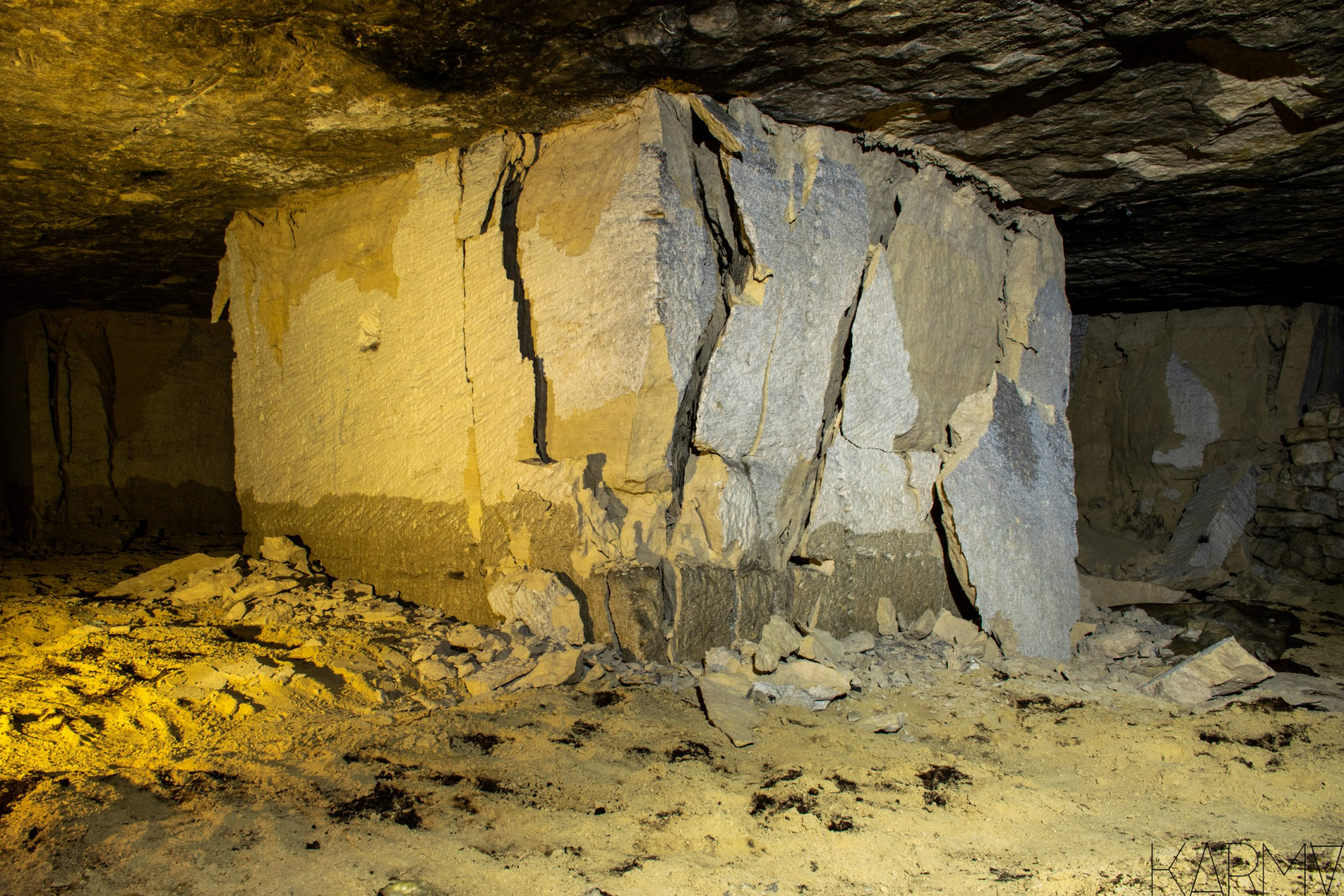 Piliers écaillés dans cette champignonnière. La surexploitation des sols cumulées à la surcharge des terrains de surface font flamber les piliers de masse de la carrière. Déjà très fragilisée par un premier effondrement en 1963 puis un second en 2001. C'est maintenant plus qu'une question de temps avant que cette zone se referme sur elle-même.