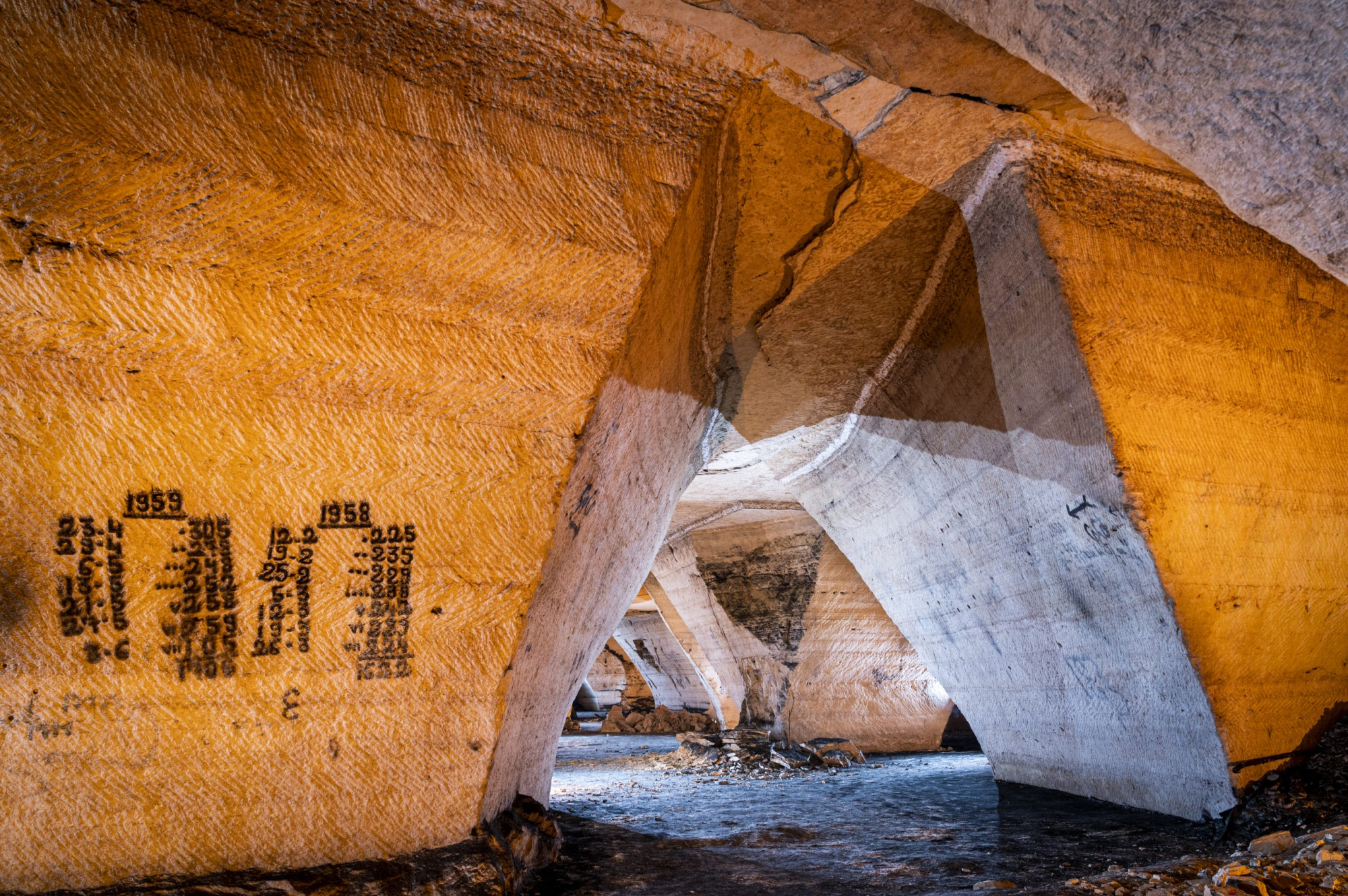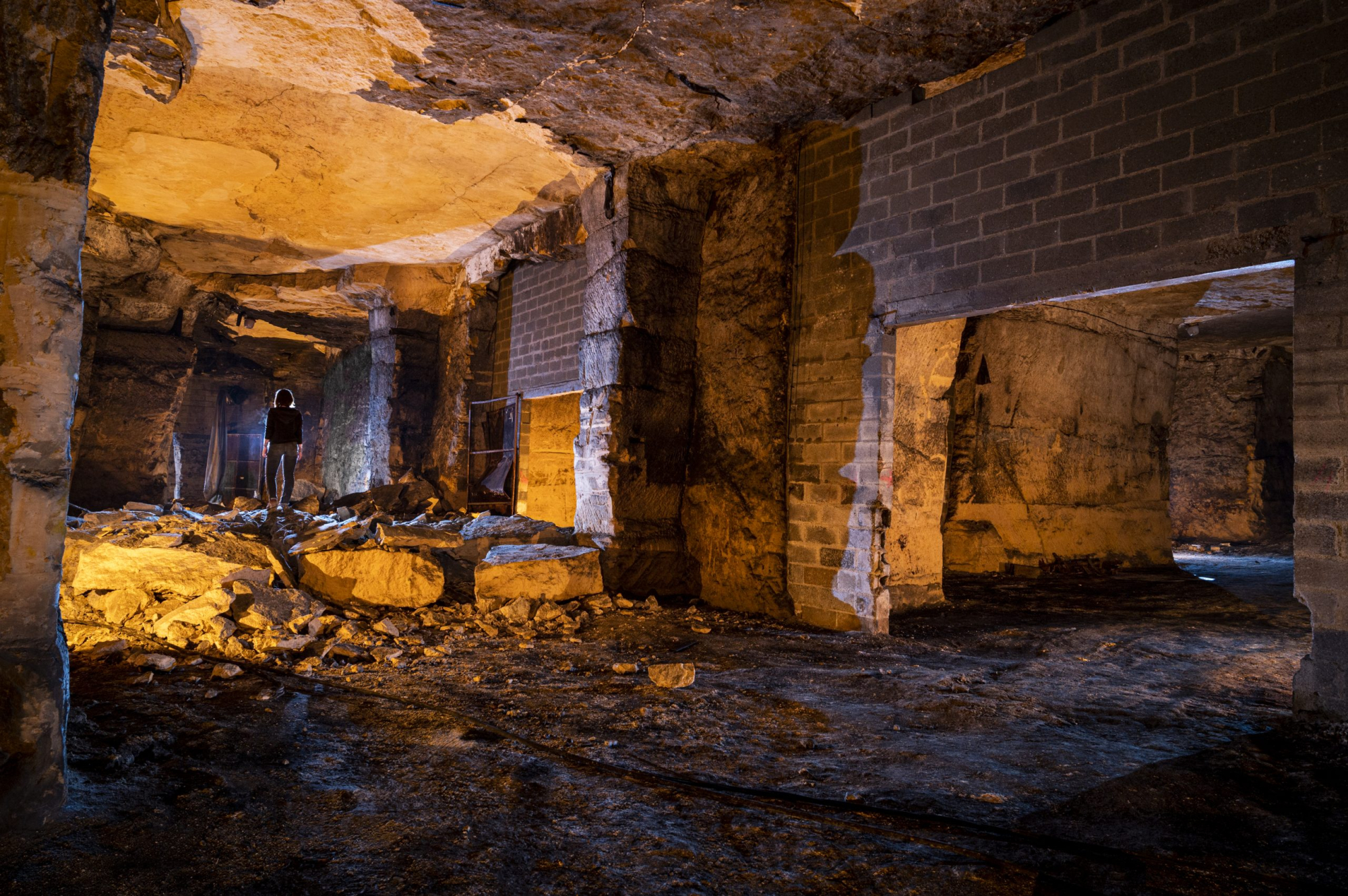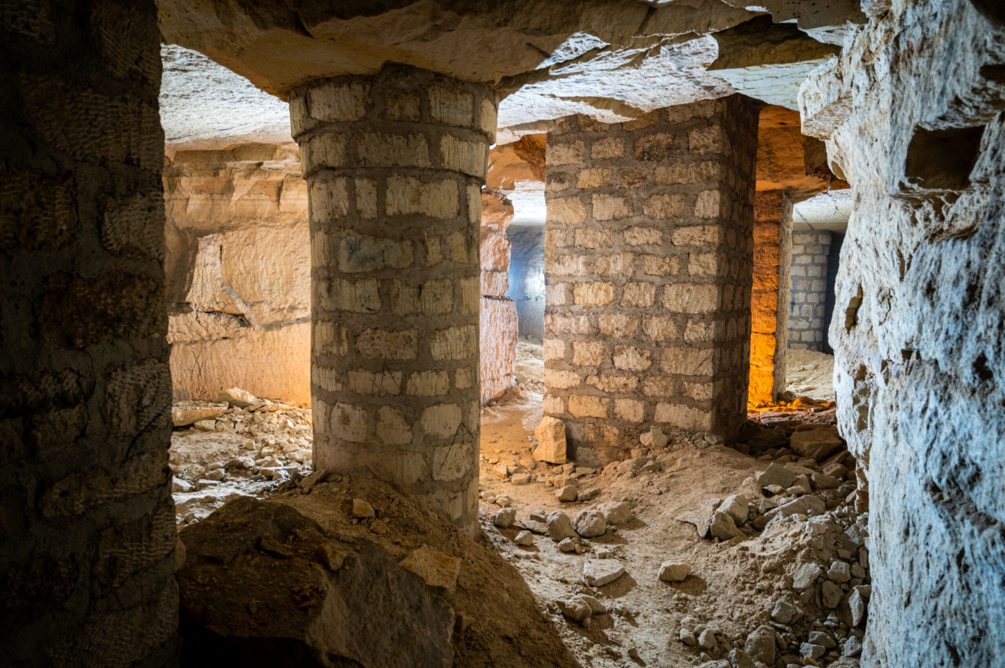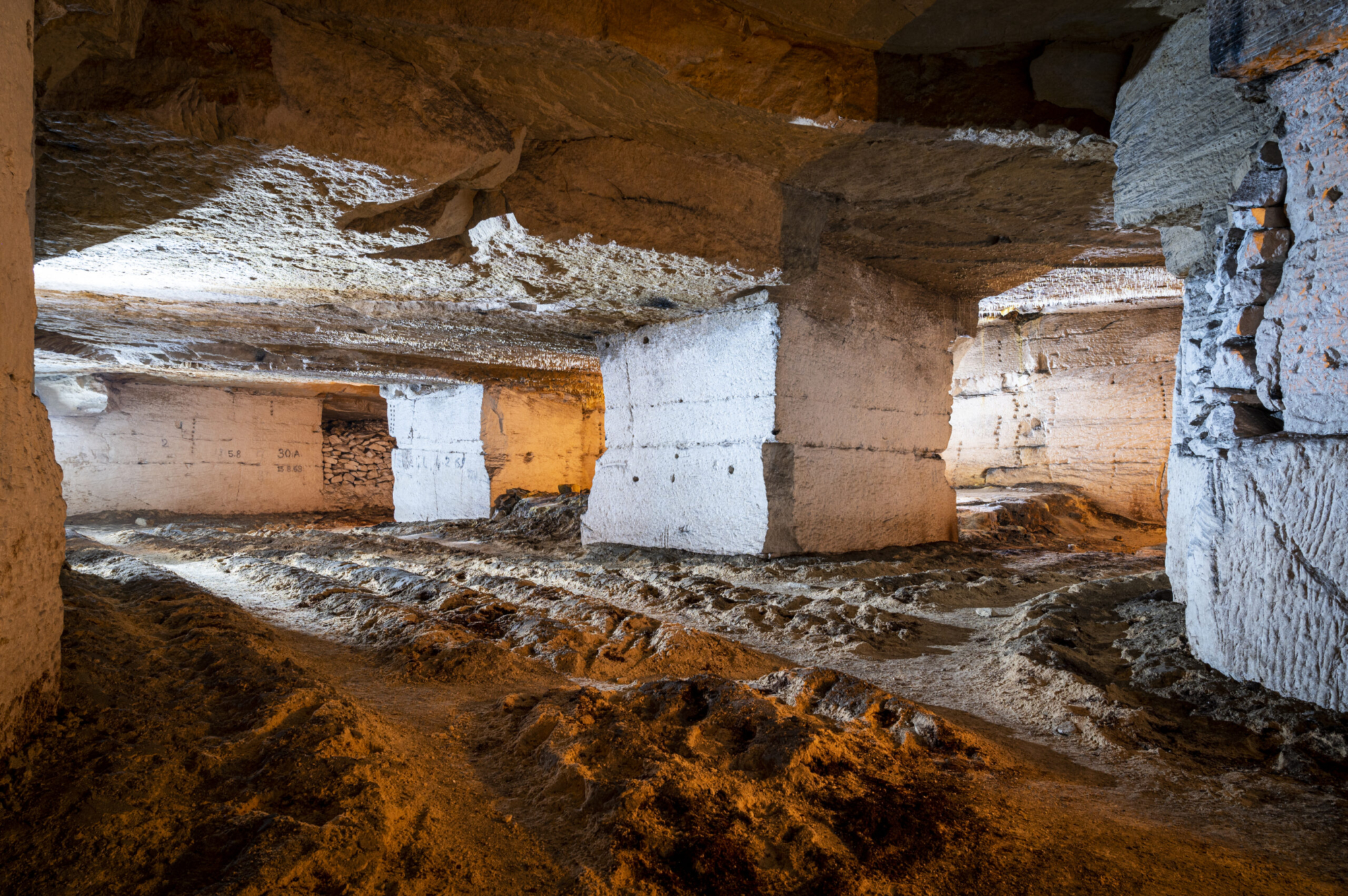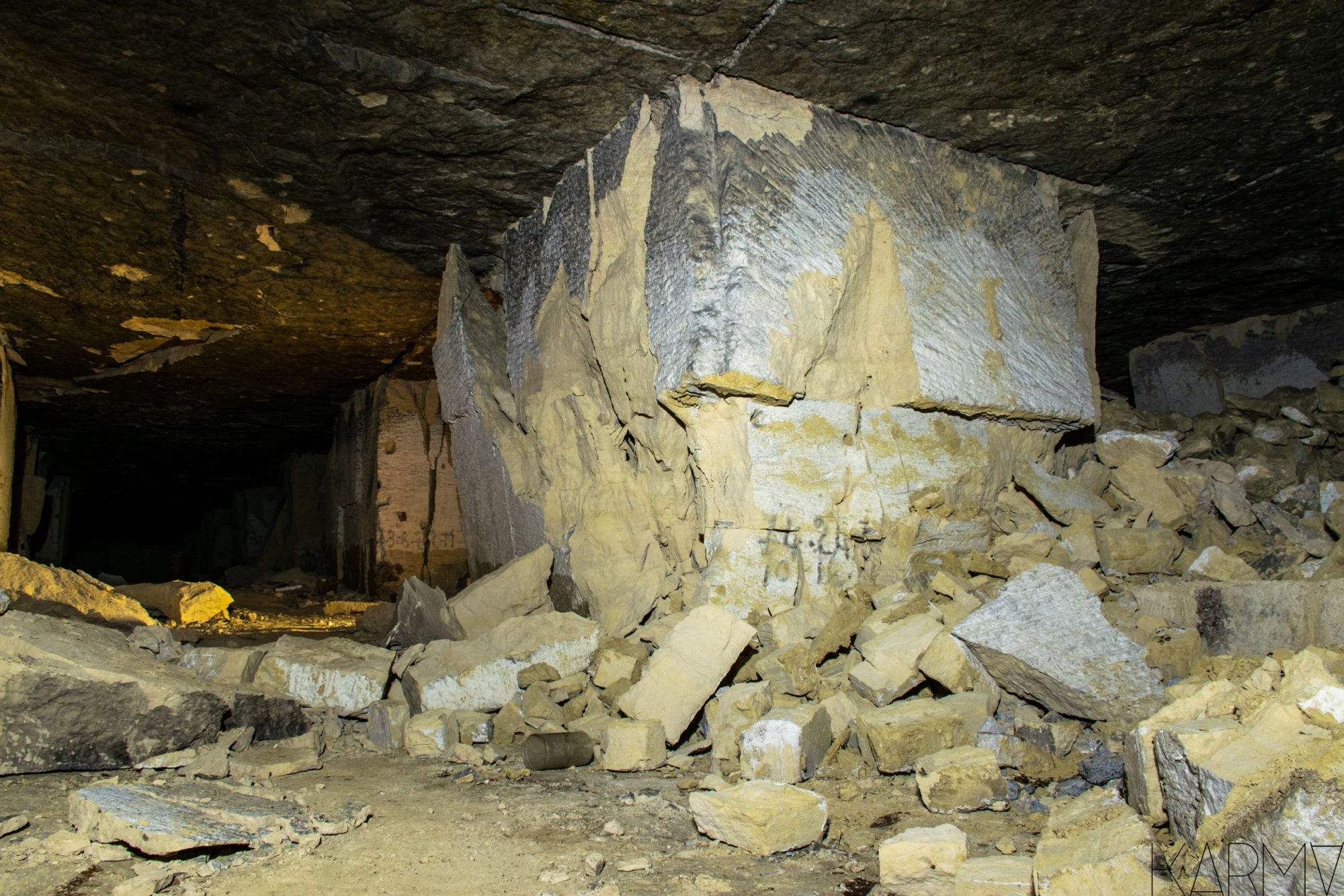Piliers écaillés dans cette champignonnière. La surexploitation des sols cumulées à la surcharge des terrains de surface font flamber les piliers de masse de la carrière. Déjà très fragilisée par un premier effondrement en 1963 puis un second en 2001. C'est maintenant plus qu'une question de temps avant que cette zone se referme sur elle-même.