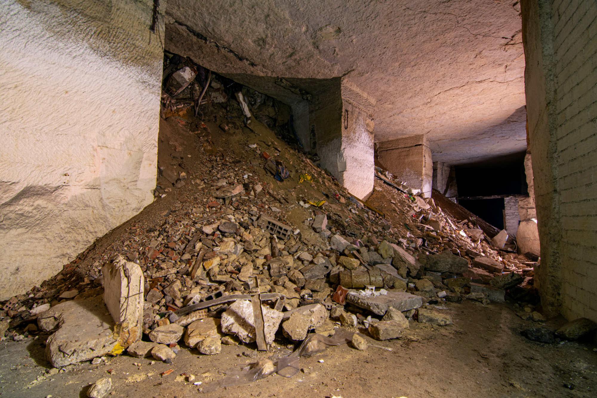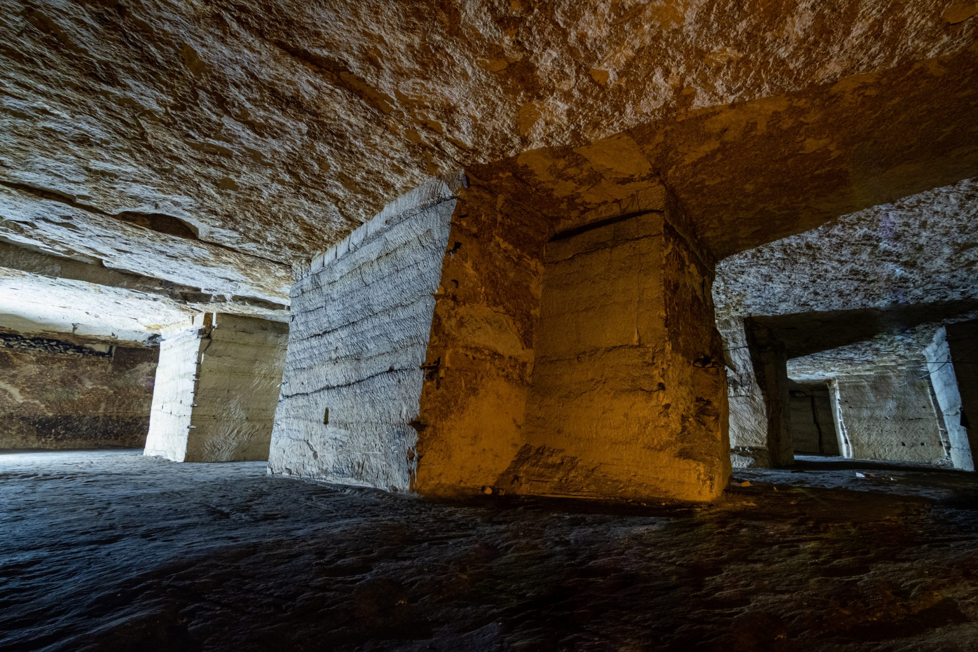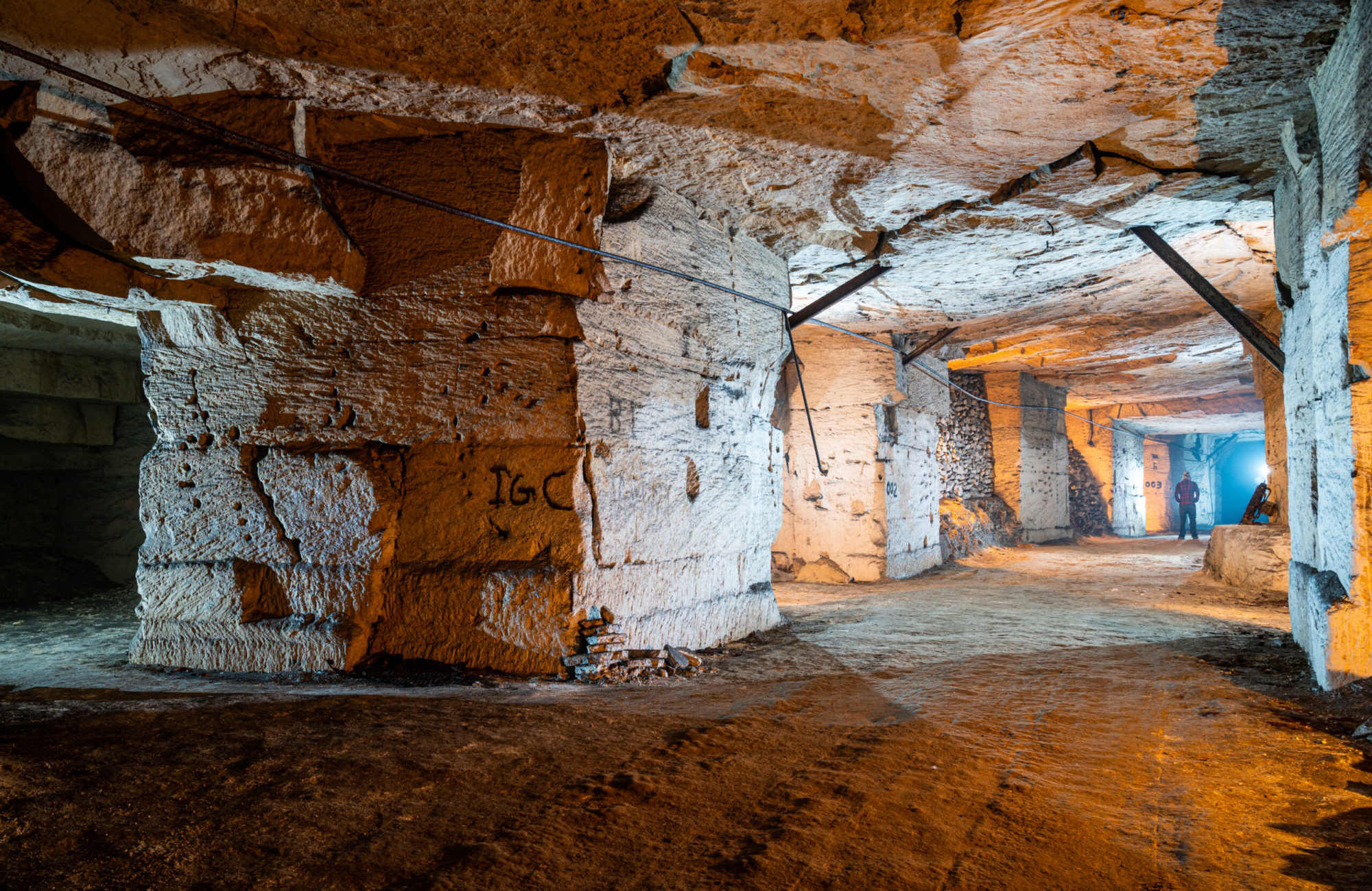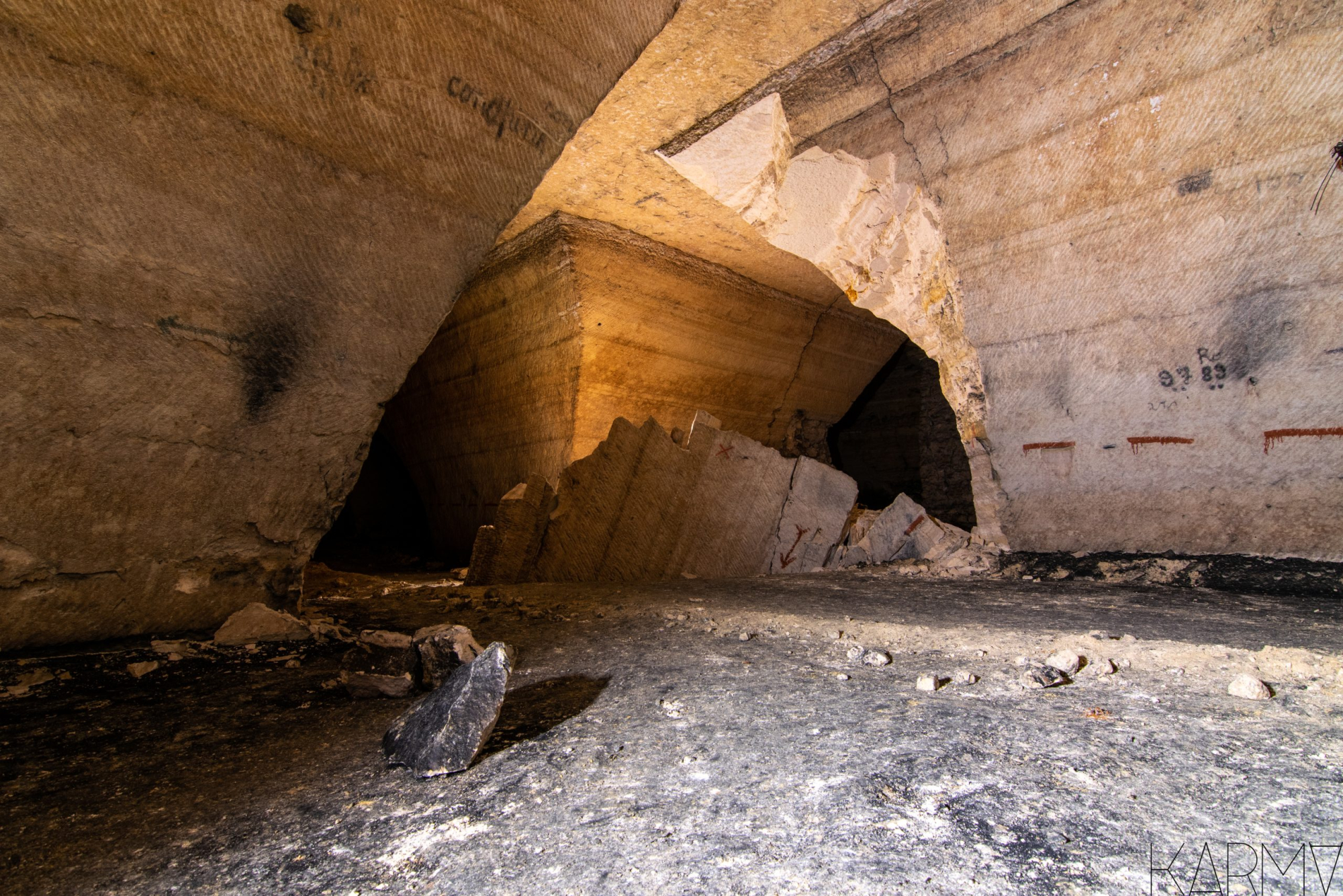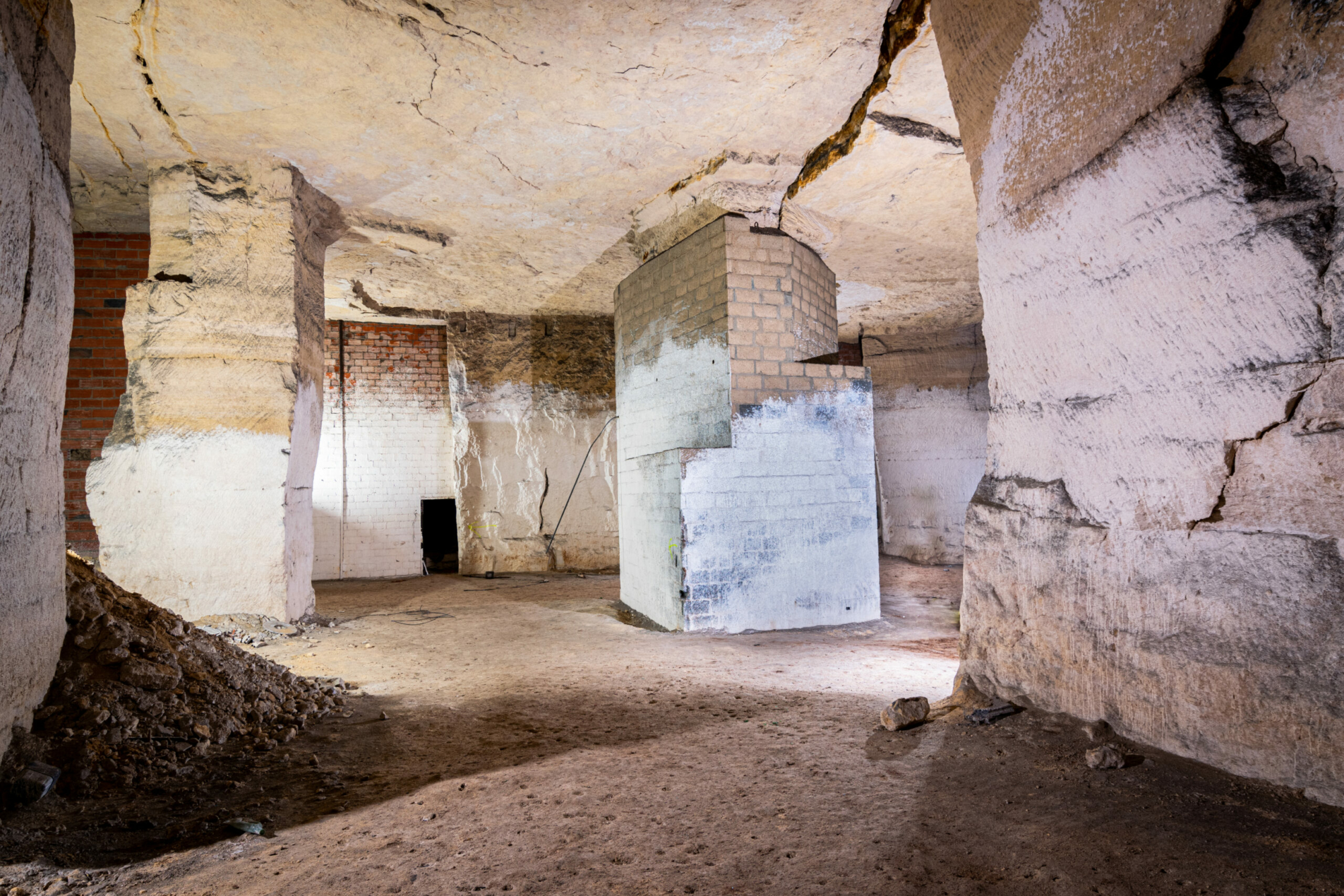 Piliers écaillés dans cette champignonnière. La surexploitation des sols cumulées à la surcharge des terrains de surface font flamber les piliers de masse de la carrière. Déjà très fragilisée par un premier effondrement en 1963 puis un second en 2001. C'est maintenant plus qu'une question de temps avant que cette zone se referme sur elle-même.
