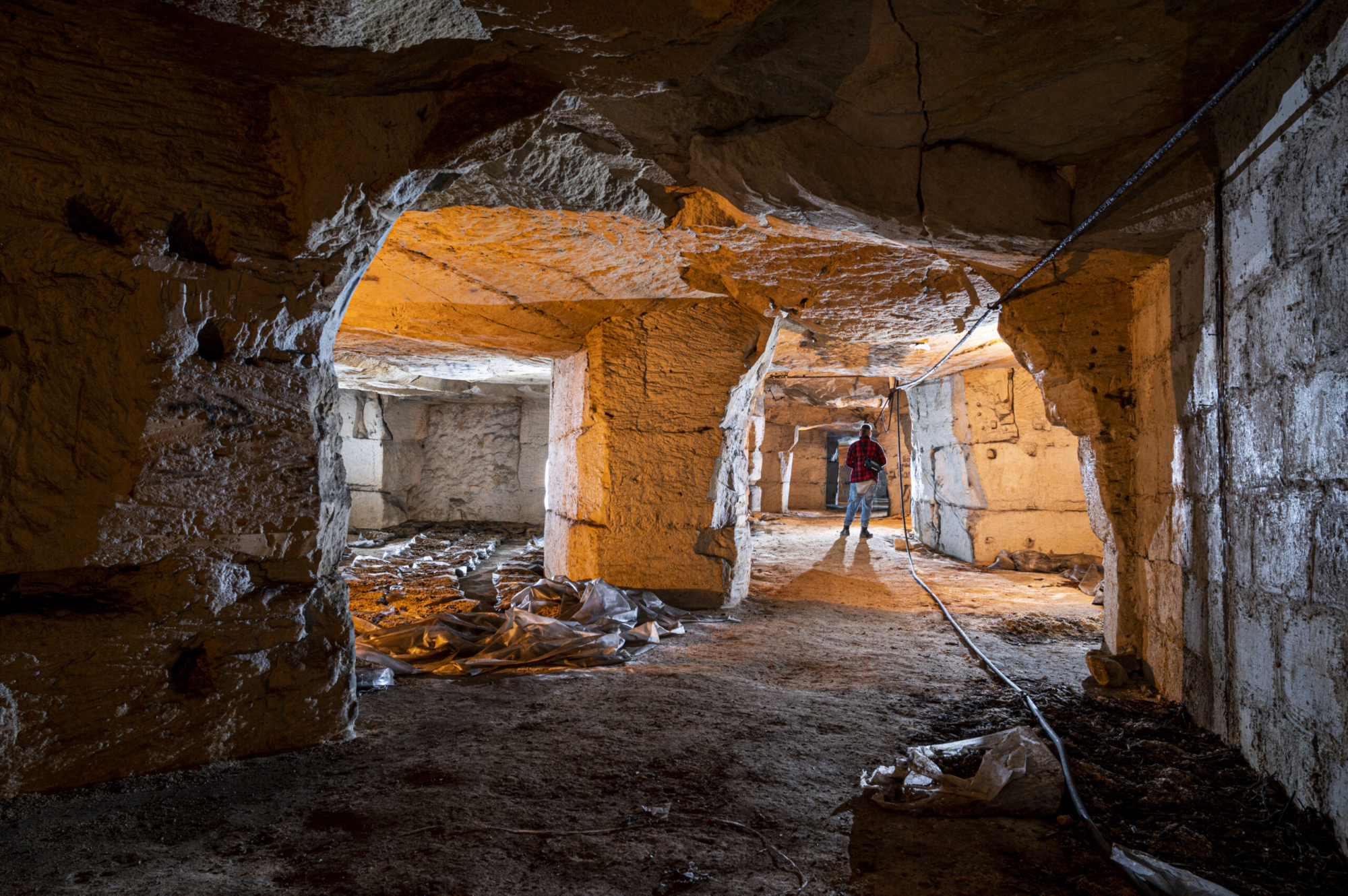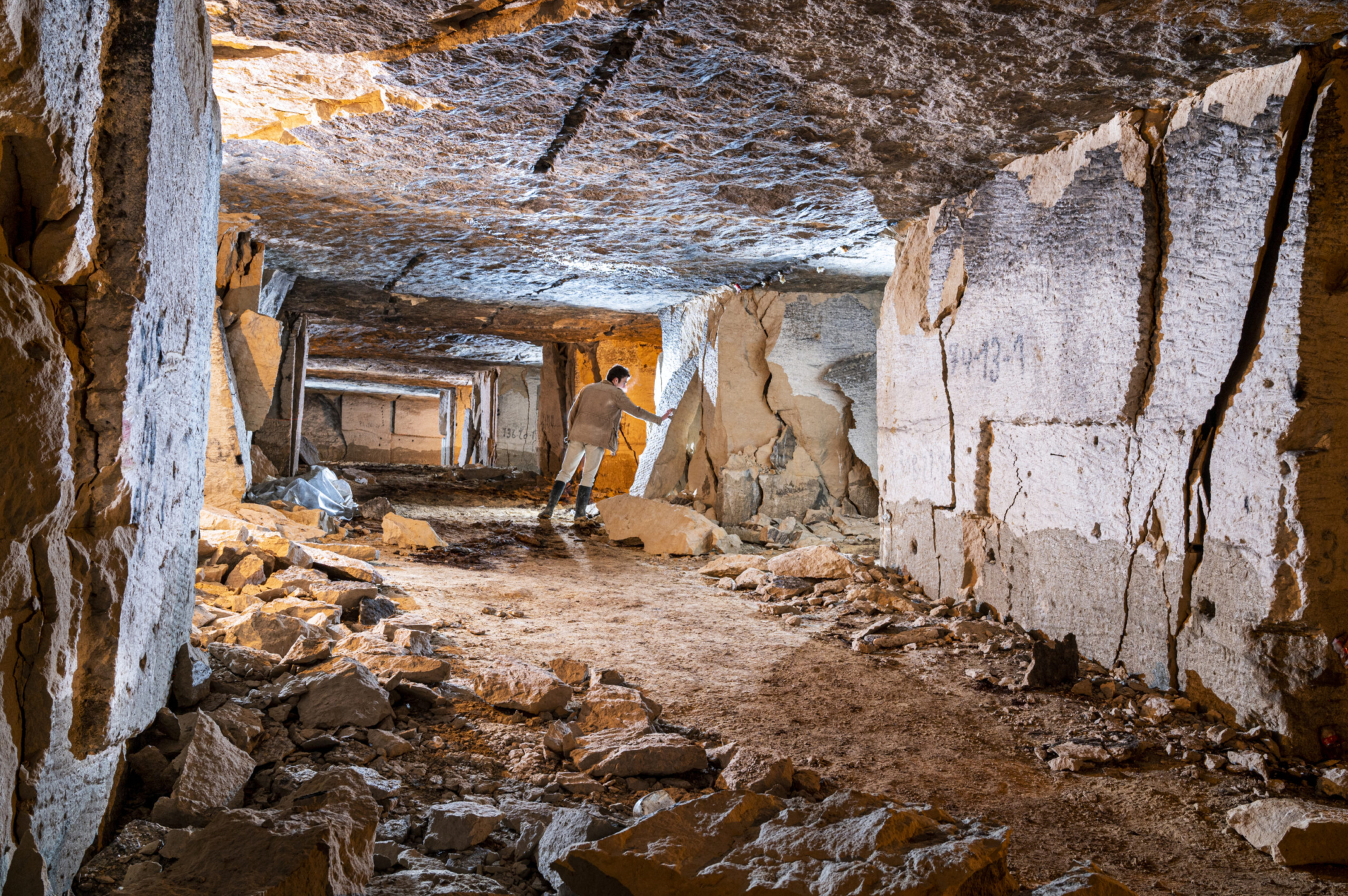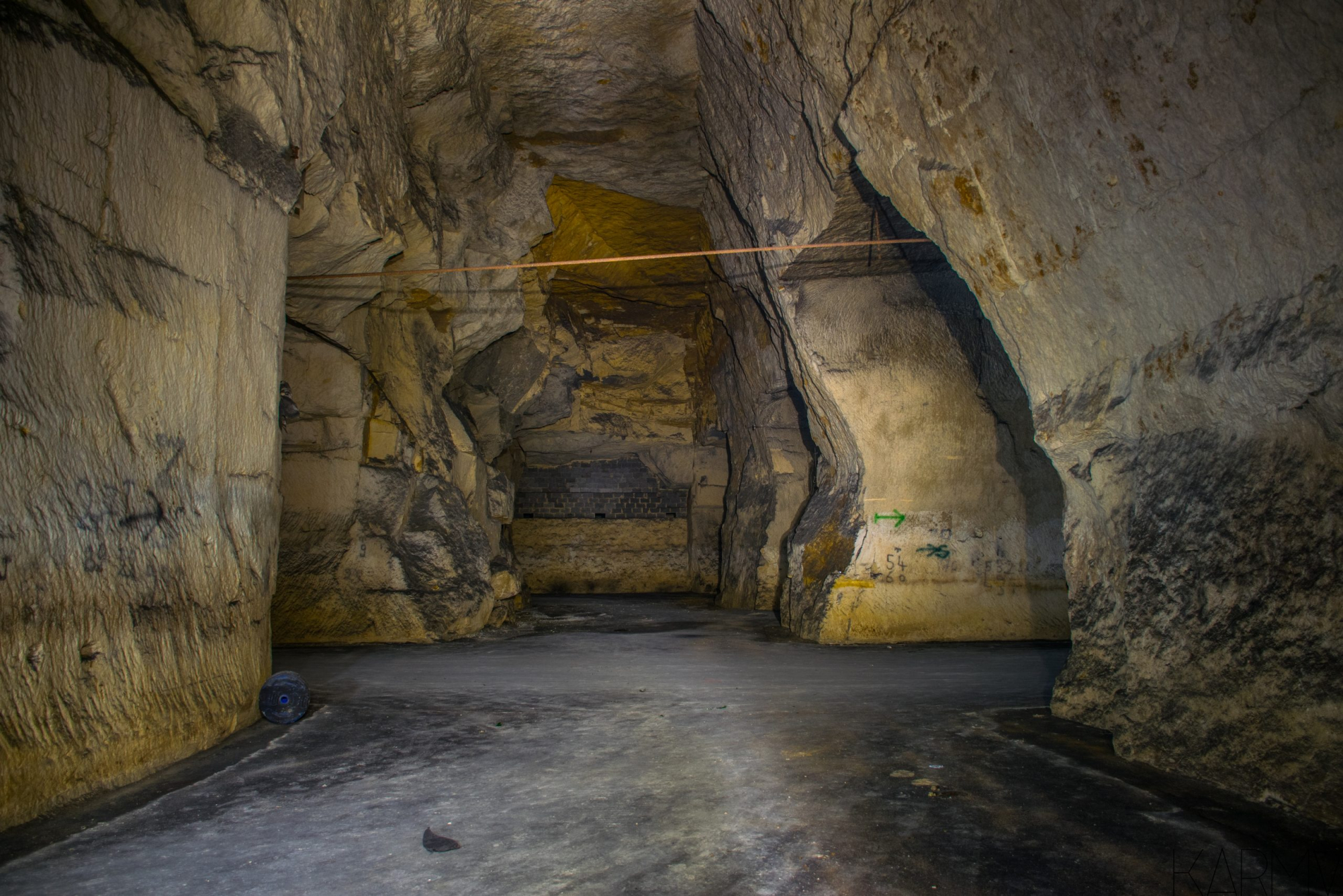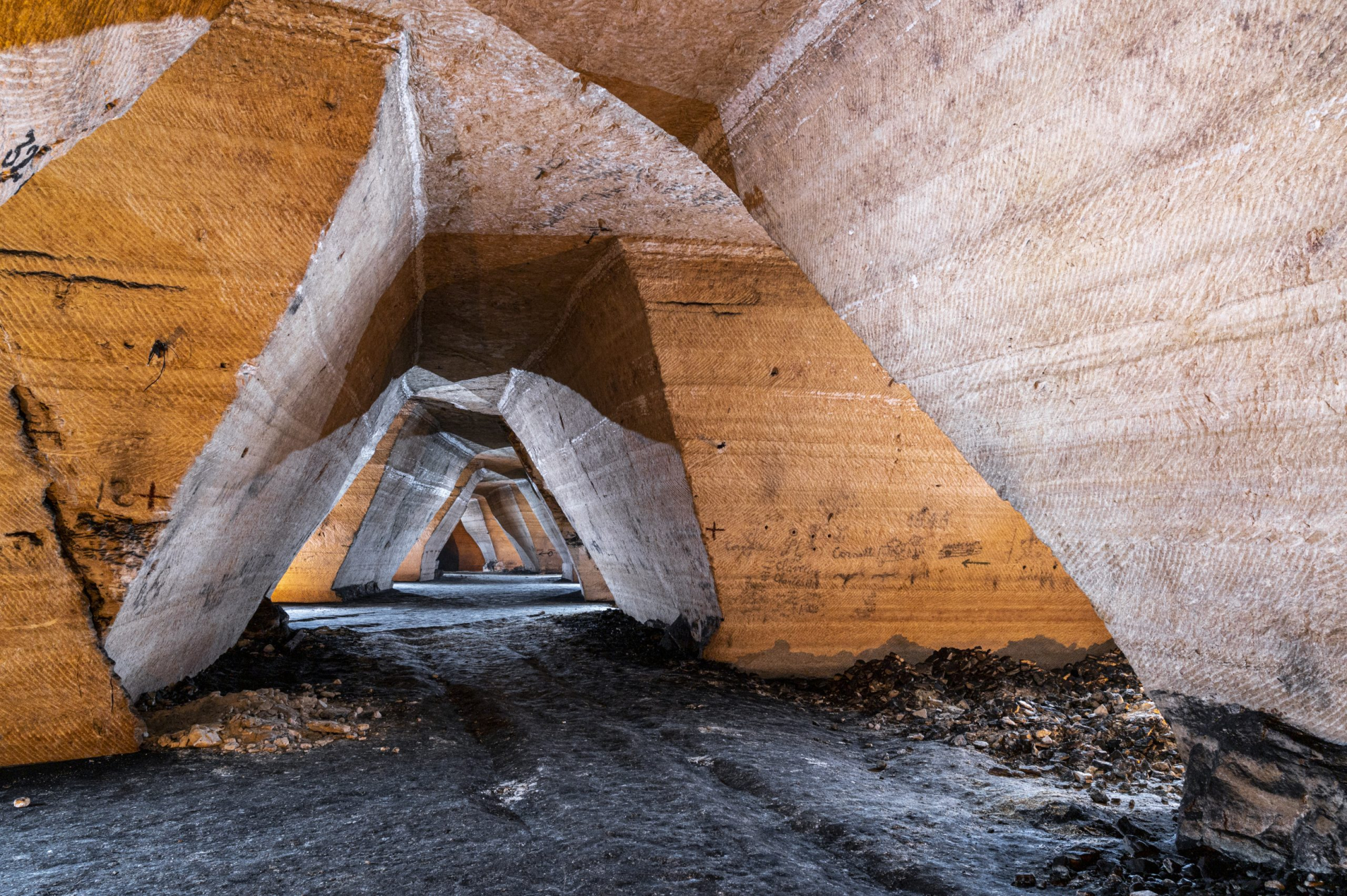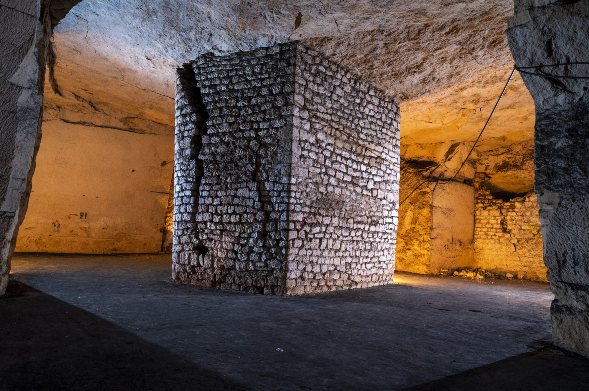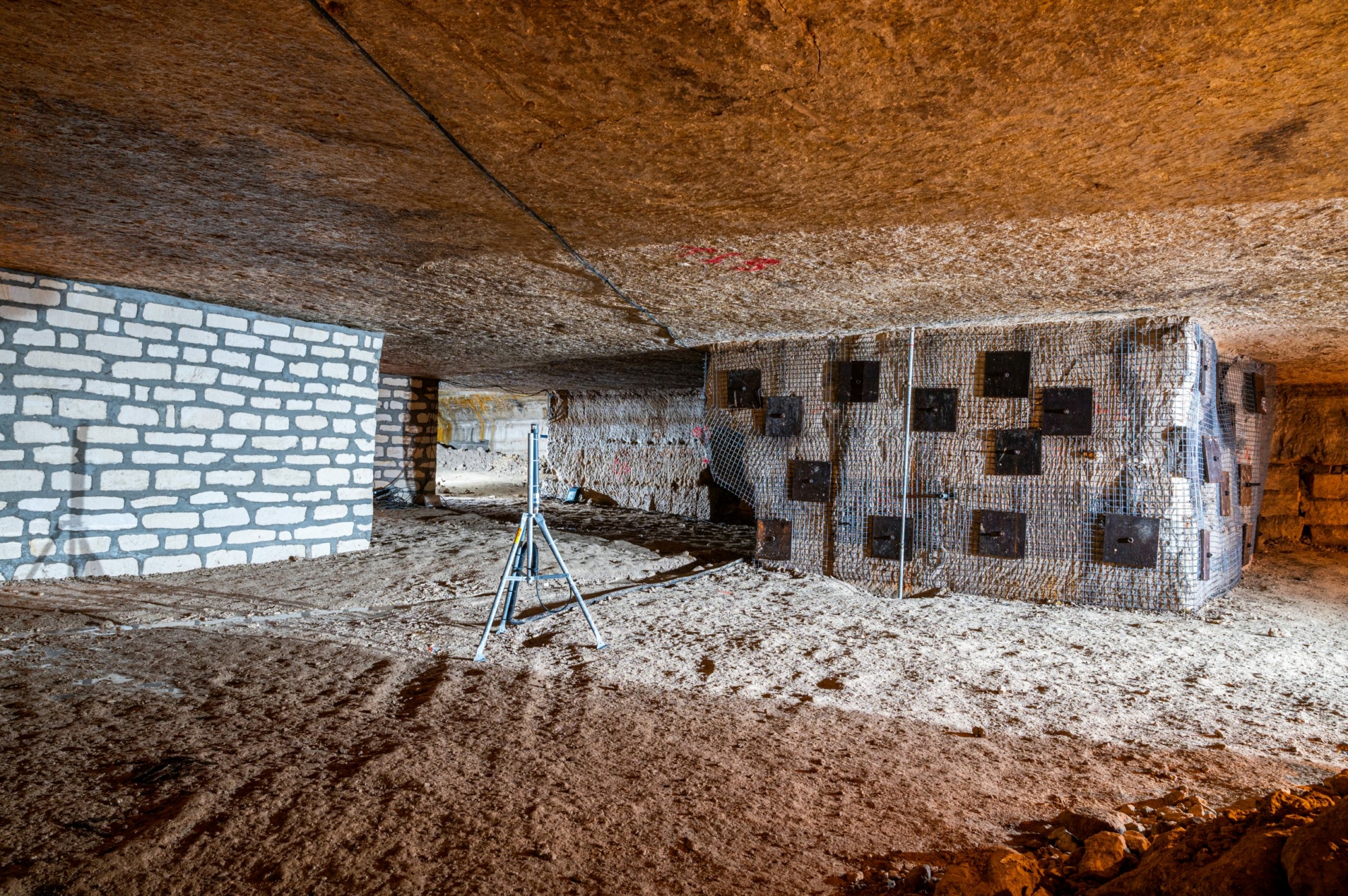 Piliers écaillés dans cette champignonnière. La surexploitation des sols cumulées à la surcharge des terrains de surface font flamber les piliers de masse de la carrière. Déjà très fragilisée par un premier effondrement en 1963 puis un second en 2001. C'est maintenant plus qu'une question de temps avant que cette zone se referme sur elle-même.