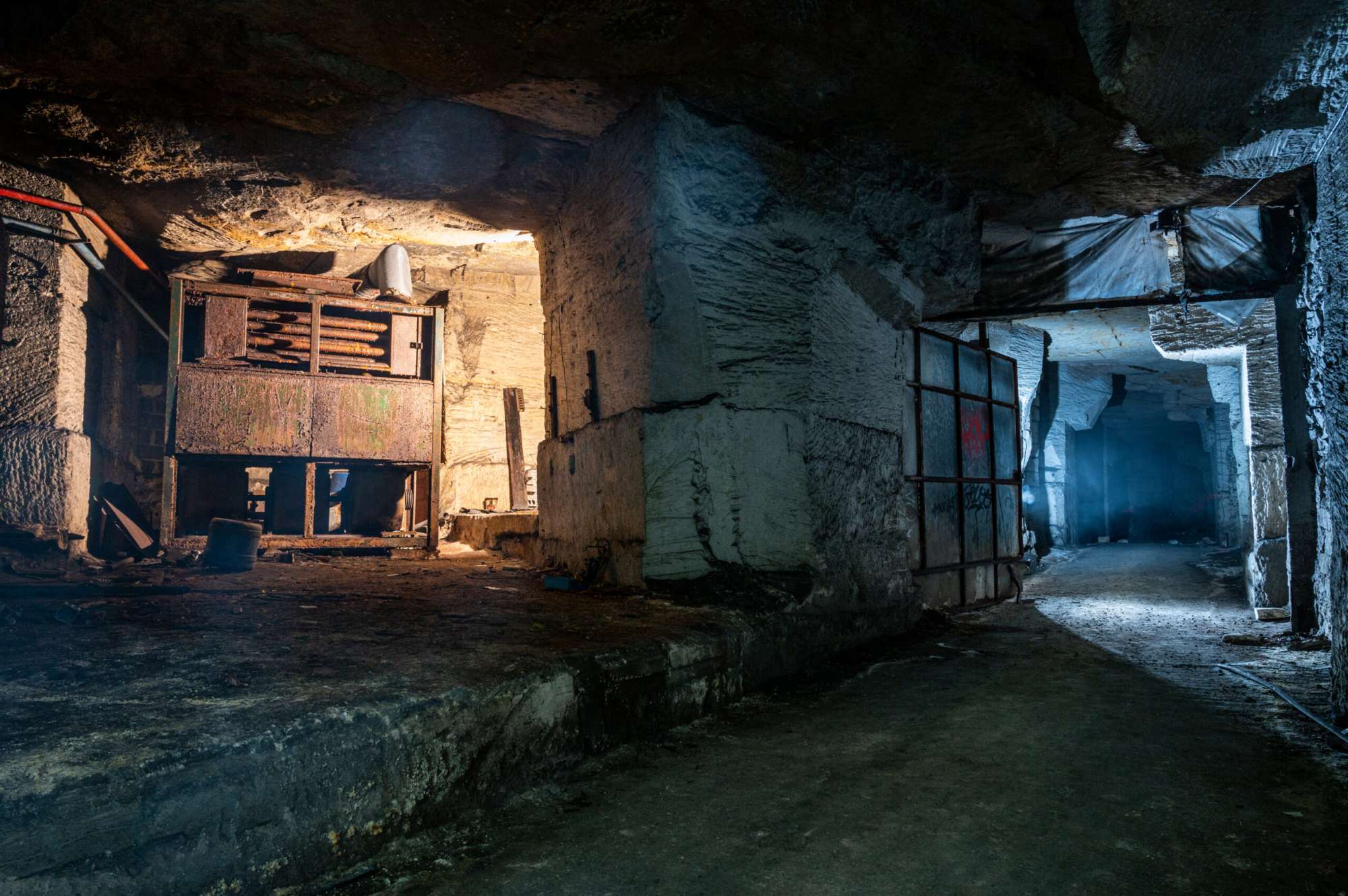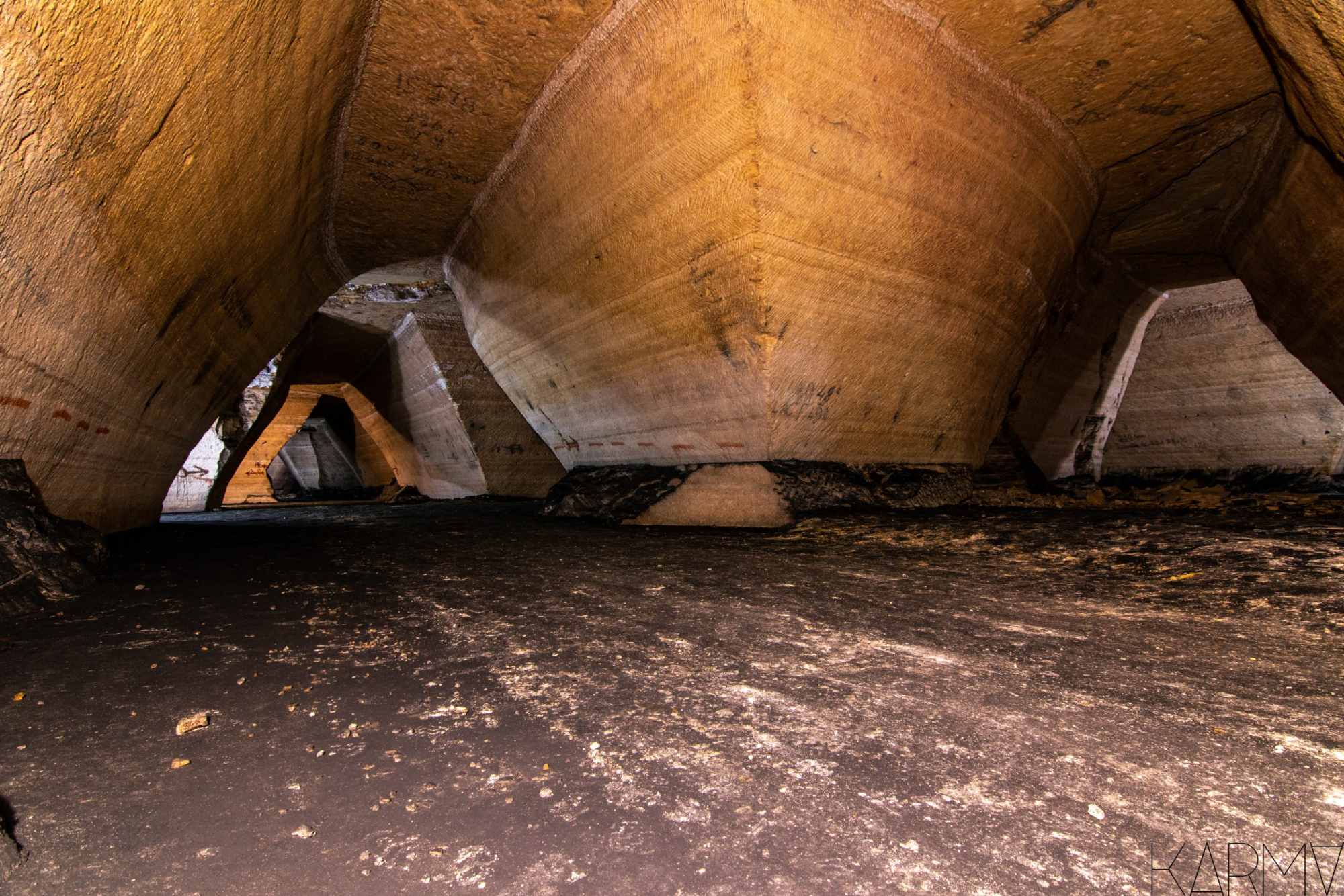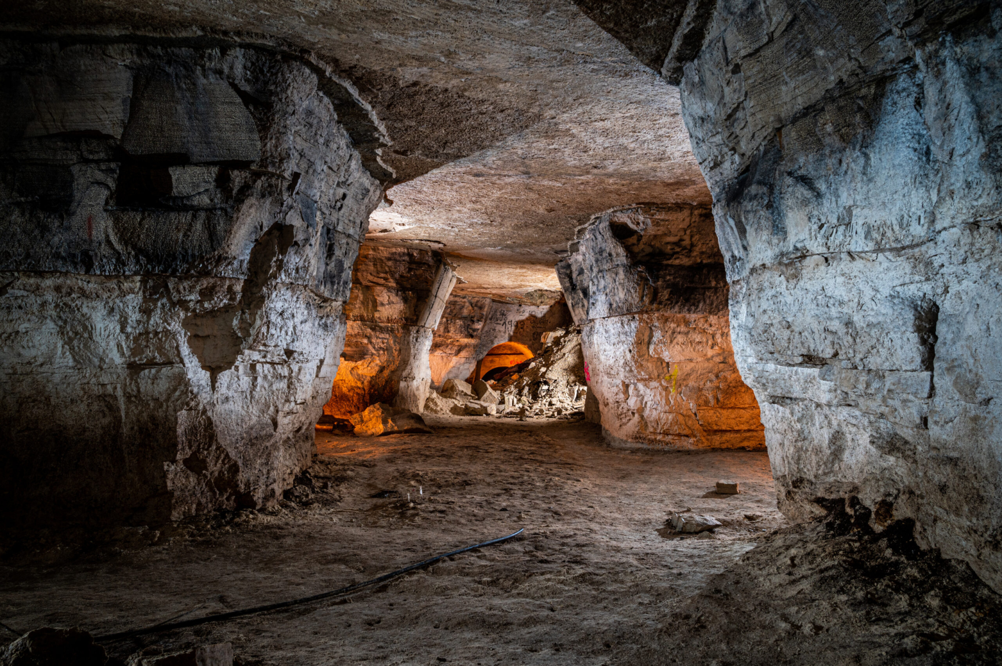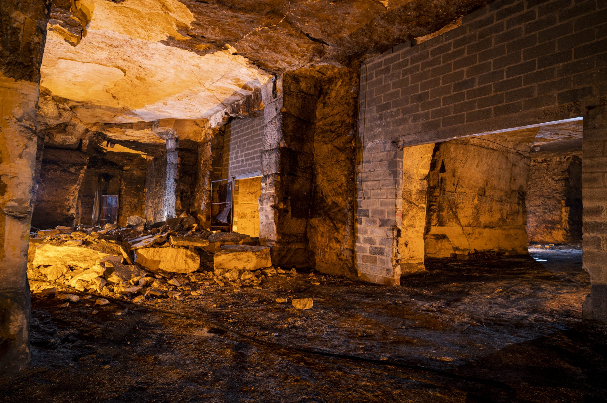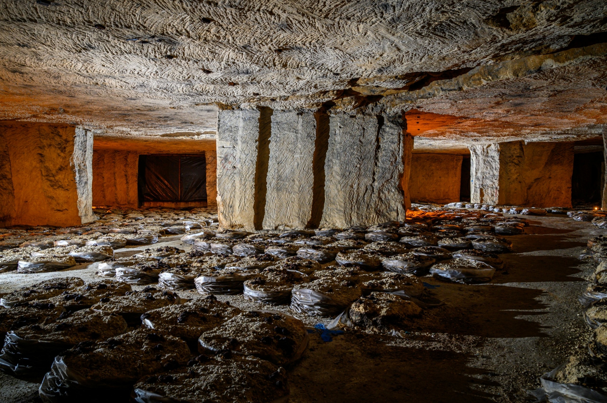 Piliers écaillés dans cette champignonnière. La surexploitation des sols cumulées à la surcharge des terrains de surface font flamber les piliers de masse de la carrière. Déjà très fragilisée par un premier effondrement en 1963 puis un second en 2001. C'est maintenant plus qu'une question de temps avant que cette zone se referme sur elle-même.