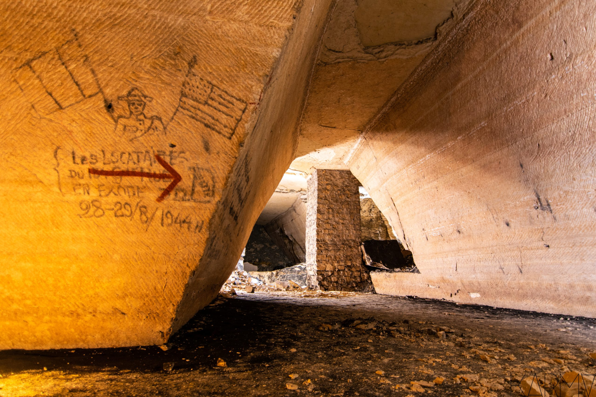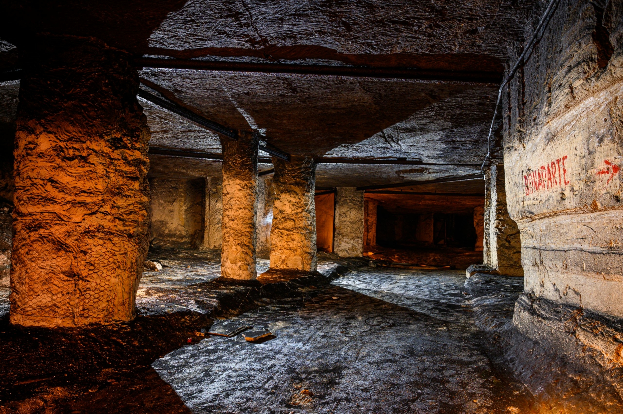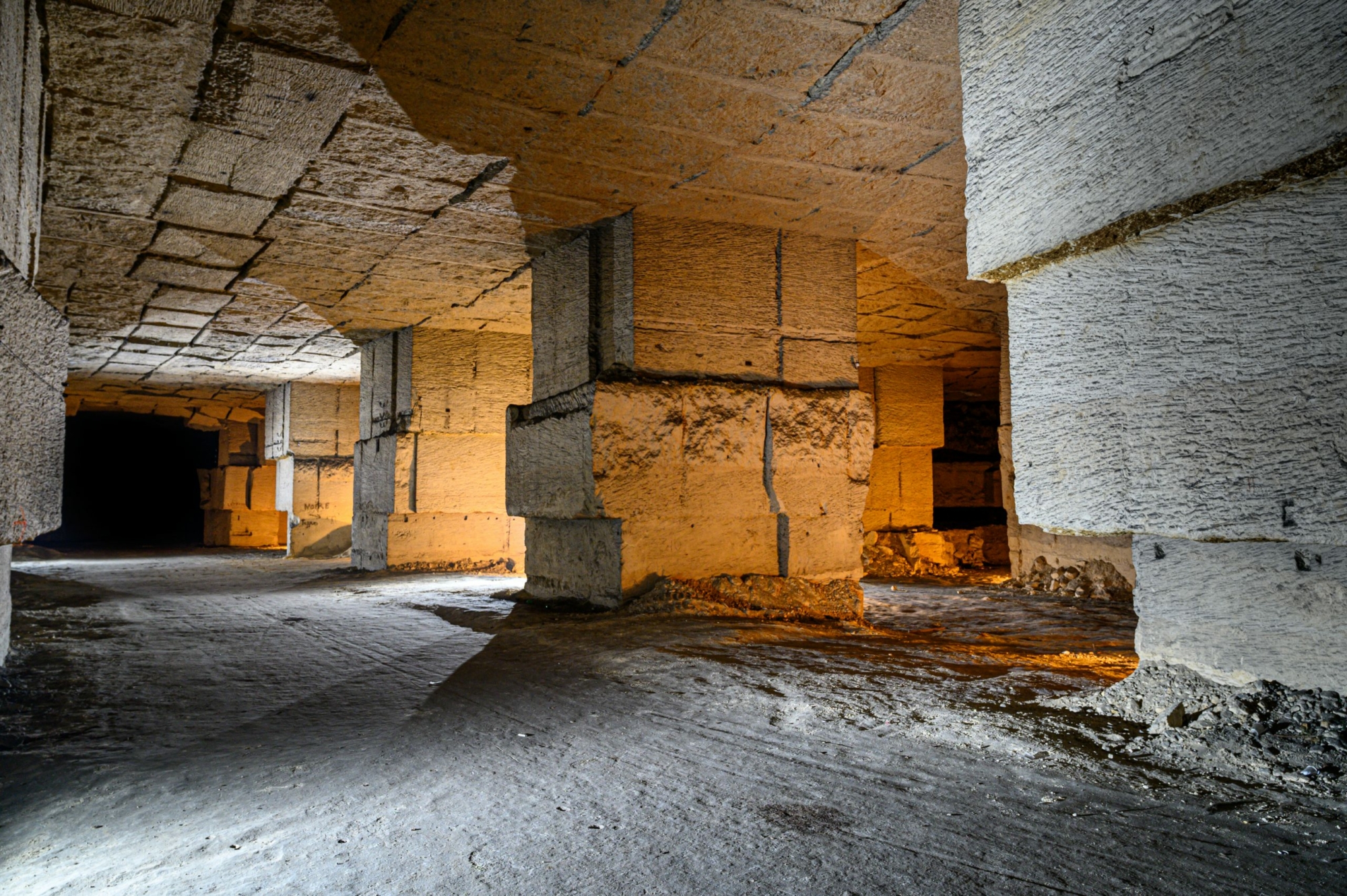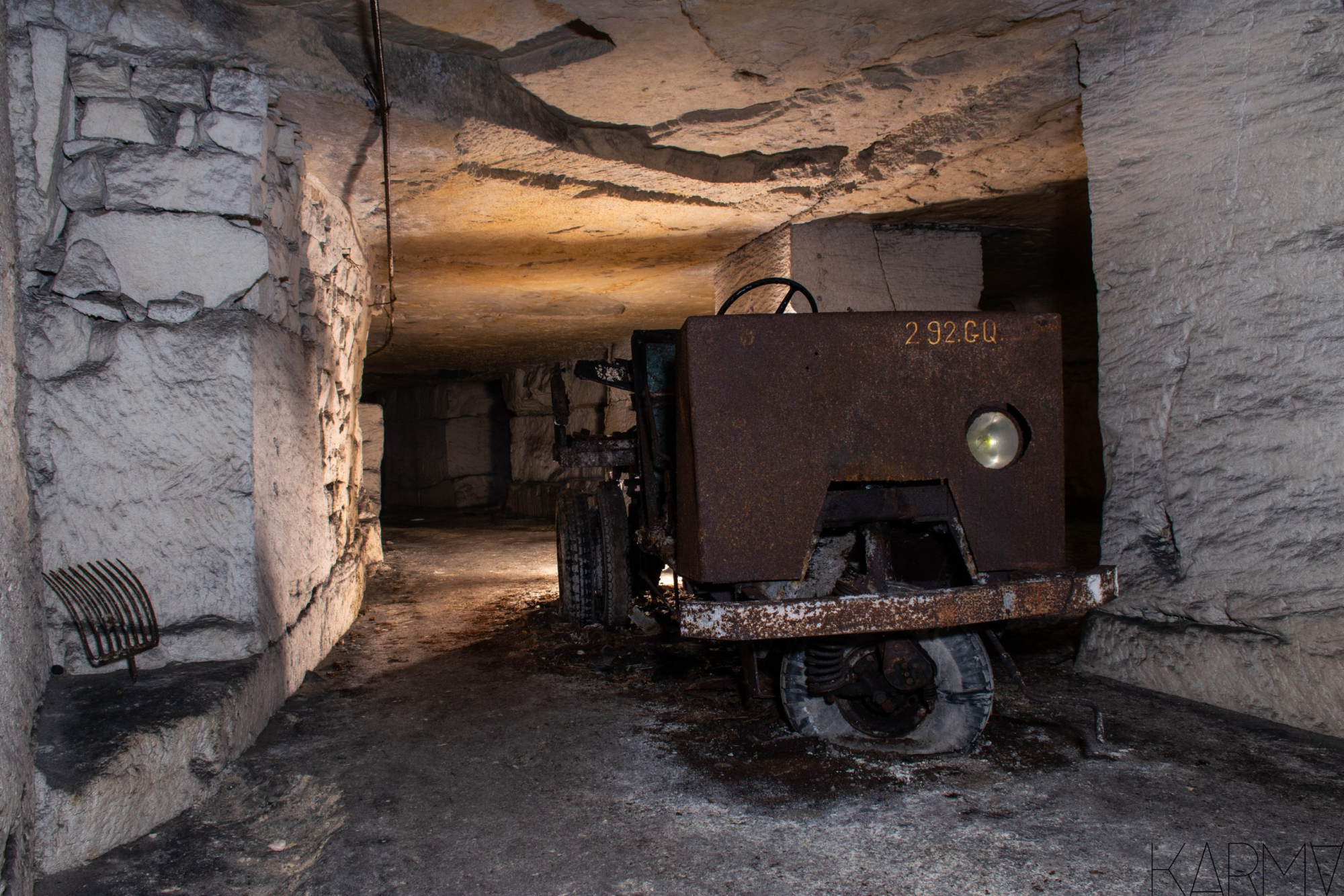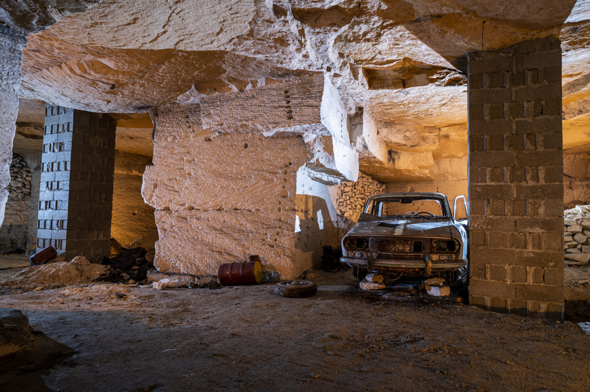 Piliers écaillés dans cette champignonnière. La surexploitation des sols cumulées à la surcharge des terrains de surface font flamber les piliers de masse de la carrière. Déjà très fragilisée par un premier effondrement en 1963 puis un second en 2001. C'est maintenant plus qu'une question de temps avant que cette zone se referme sur elle-même.