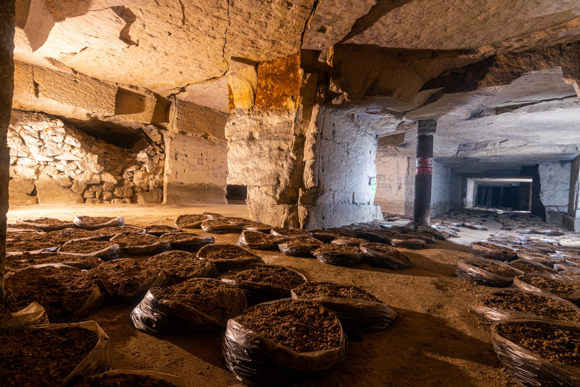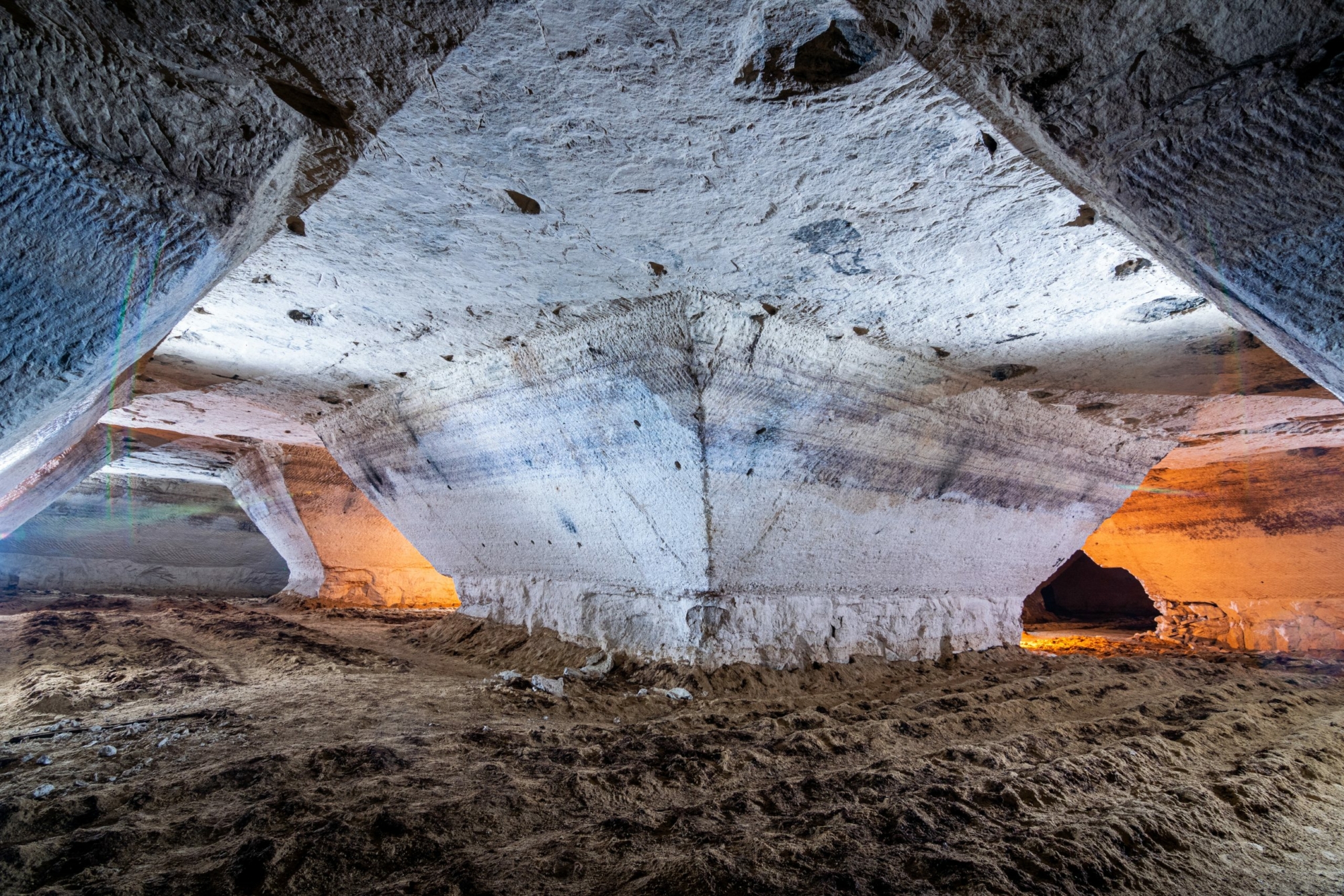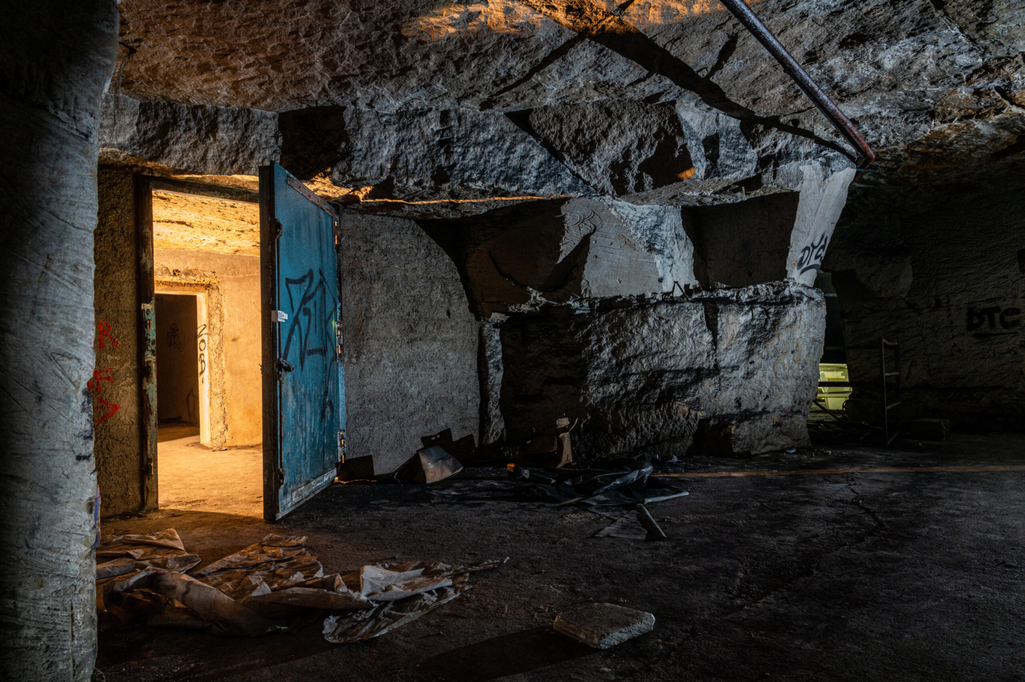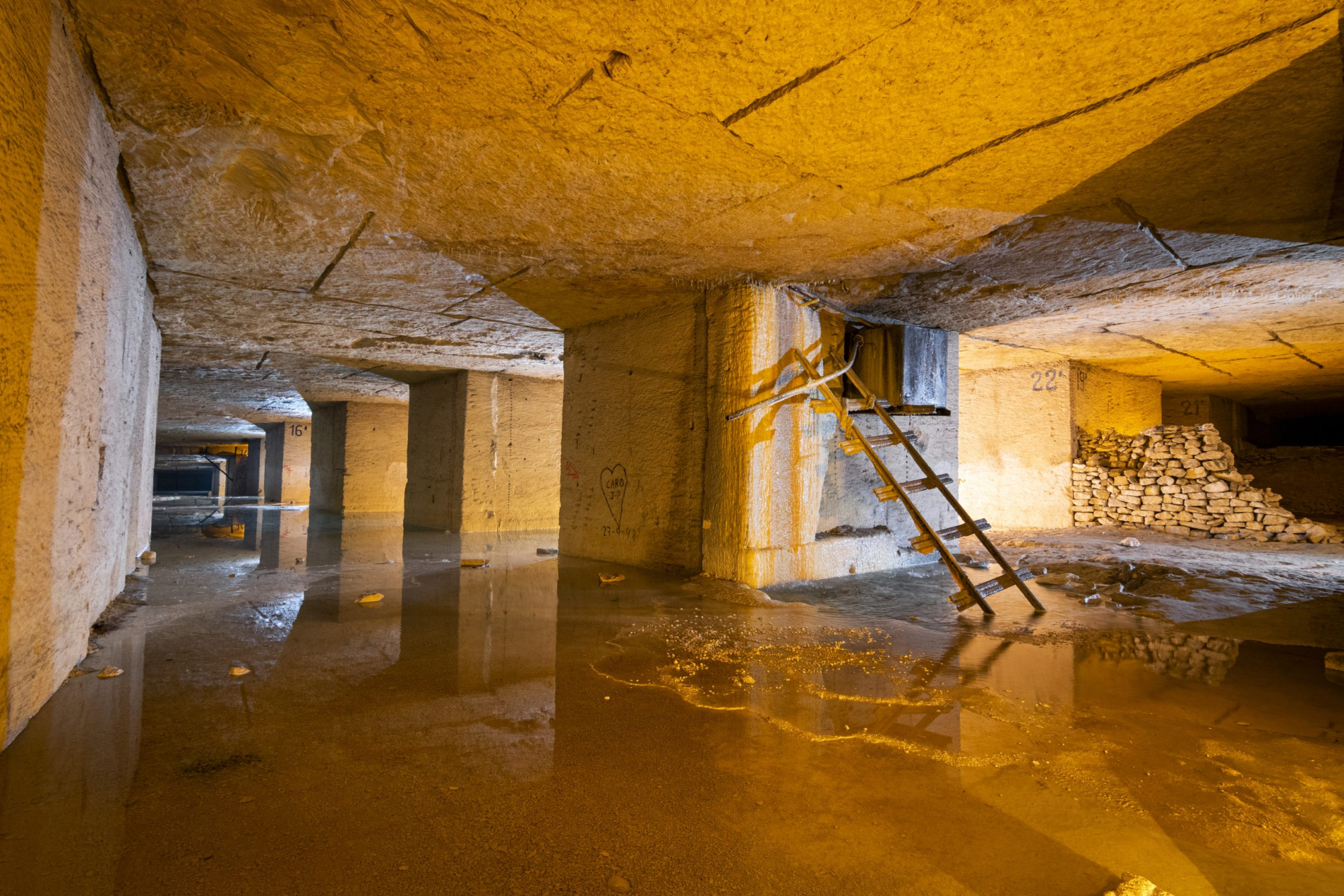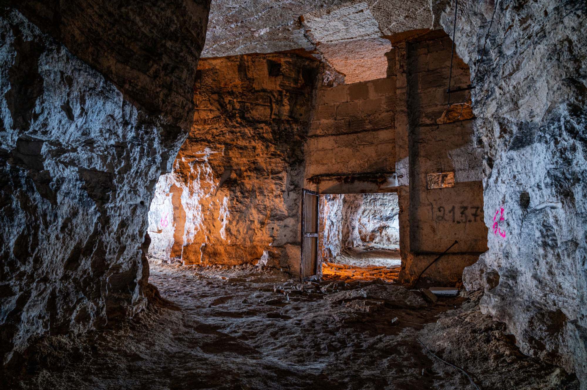 Piliers écaillés dans cette champignonnière. La surexploitation des sols cumulées à la surcharge des terrains de surface font flamber les piliers de masse de la carrière. Déjà très fragilisée par un premier effondrement en 1963 puis un second en 2001. C'est maintenant plus qu'une question de temps avant que cette zone se referme sur elle-même.