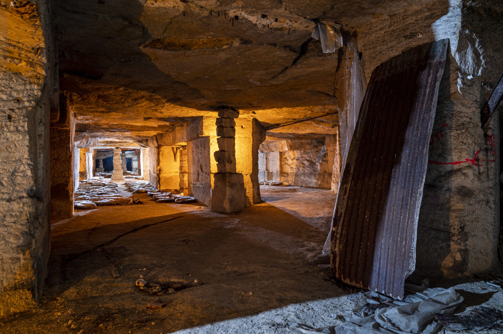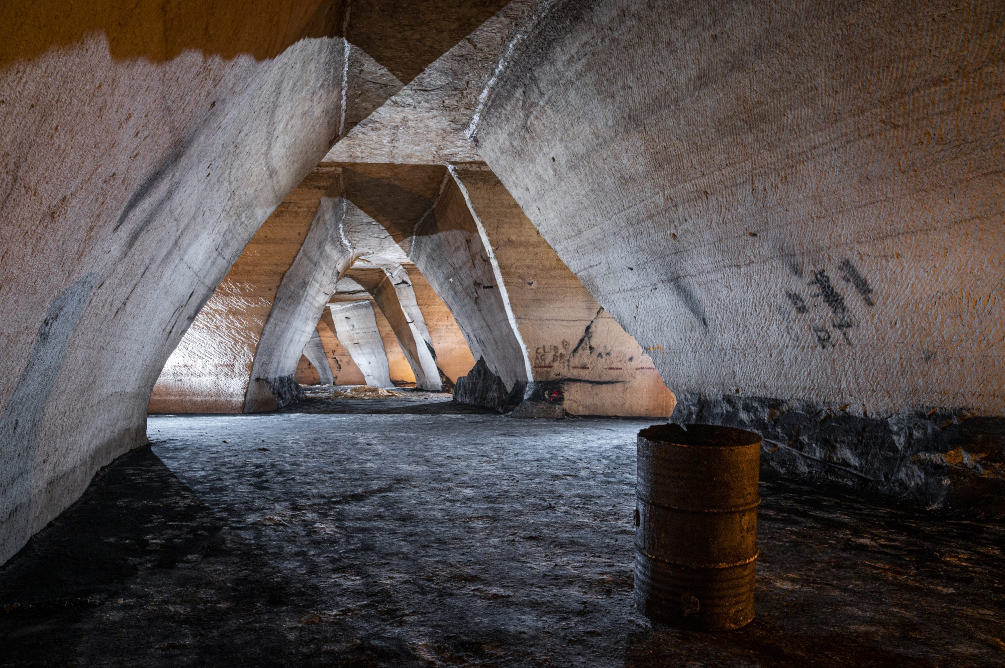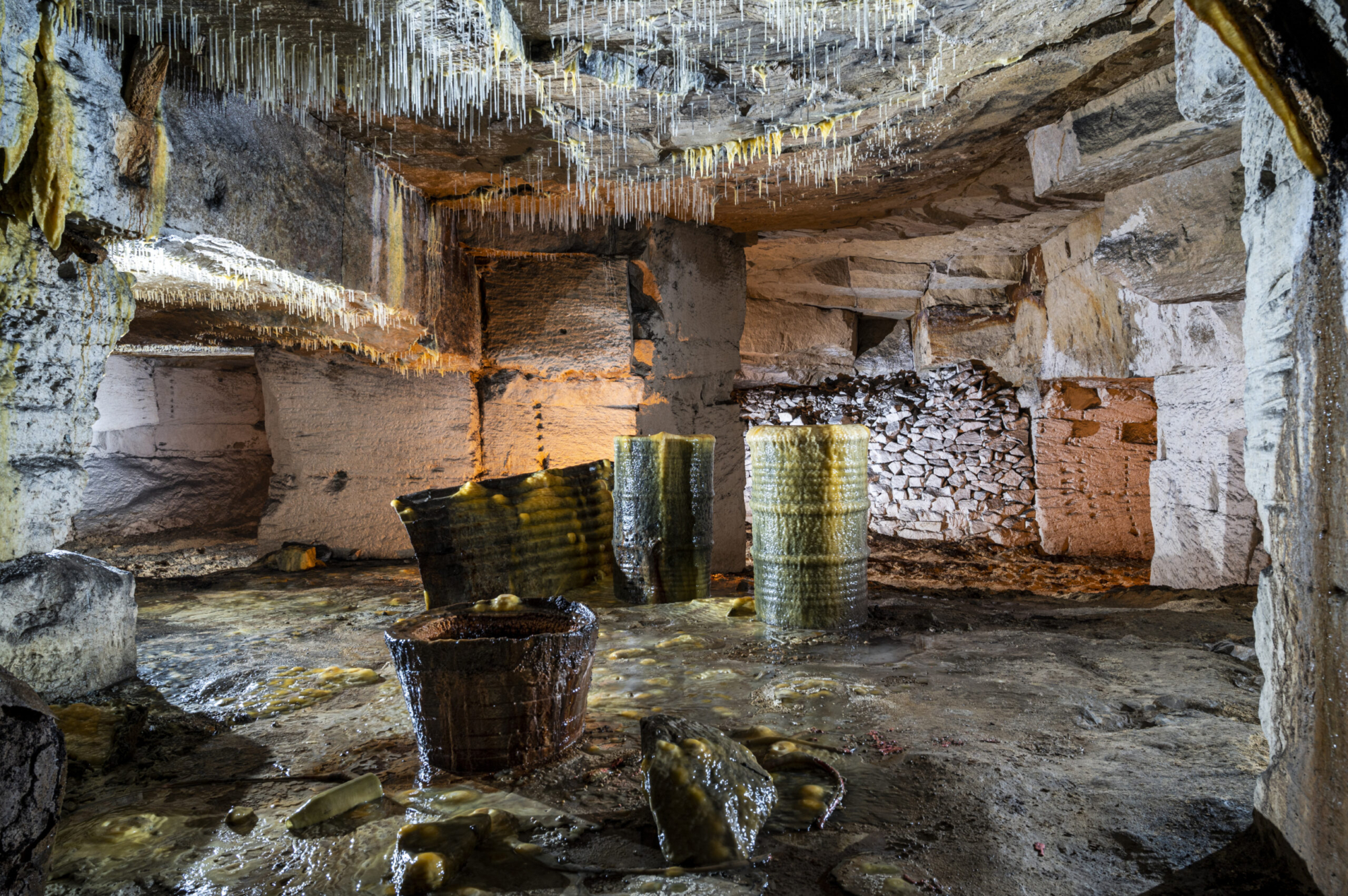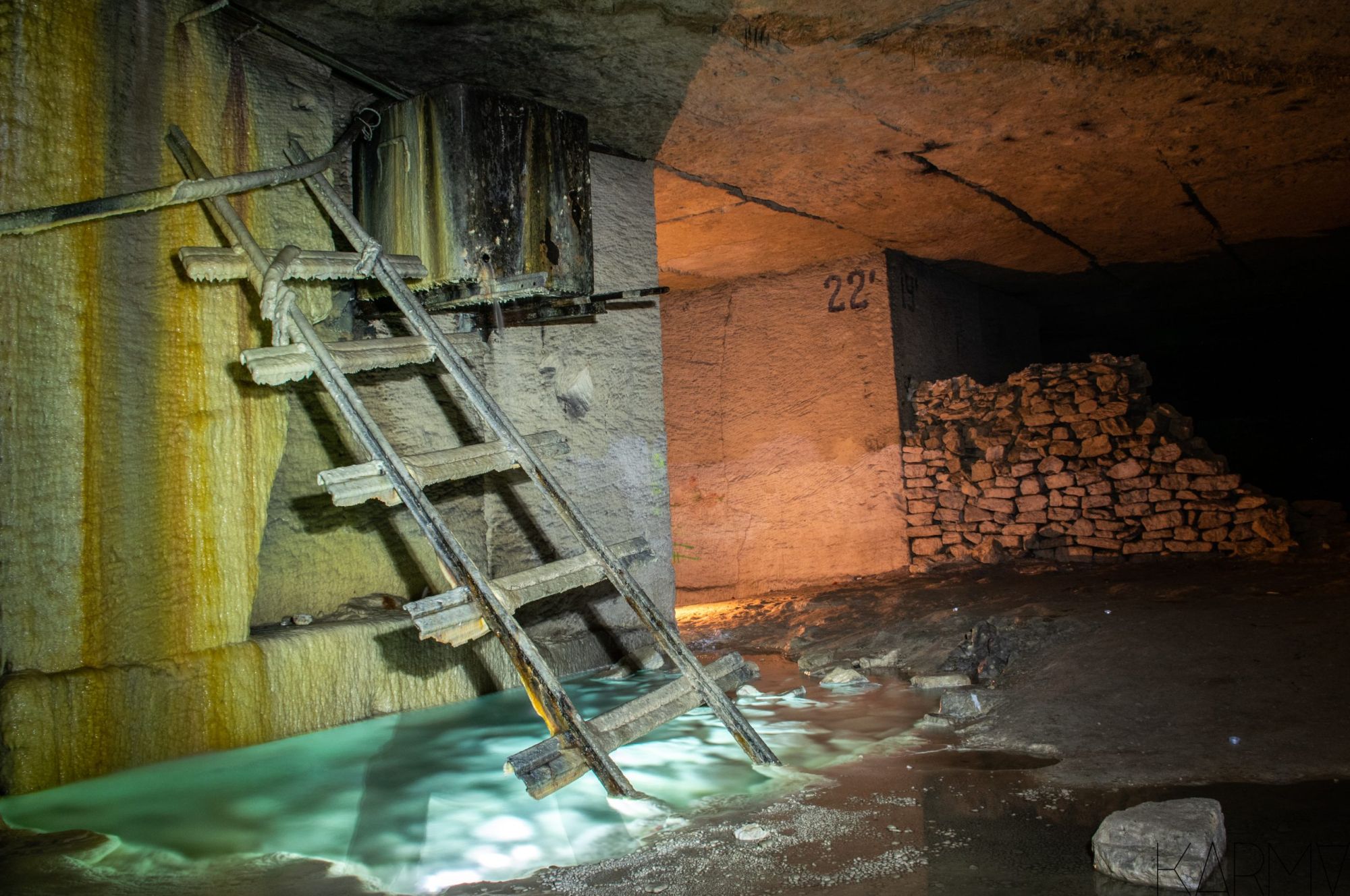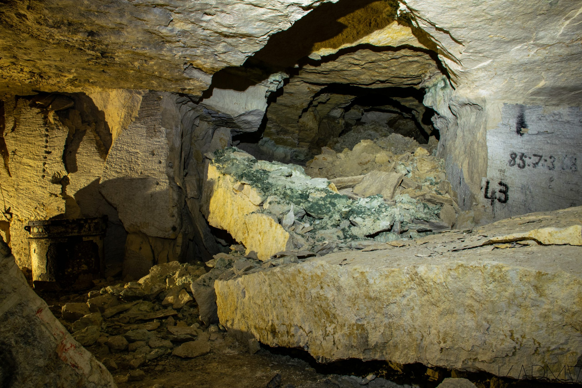 Piliers écaillés dans cette champignonnière. La surexploitation des sols cumulées à la surcharge des terrains de surface font flamber les piliers de masse de la carrière. Déjà très fragilisée par un premier effondrement en 1963 puis un second en 2001. C'est maintenant plus qu'une question de temps avant que cette zone se referme sur elle-même.
