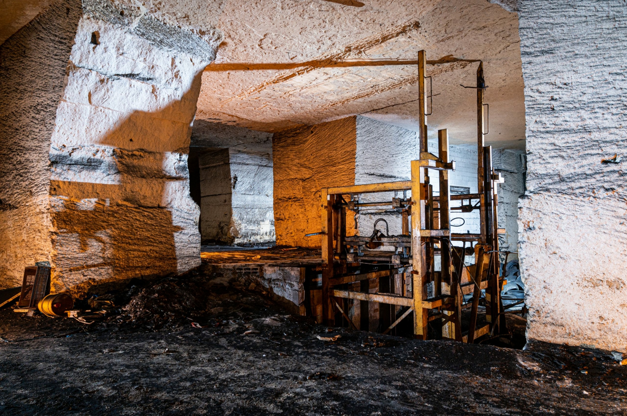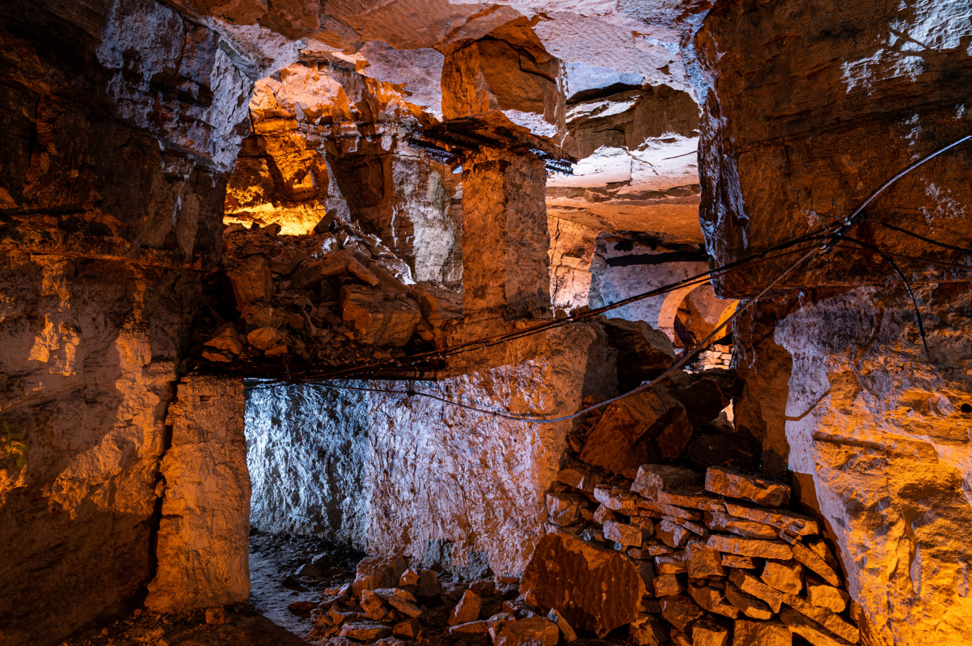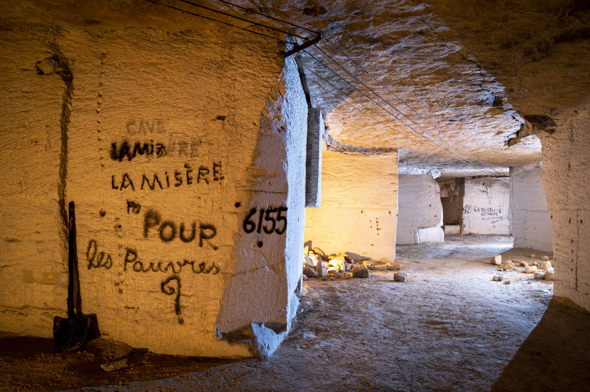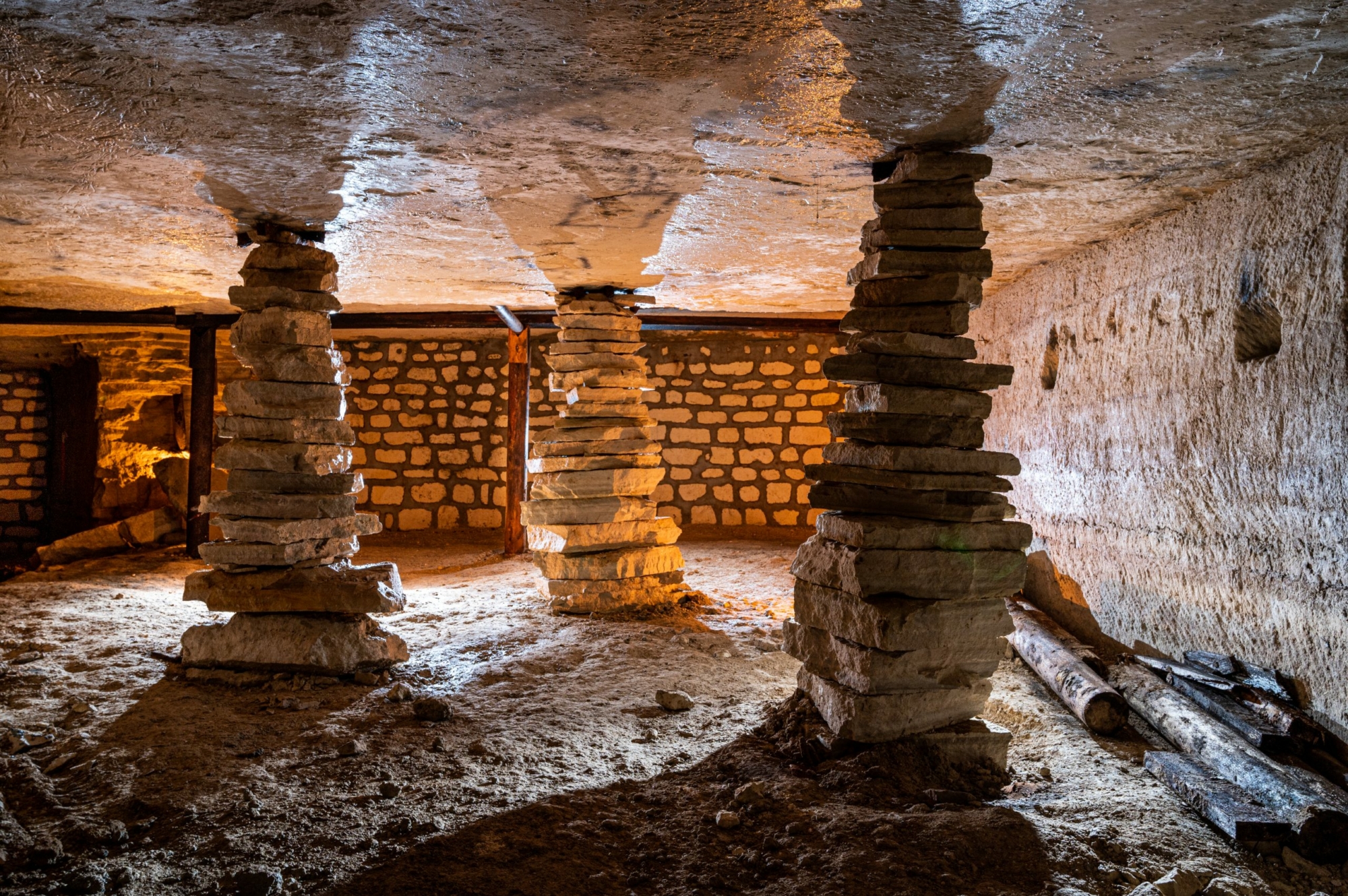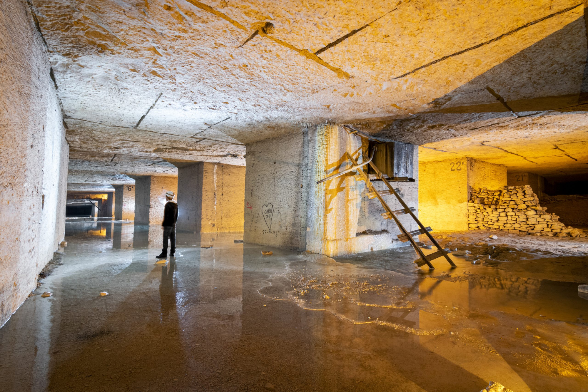 Piliers écaillés dans cette champignonnière. La surexploitation des sols cumulées à la surcharge des terrains de surface font flamber les piliers de masse de la carrière. Déjà très fragilisée par un premier effondrement en 1963 puis un second en 2001. C'est maintenant plus qu'une question de temps avant que cette zone se referme sur elle-même.