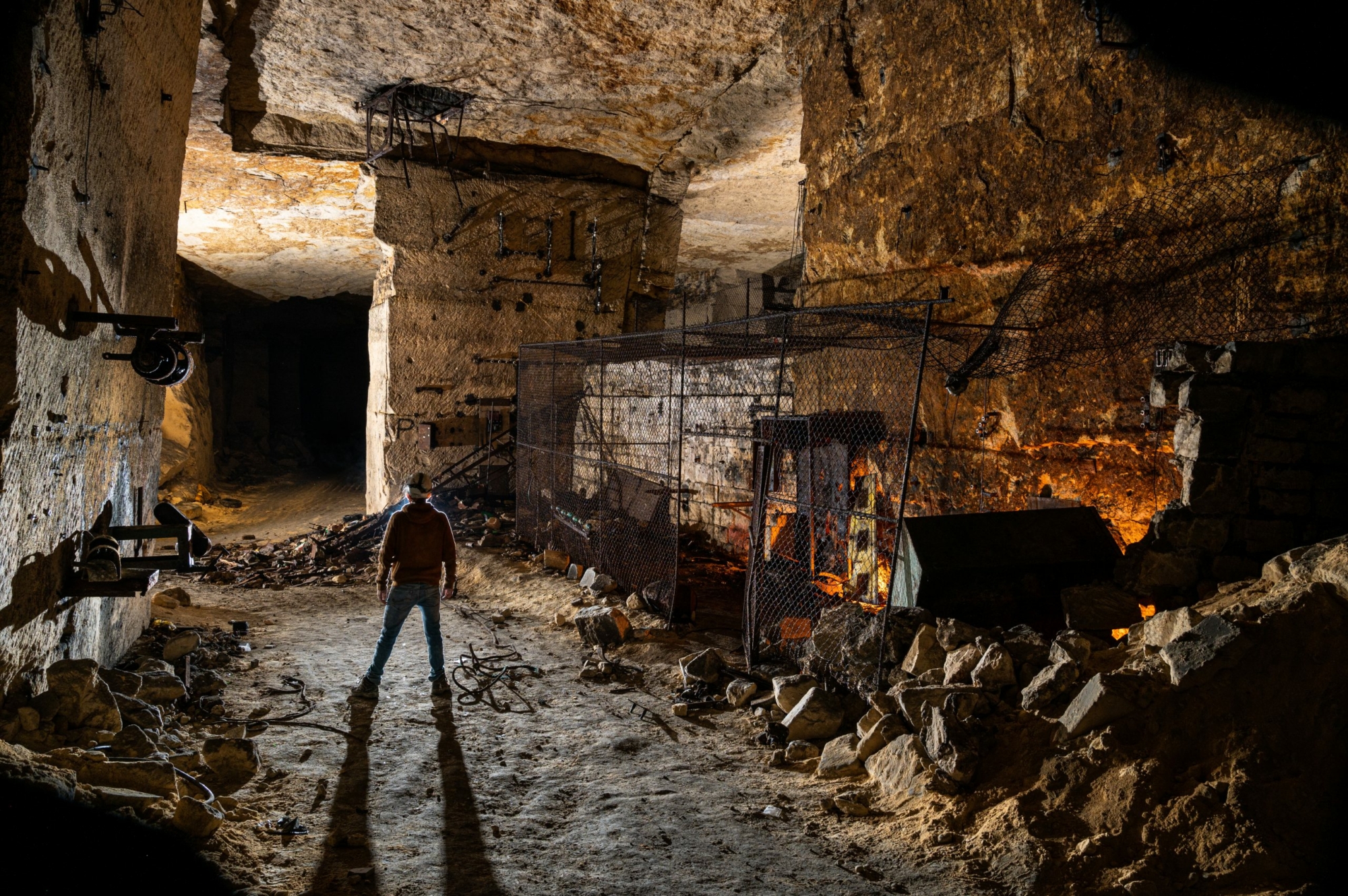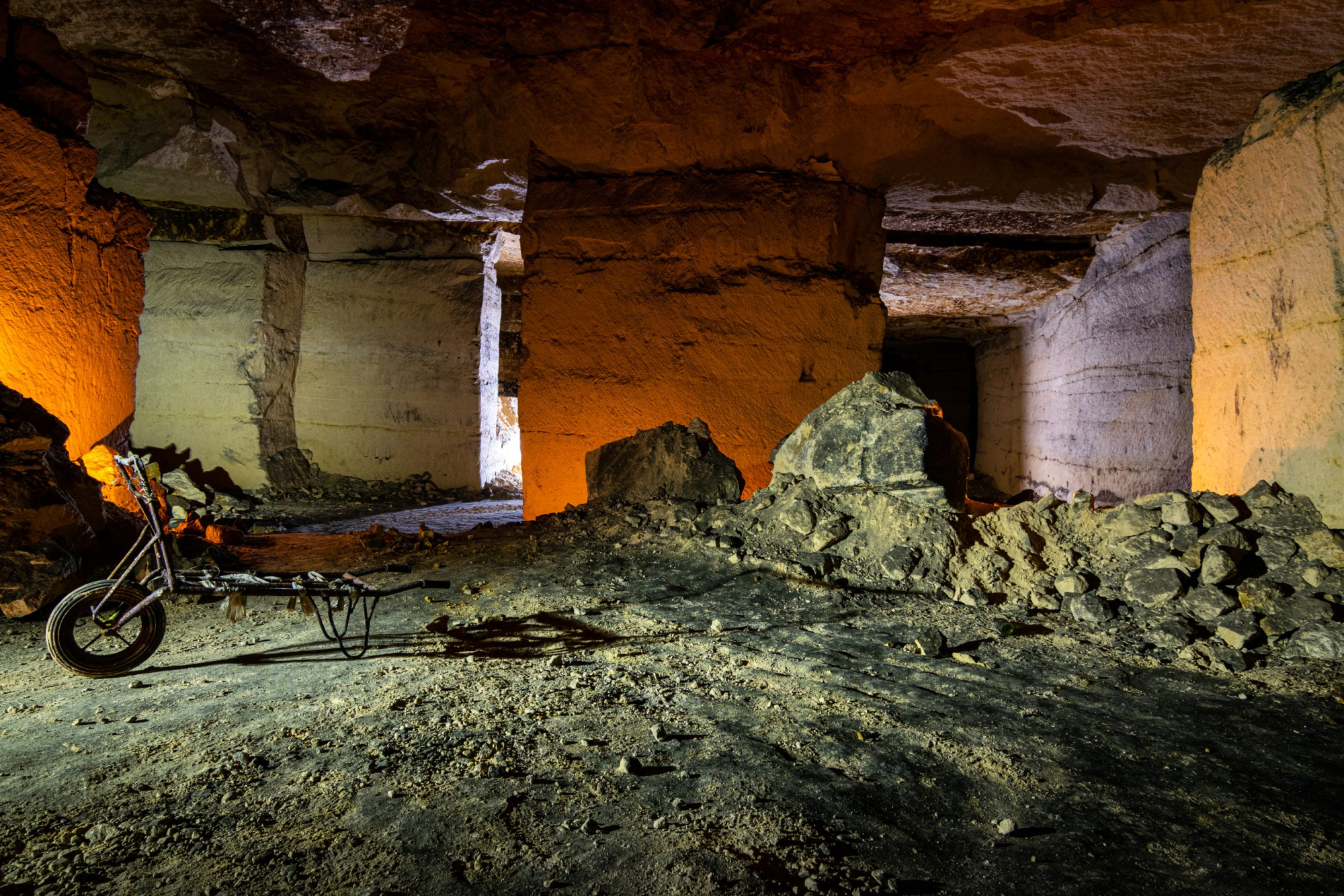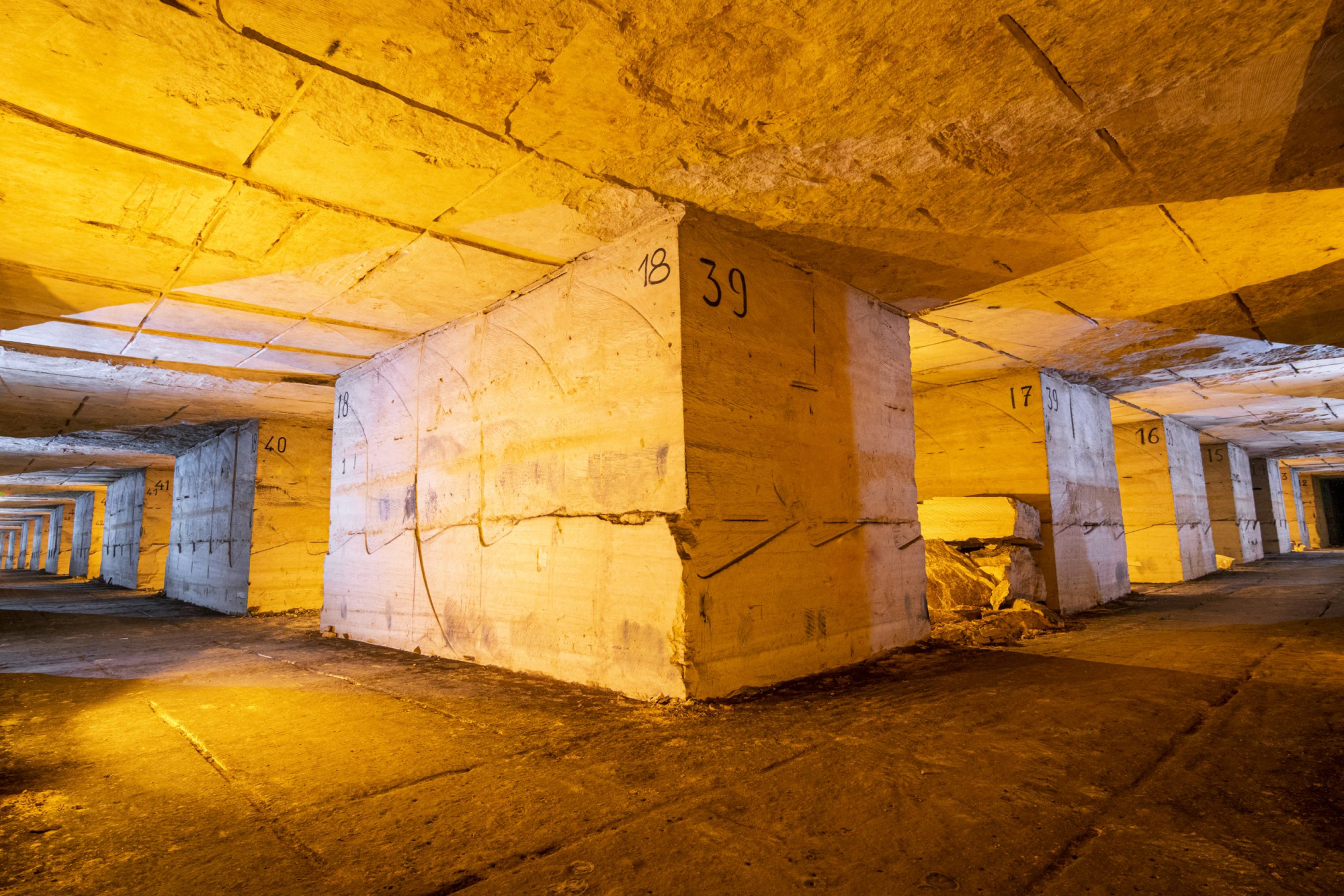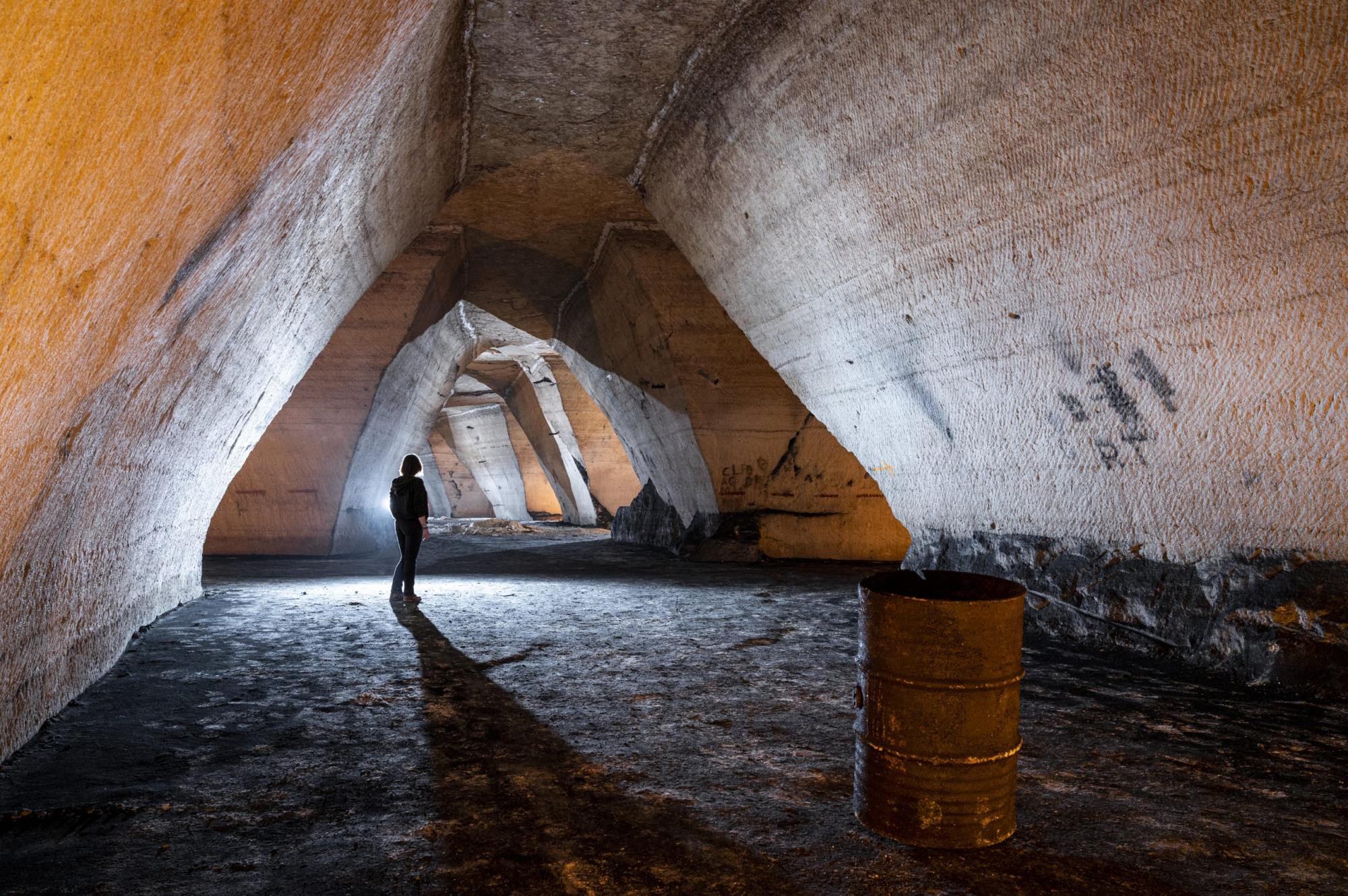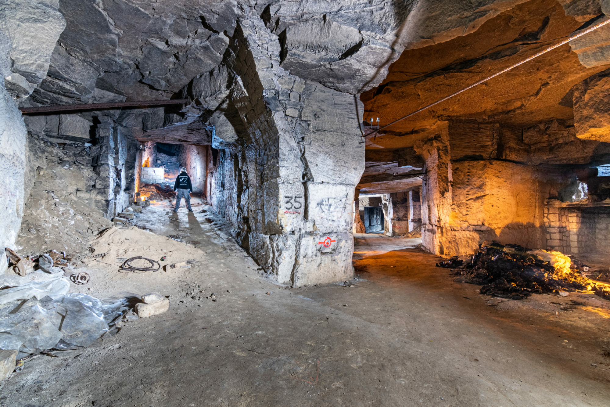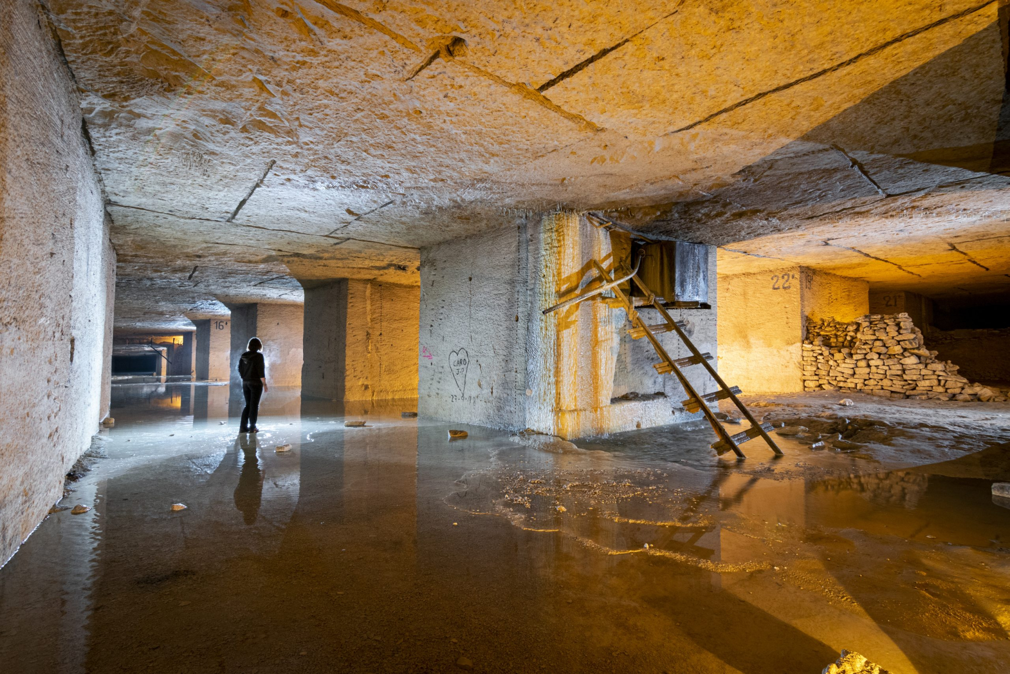 Piliers écaillés dans cette champignonnière. La surexploitation des sols cumulées à la surcharge des terrains de surface font flamber les piliers de masse de la carrière. Déjà très fragilisée par un premier effondrement en 1963 puis un second en 2001. C'est maintenant plus qu'une question de temps avant que cette zone se referme sur elle-même.