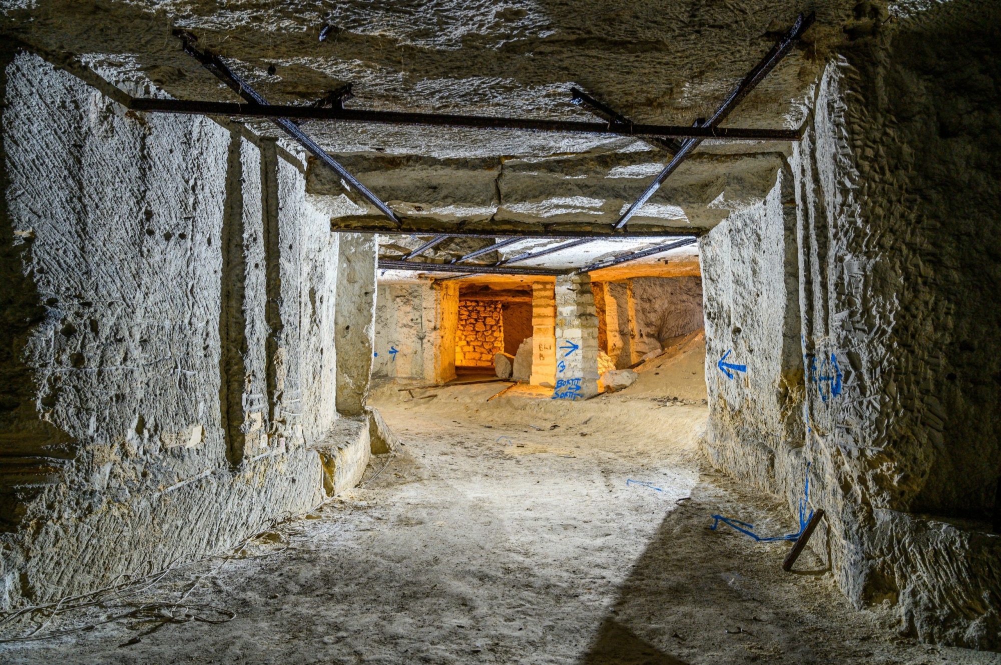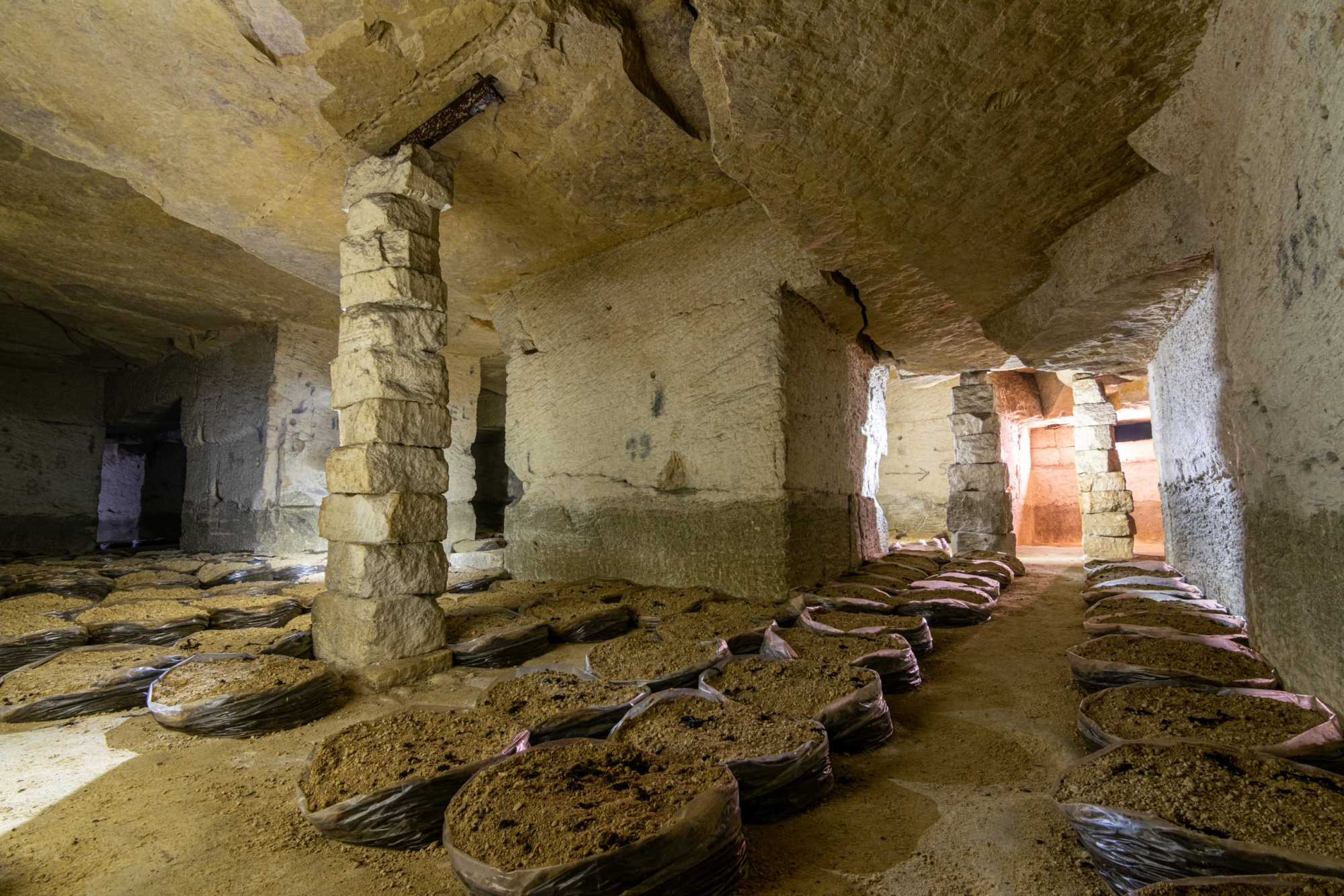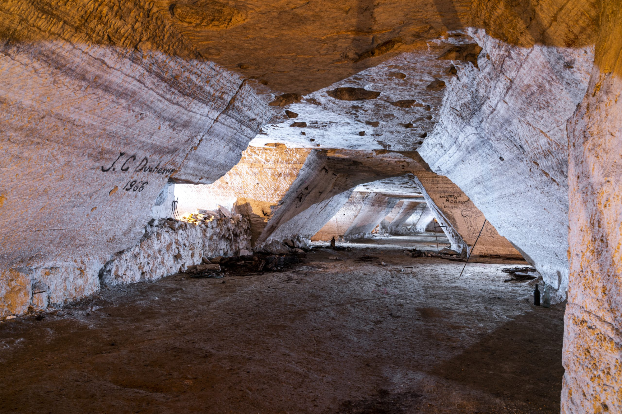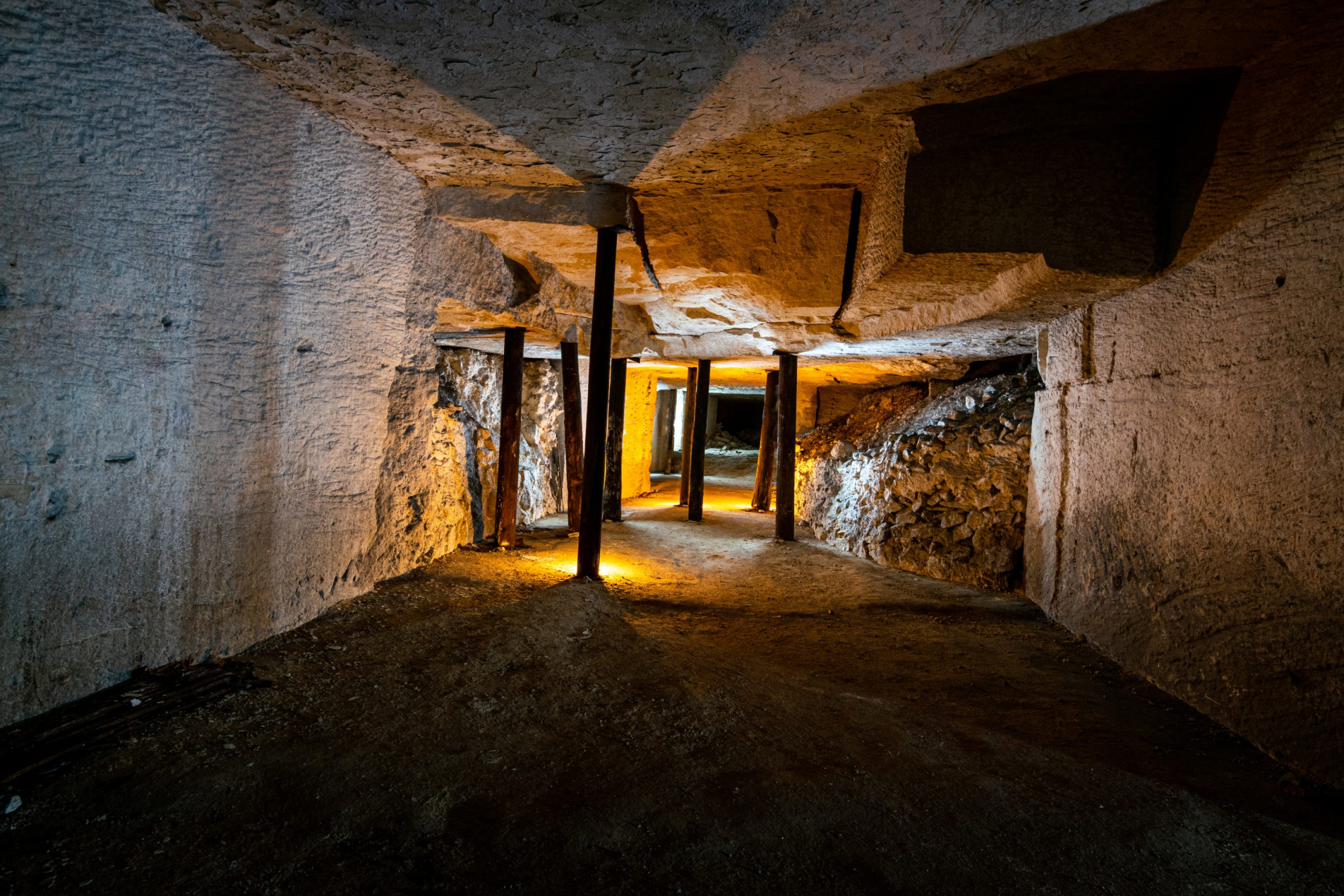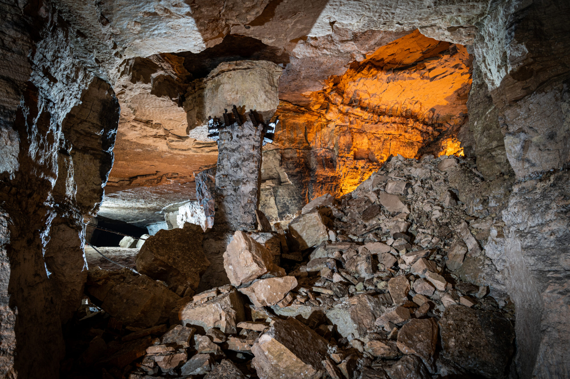 Piliers écaillés dans cette champignonnière. La surexploitation des sols cumulées à la surcharge des terrains de surface font flamber les piliers de masse de la carrière. Déjà très fragilisée par un premier effondrement en 1963 puis un second en 2001. C'est maintenant plus qu'une question de temps avant que cette zone se referme sur elle-même.