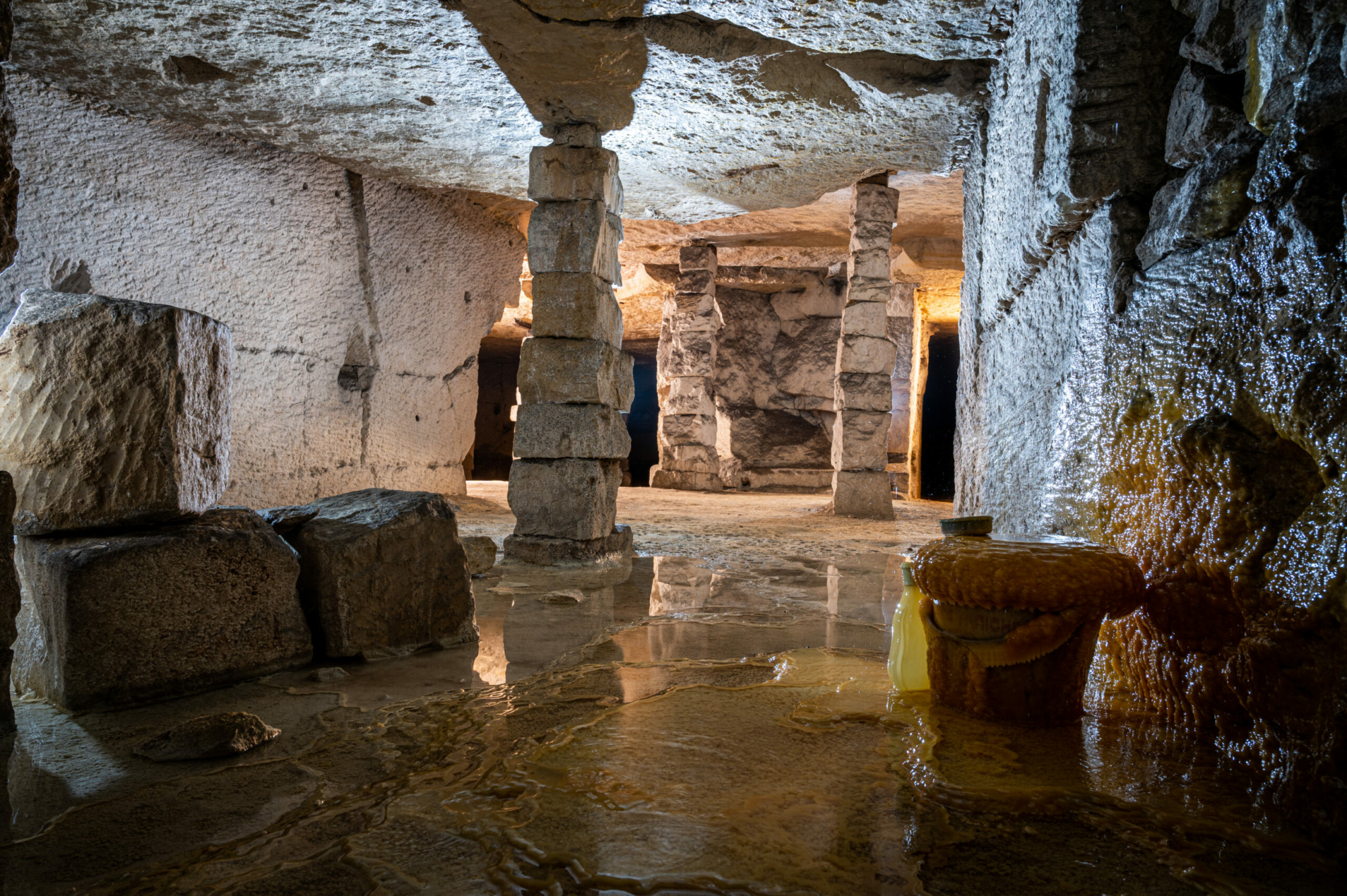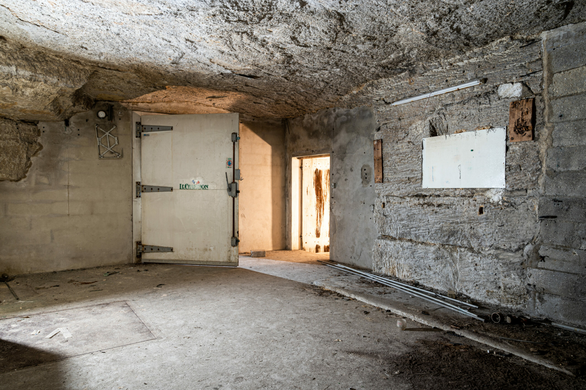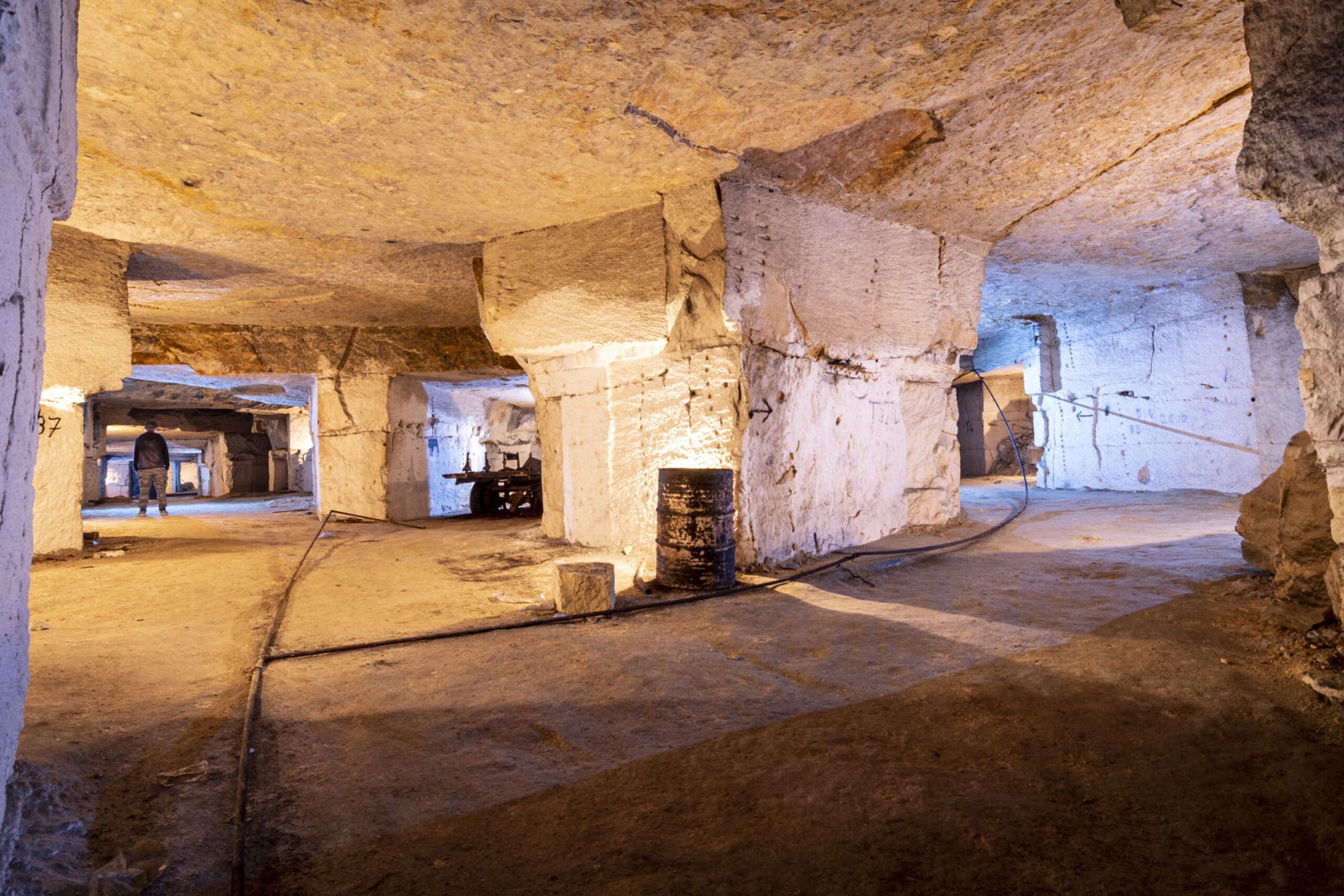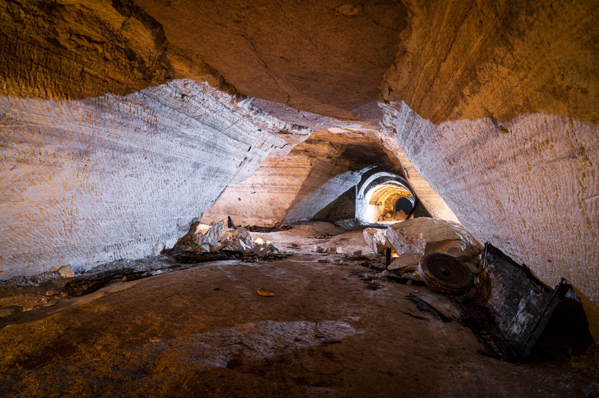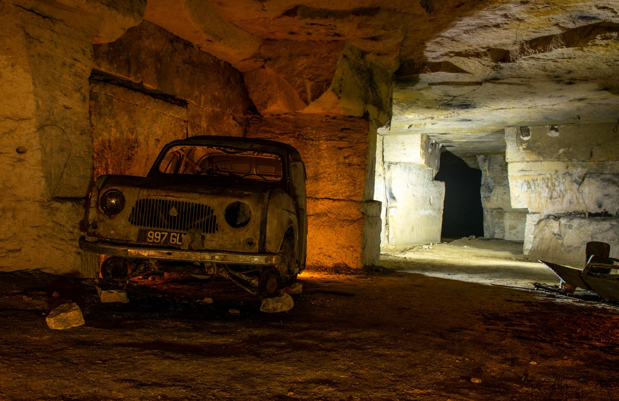 Piliers écaillés dans cette champignonnière. La surexploitation des sols cumulées à la surcharge des terrains de surface font flamber les piliers de masse de la carrière. Déjà très fragilisée par un premier effondrement en 1963 puis un second en 2001. C'est maintenant plus qu'une question de temps avant que cette zone se referme sur elle-même.