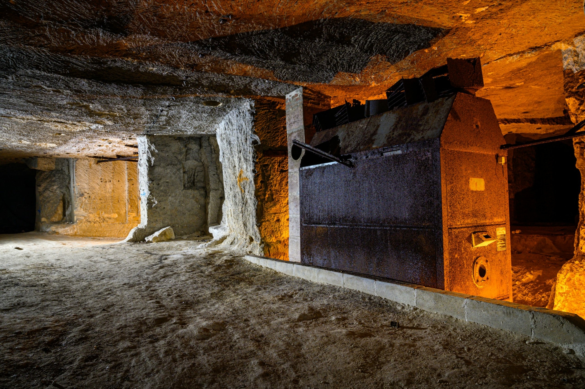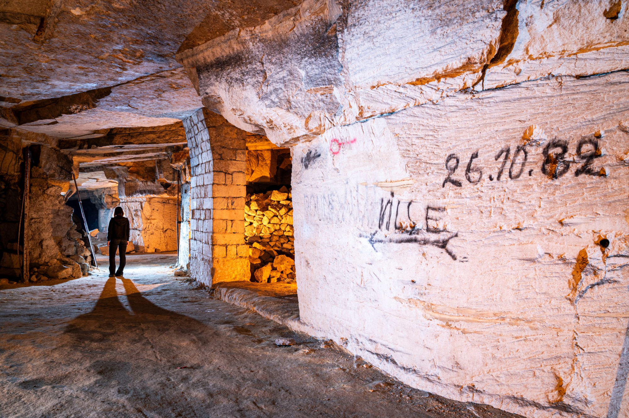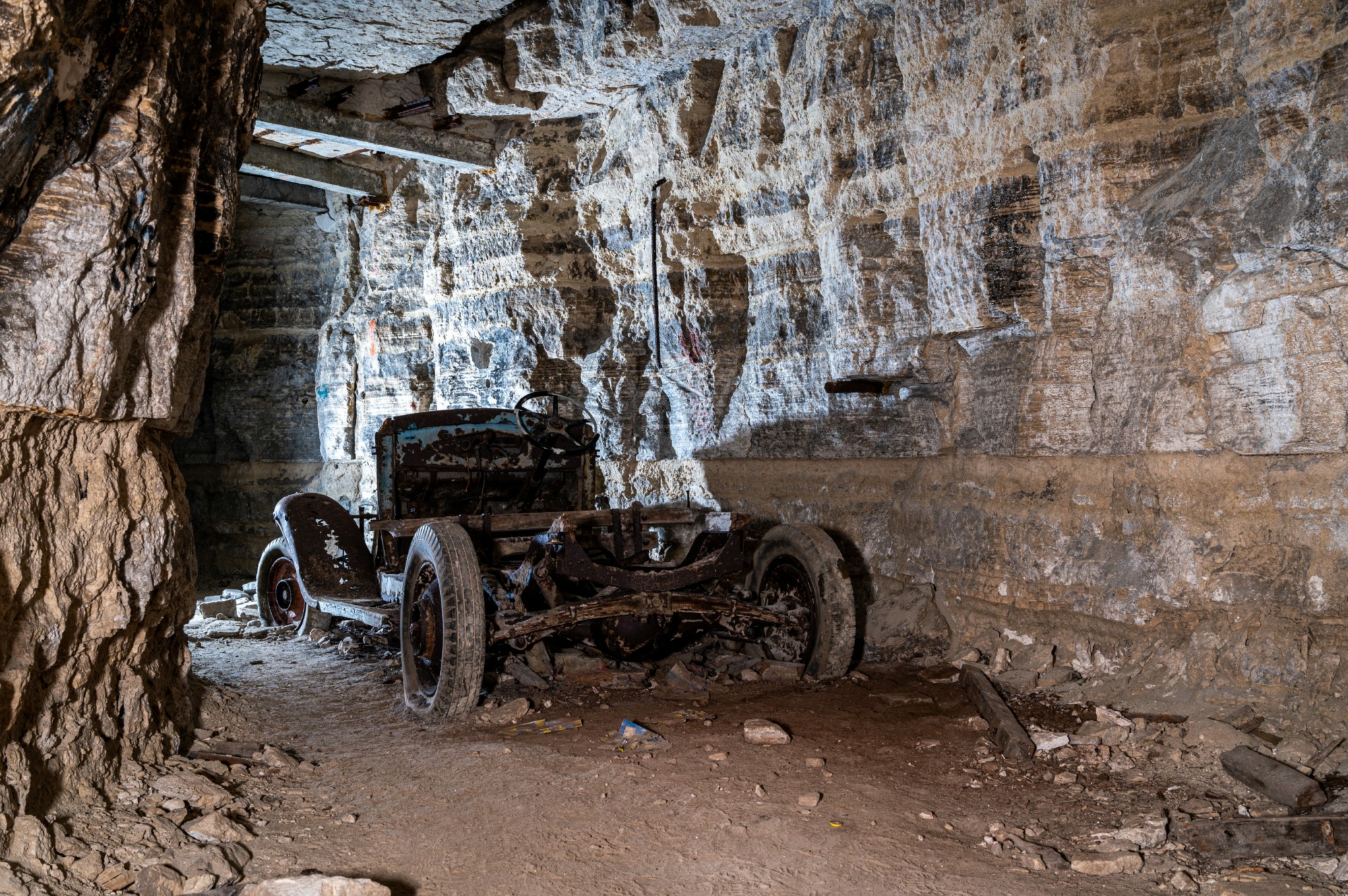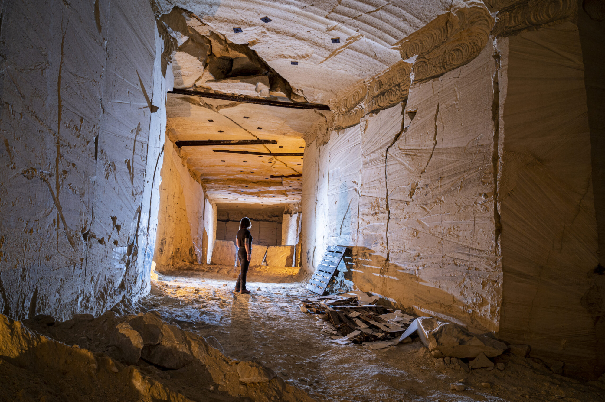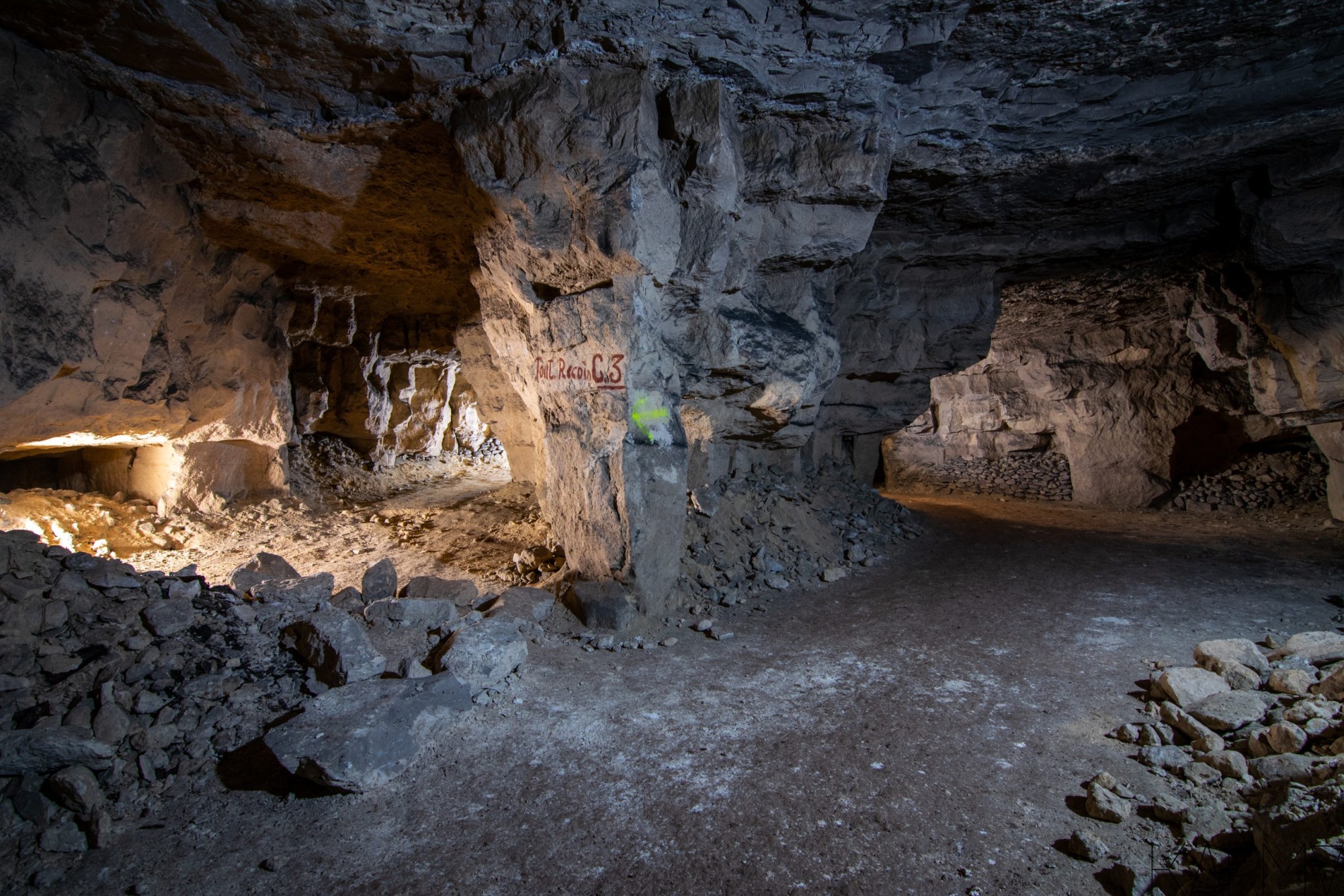 Piliers écaillés dans cette champignonnière. La surexploitation des sols cumulées à la surcharge des terrains de surface font flamber les piliers de masse de la carrière. Déjà très fragilisée par un premier effondrement en 1963 puis un second en 2001. C'est maintenant plus qu'une question de temps avant que cette zone se referme sur elle-même.