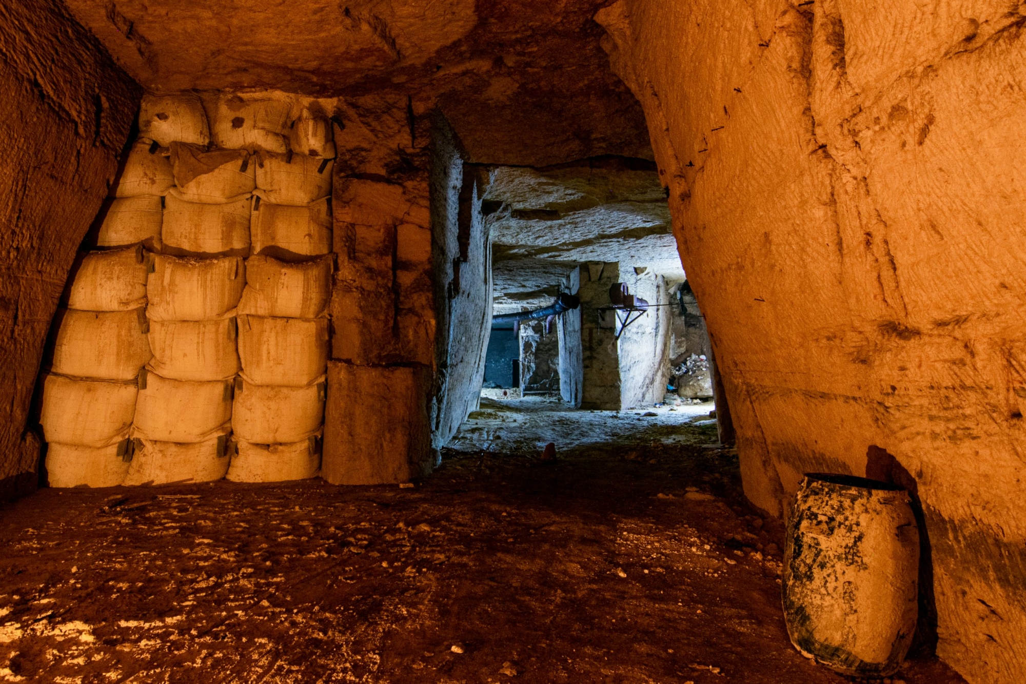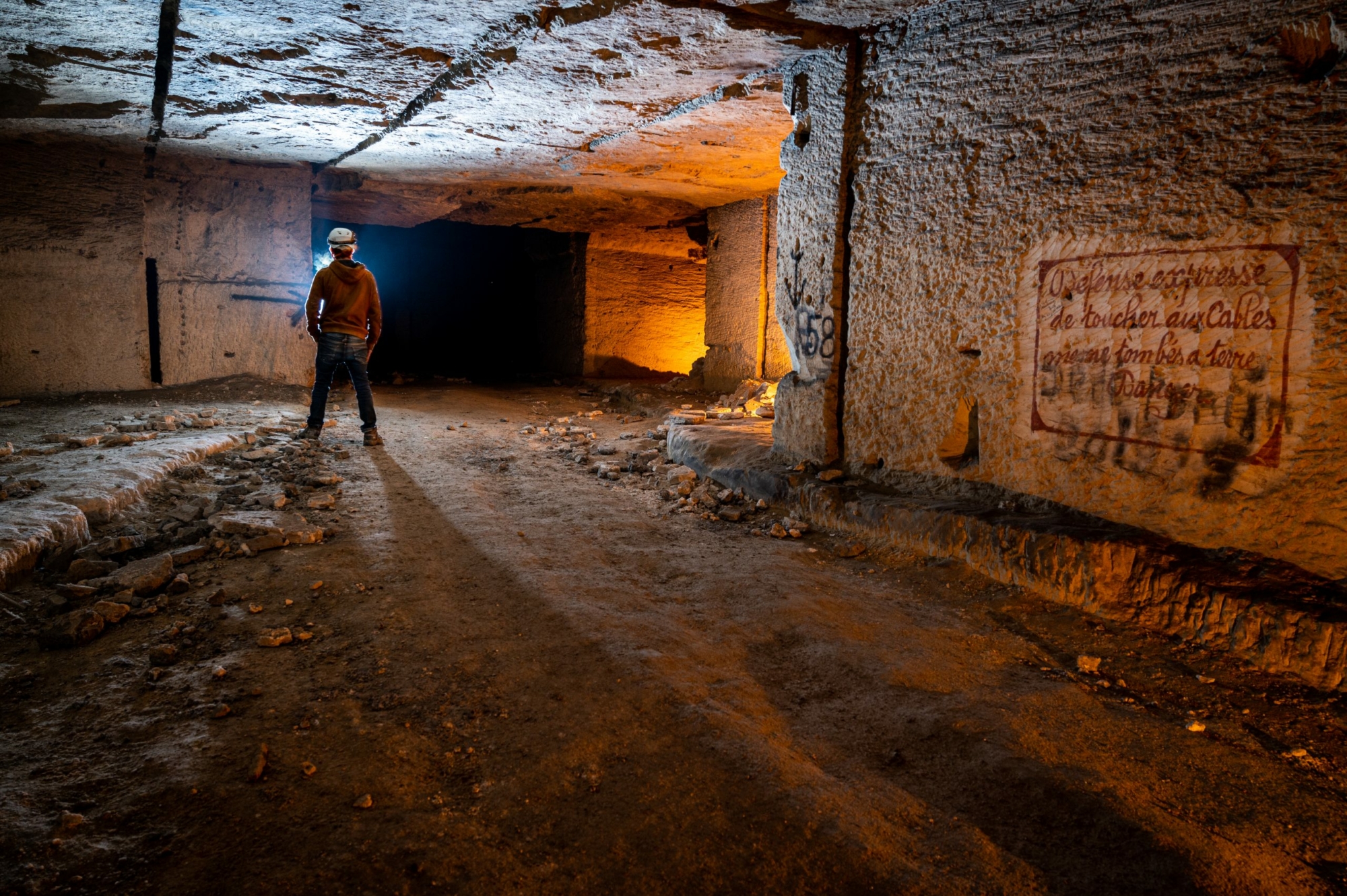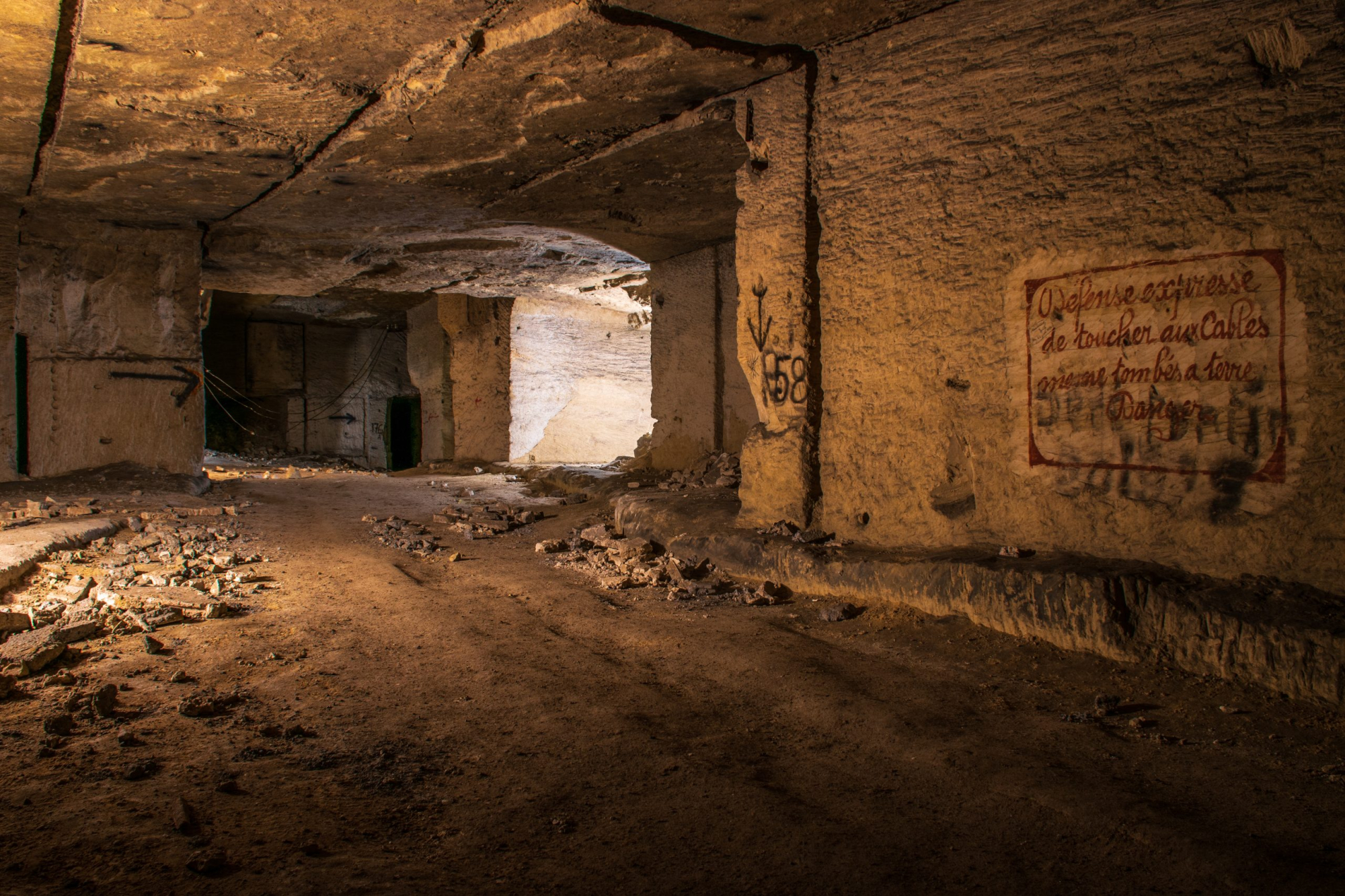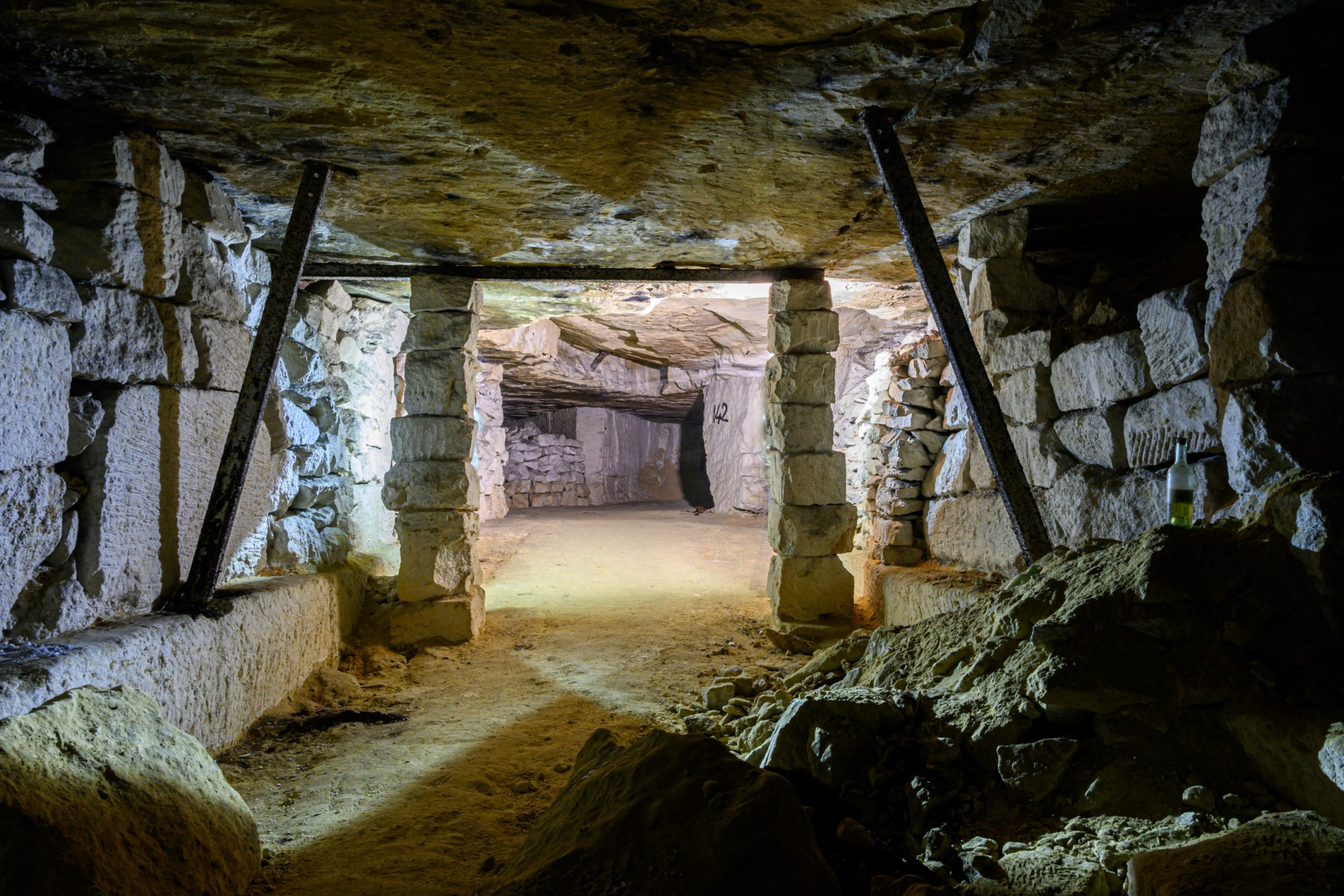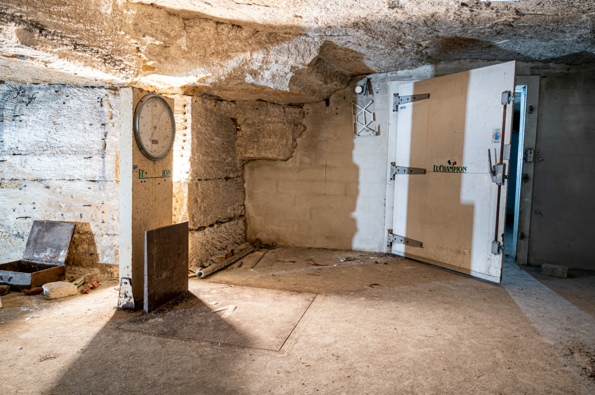 Piliers écaillés dans cette champignonnière. La surexploitation des sols cumulées à la surcharge des terrains de surface font flamber les piliers de masse de la carrière. Déjà très fragilisée par un premier effondrement en 1963 puis un second en 2001. C'est maintenant plus qu'une question de temps avant que cette zone se referme sur elle-même.