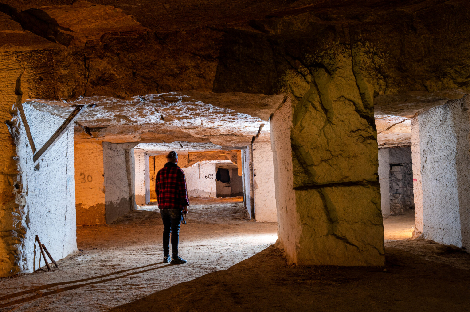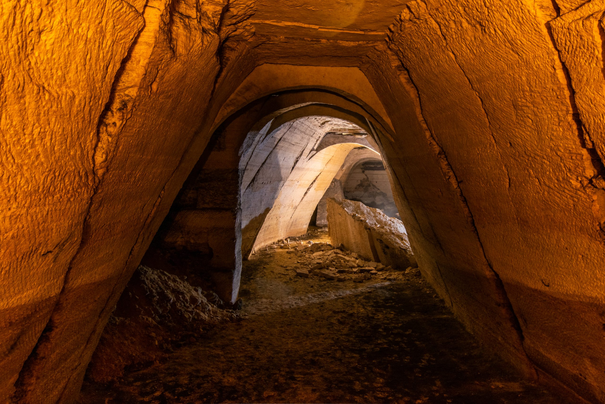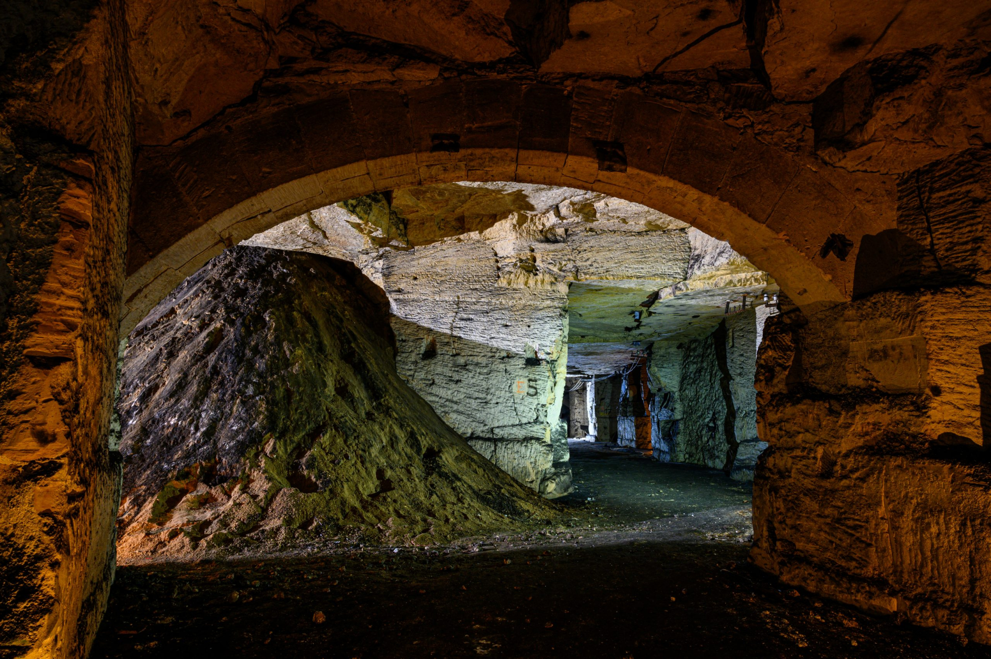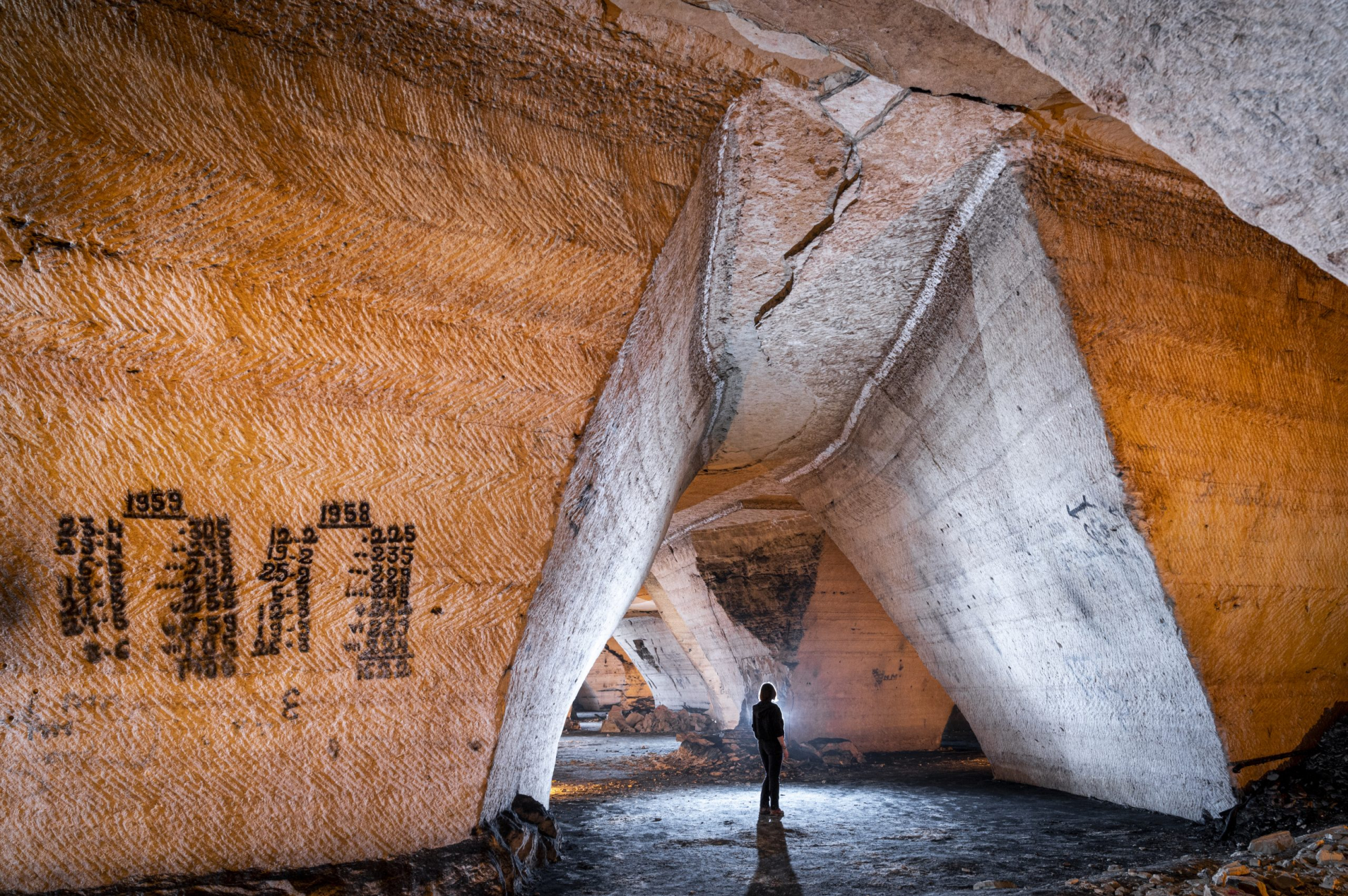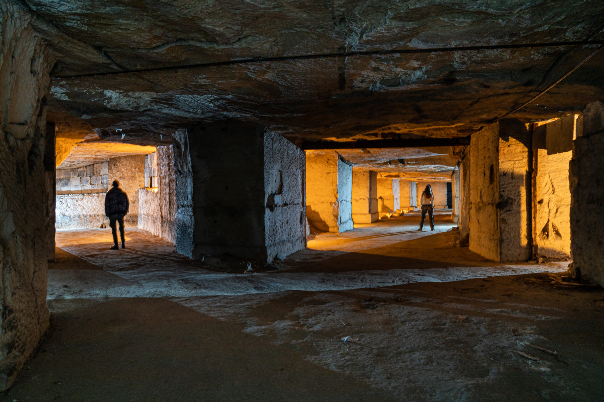 Piliers écaillés dans cette champignonnière. La surexploitation des sols cumulées à la surcharge des terrains de surface font flamber les piliers de masse de la carrière. Déjà très fragilisée par un premier effondrement en 1963 puis un second en 2001. C'est maintenant plus qu'une question de temps avant que cette zone se referme sur elle-même.