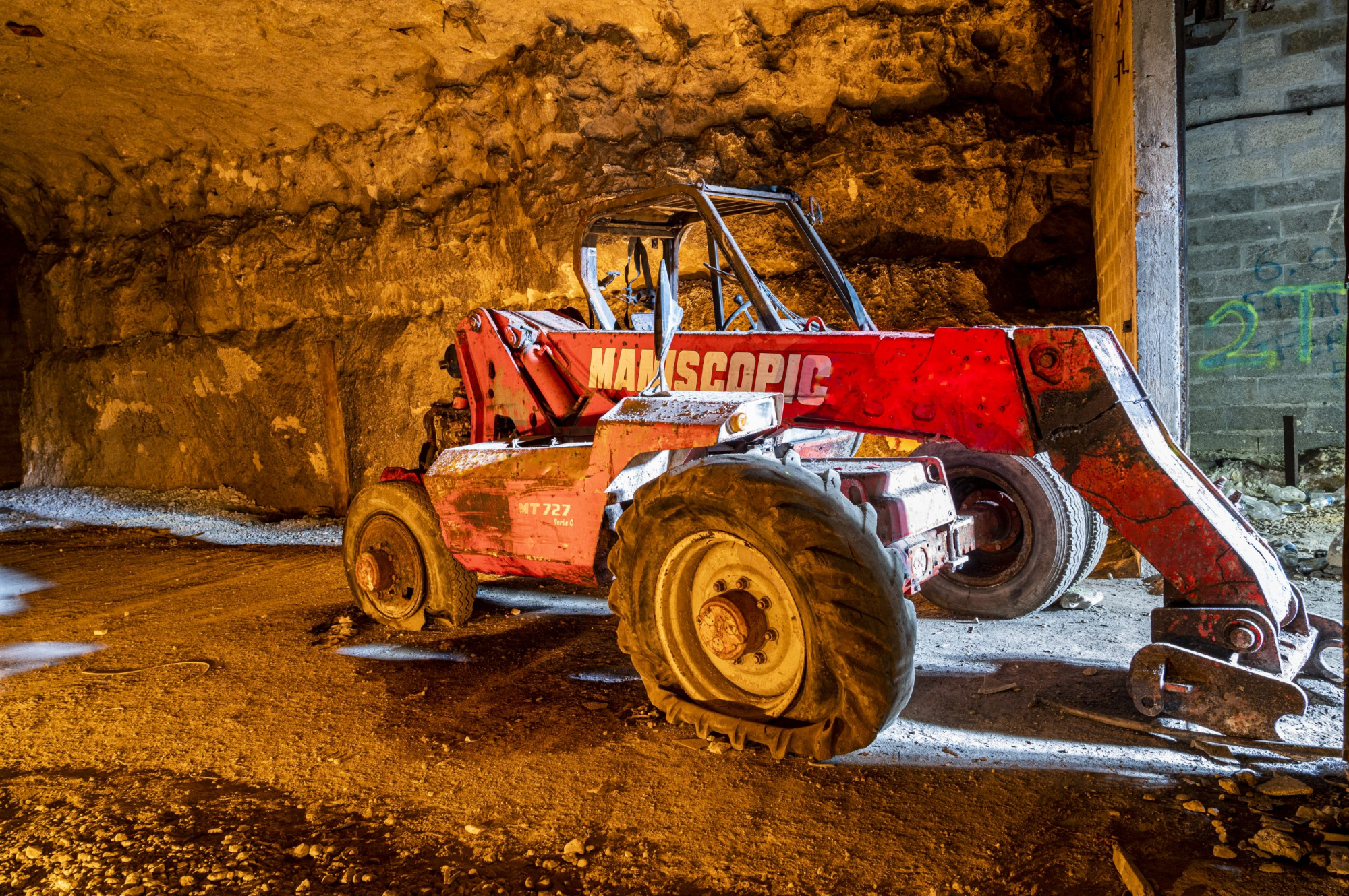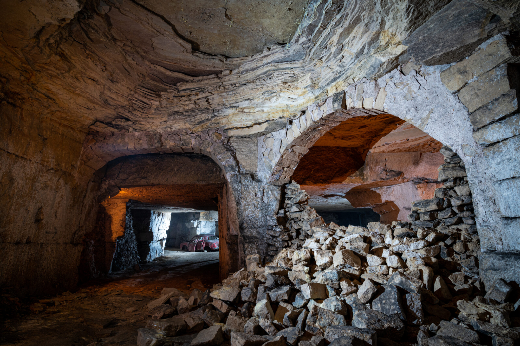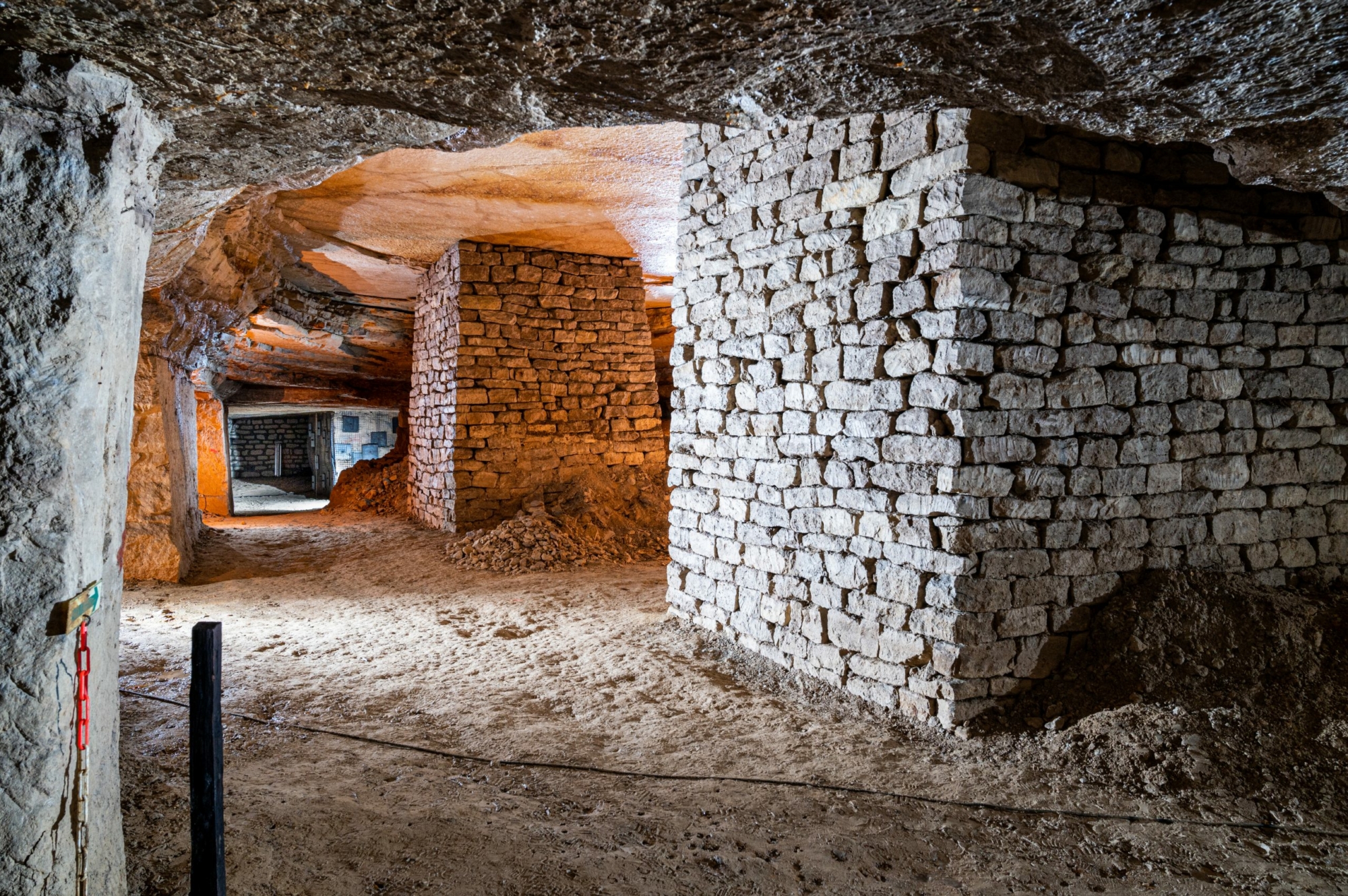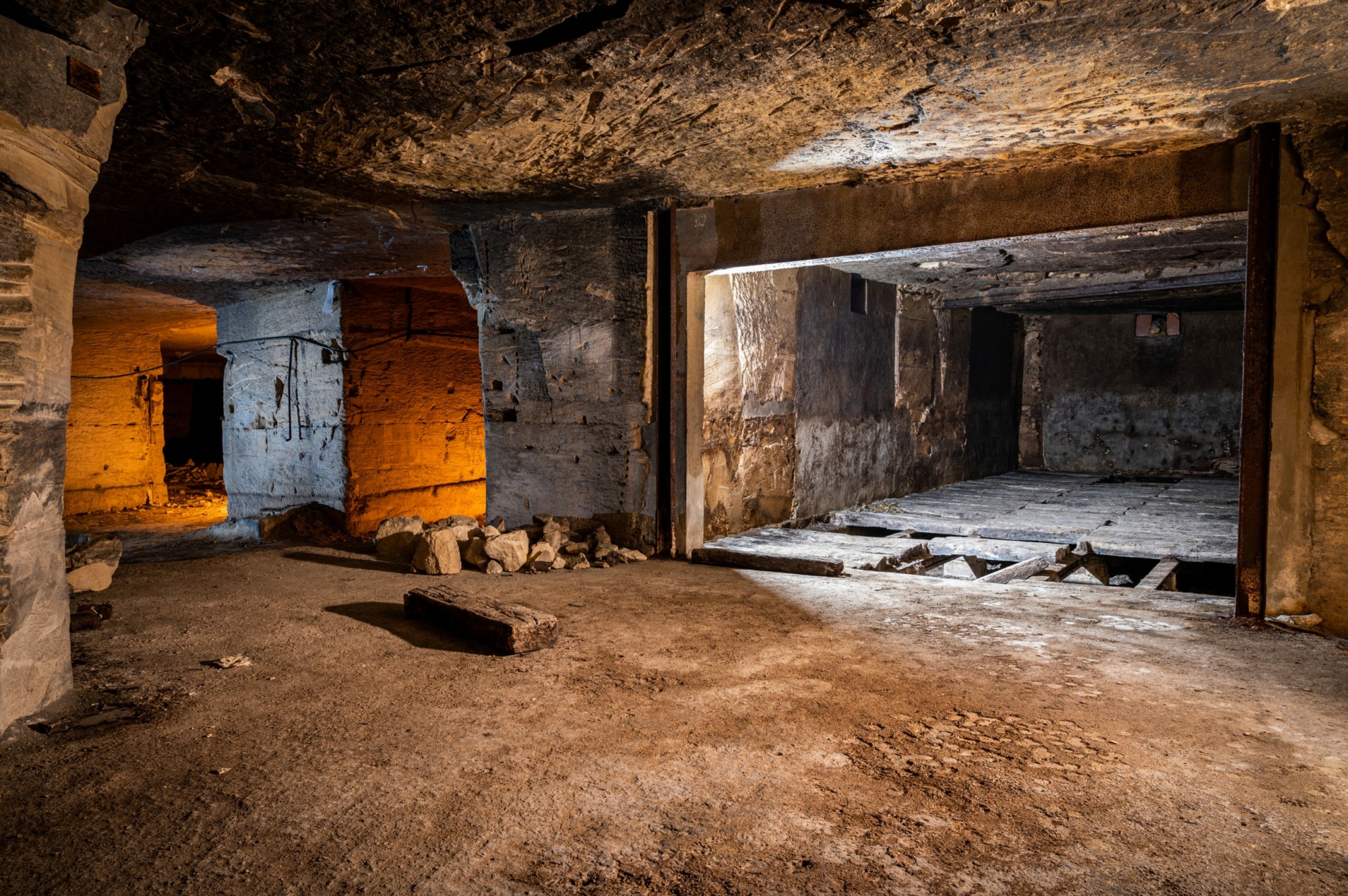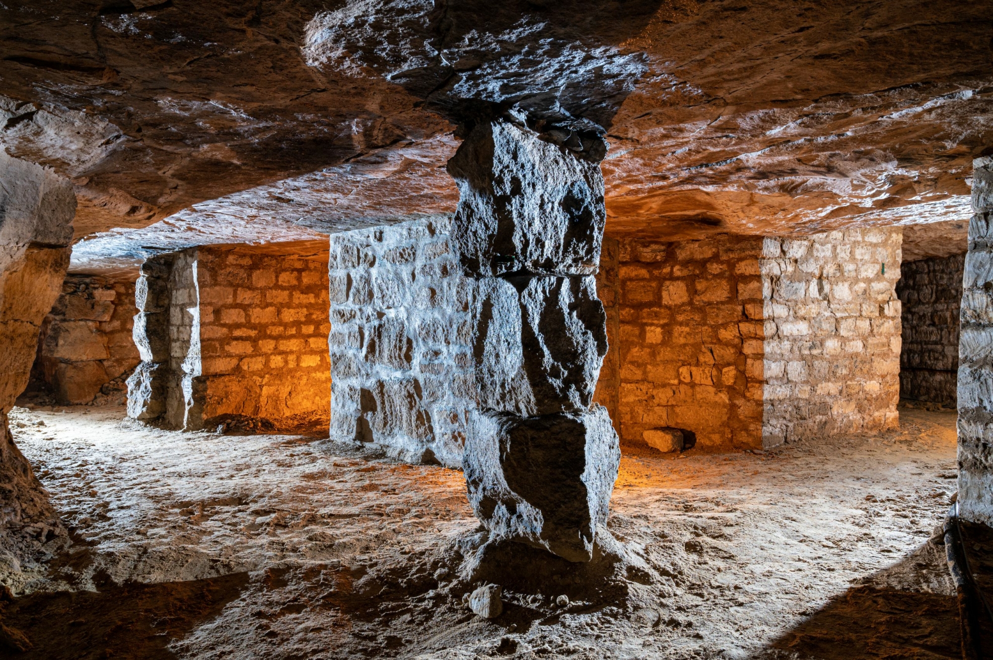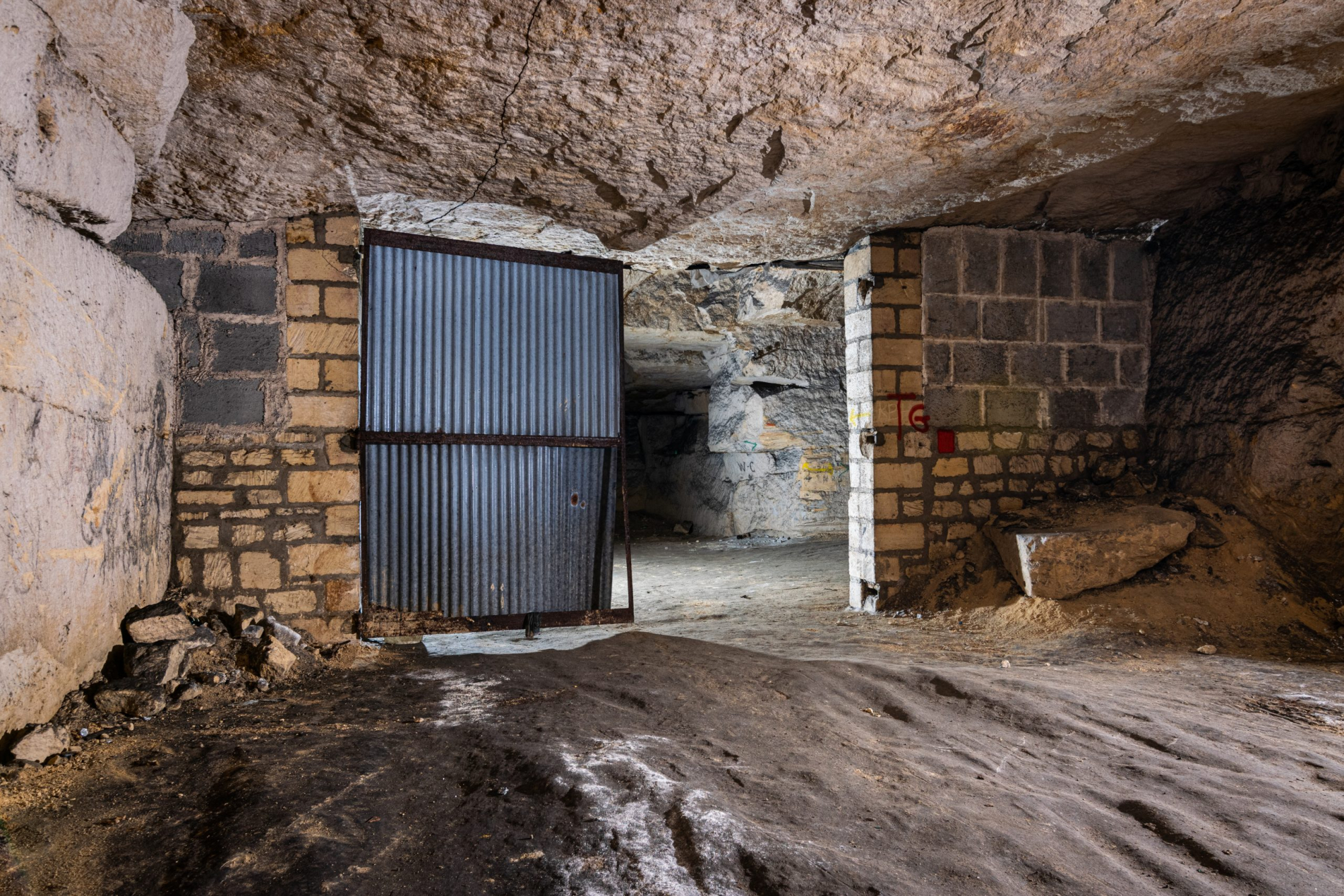 Piliers écaillés dans cette champignonnière. La surexploitation des sols cumulées à la surcharge des terrains de surface font flamber les piliers de masse de la carrière. Déjà très fragilisée par un premier effondrement en 1963 puis un second en 2001. C'est maintenant plus qu'une question de temps avant que cette zone se referme sur elle-même.