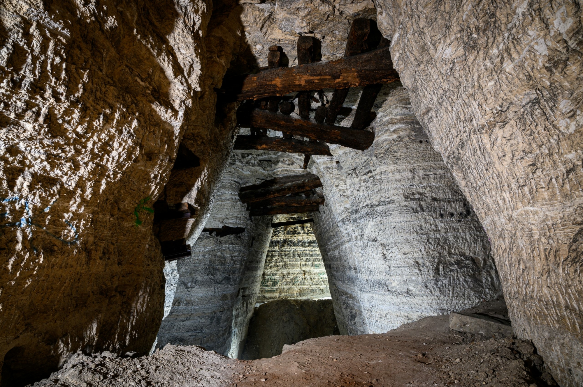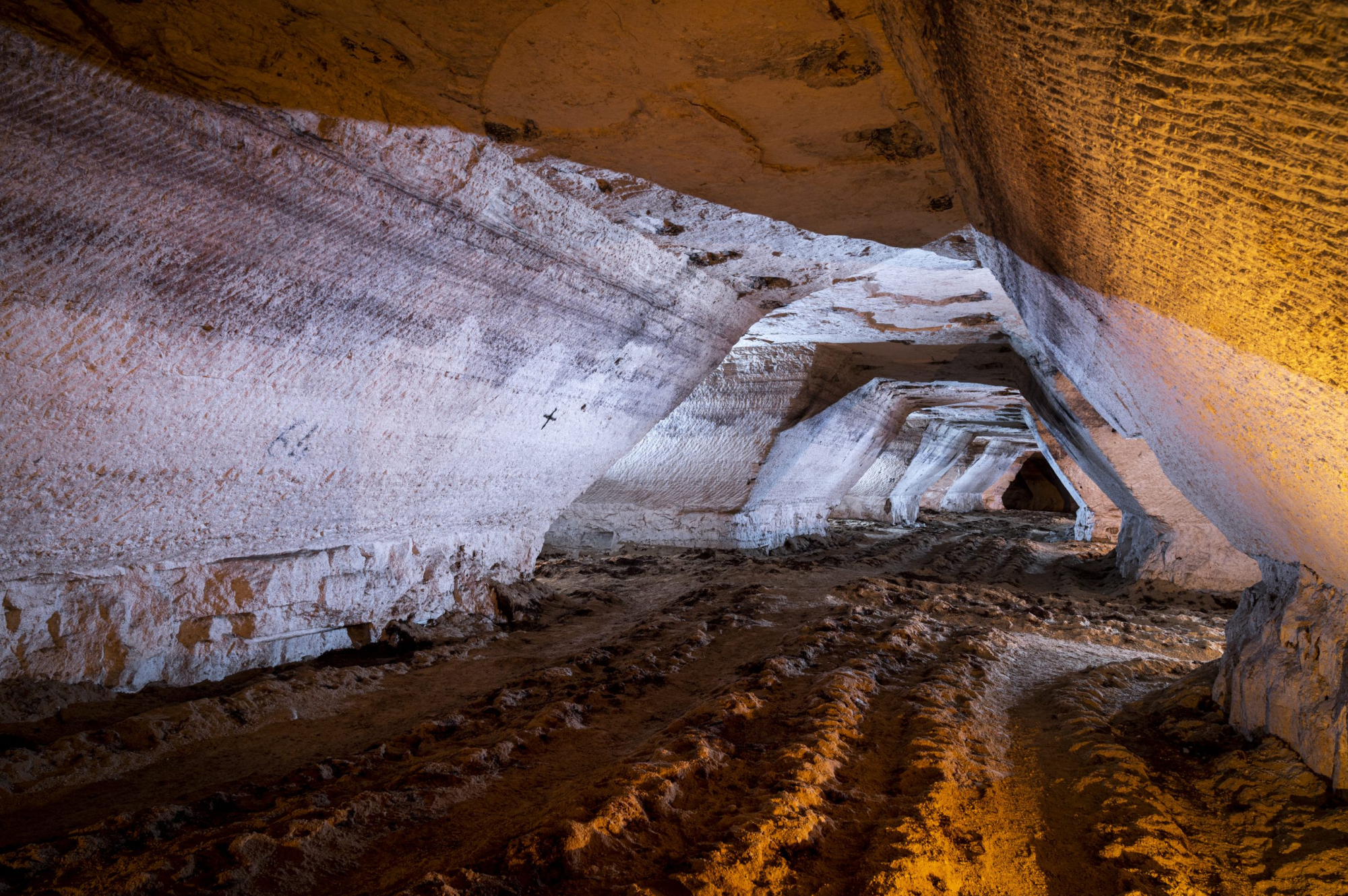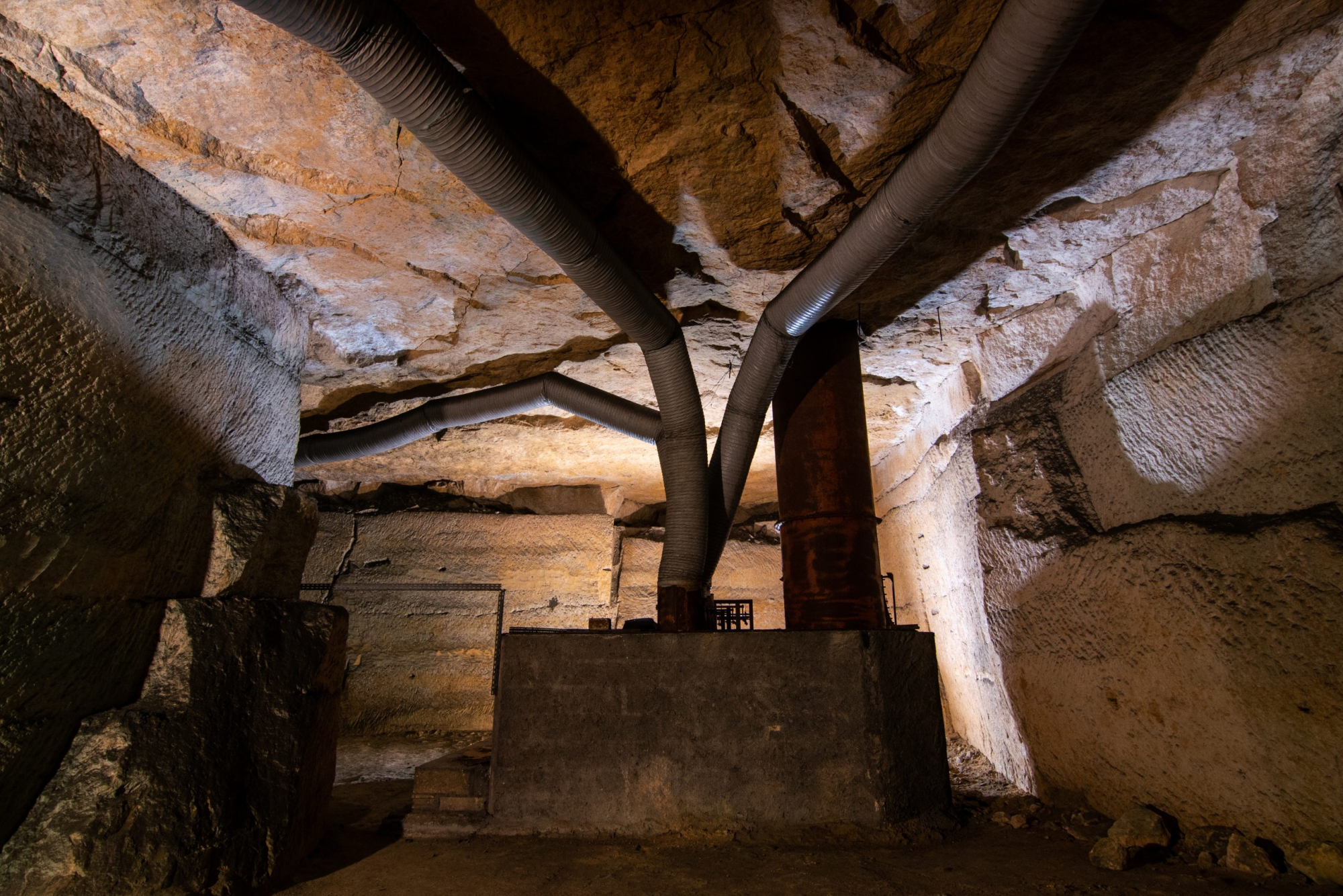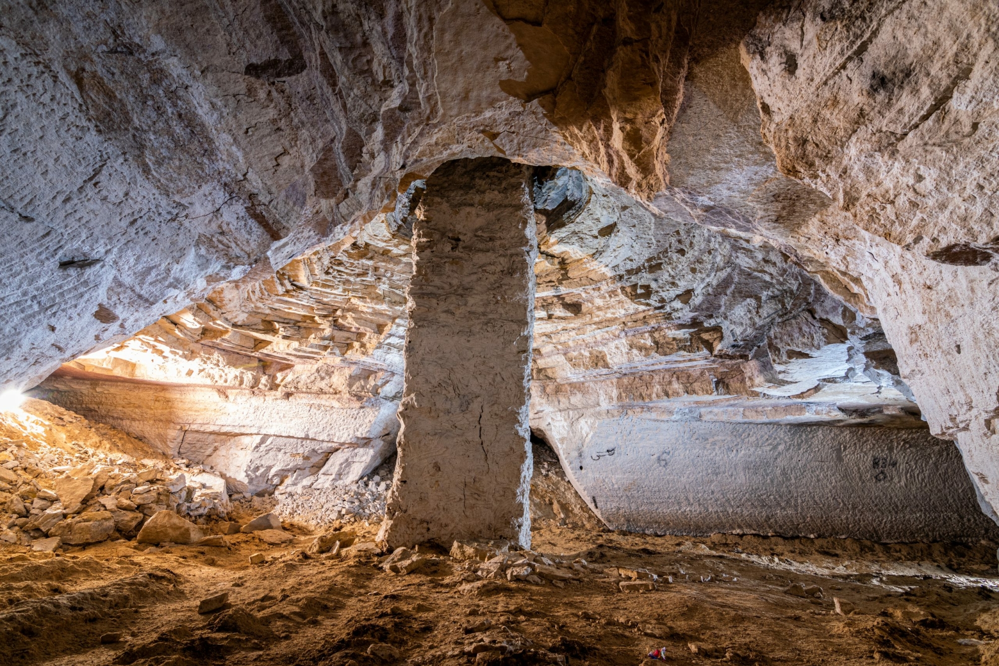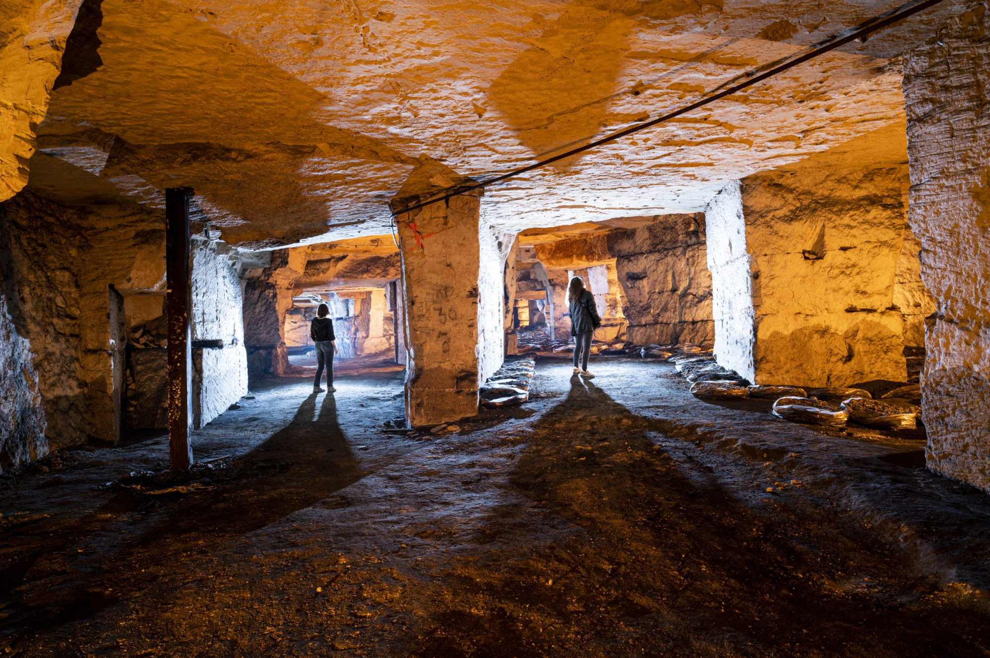 Piliers écaillés dans cette champignonnière. La surexploitation des sols cumulées à la surcharge des terrains de surface font flamber les piliers de masse de la carrière. Déjà très fragilisée par un premier effondrement en 1963 puis un second en 2001. C'est maintenant plus qu'une question de temps avant que cette zone se referme sur elle-même.