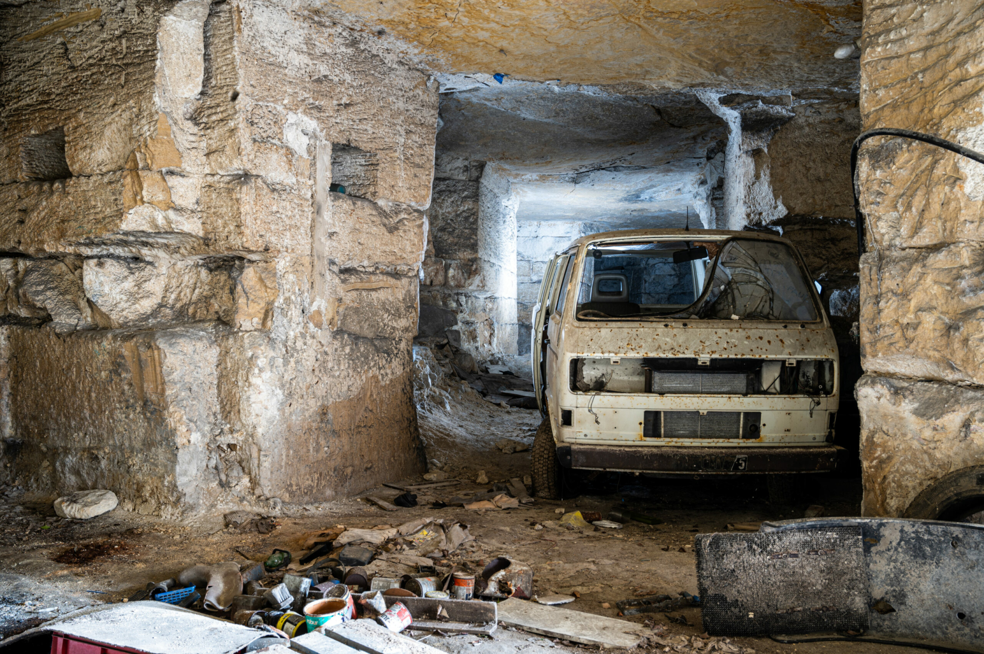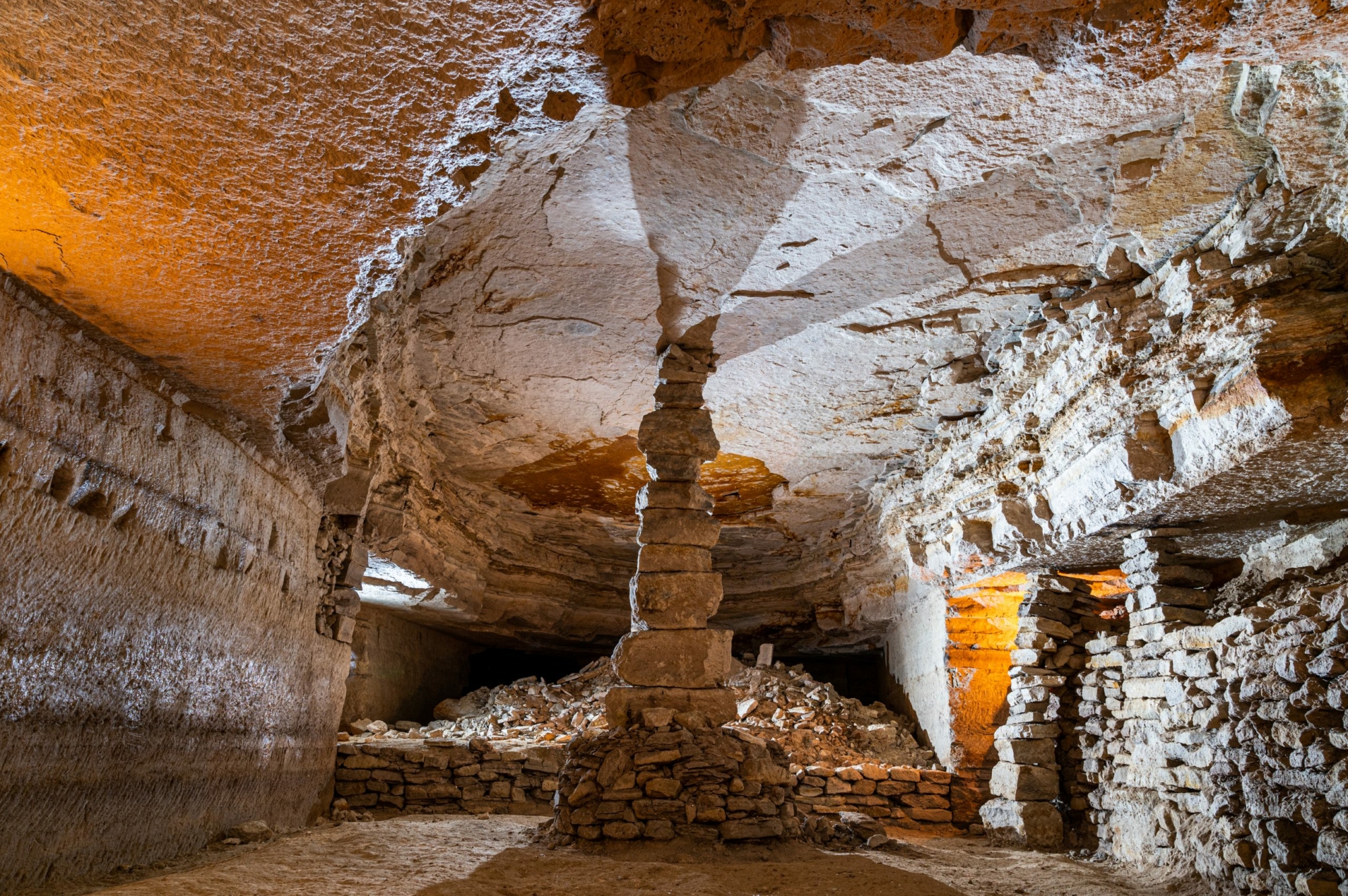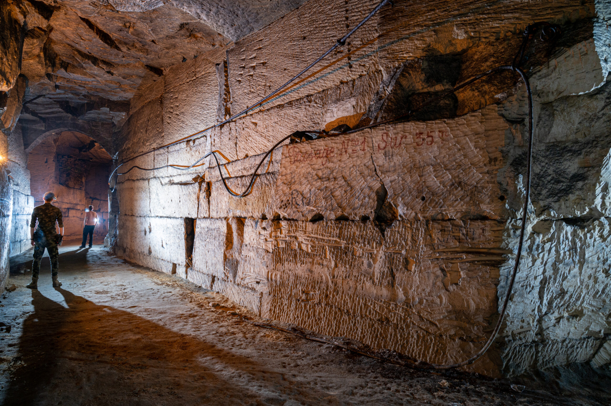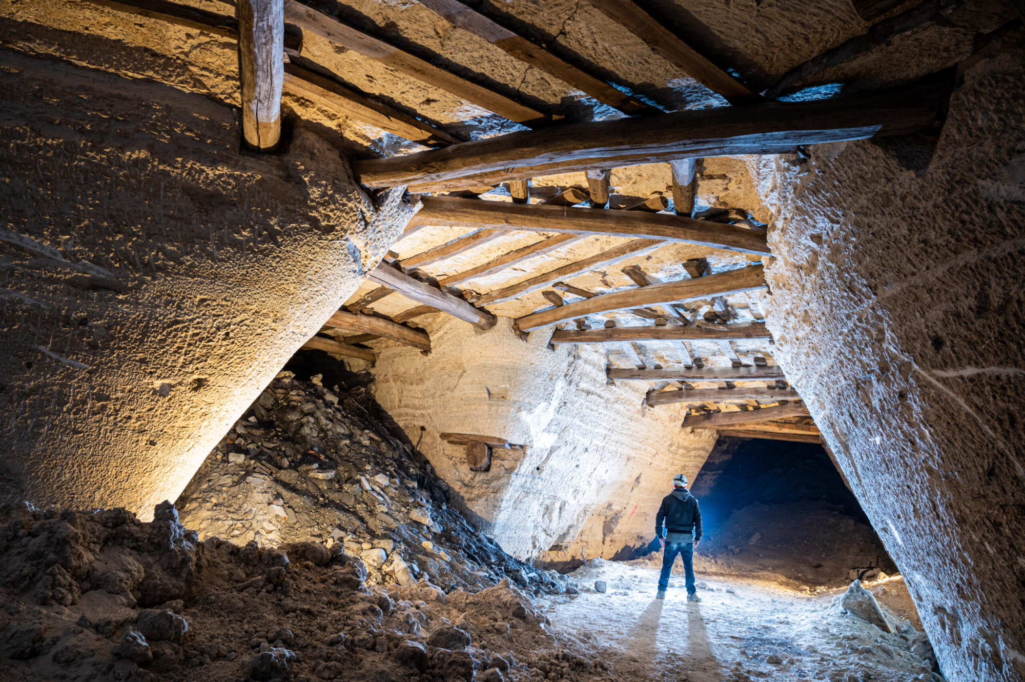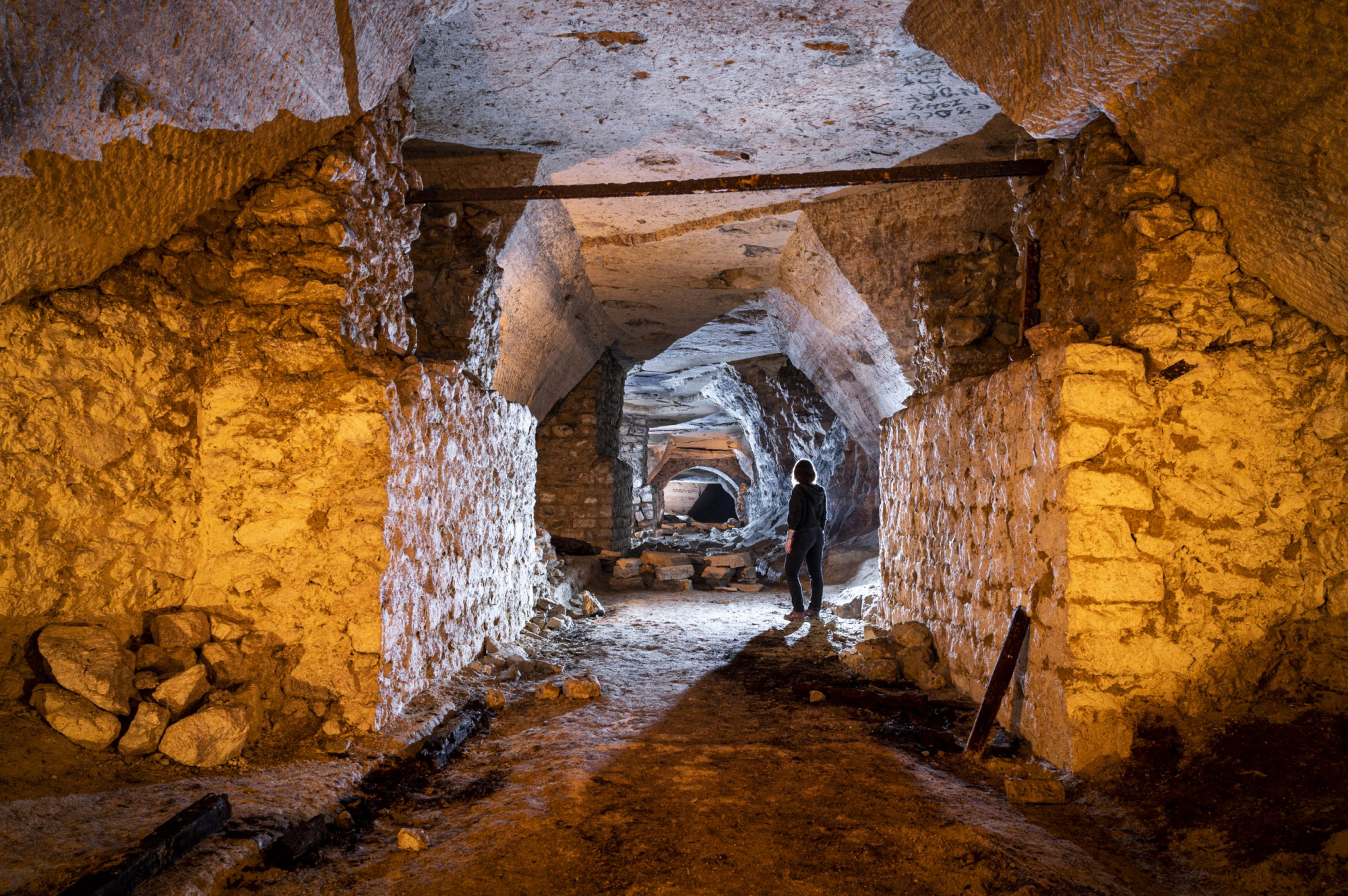 Piliers écaillés dans cette champignonnière. La surexploitation des sols cumulées à la surcharge des terrains de surface font flamber les piliers de masse de la carrière. Déjà très fragilisée par un premier effondrement en 1963 puis un second en 2001. C'est maintenant plus qu'une question de temps avant que cette zone se referme sur elle-même.