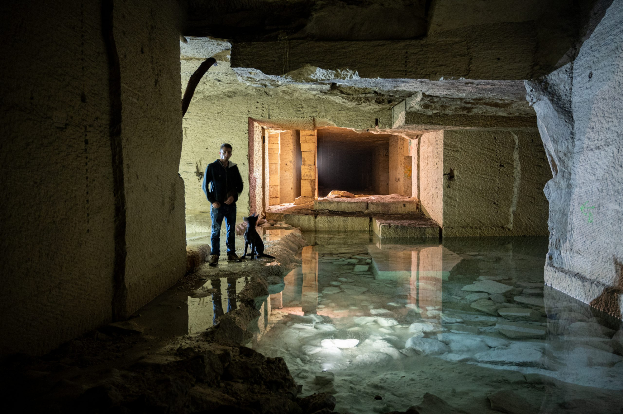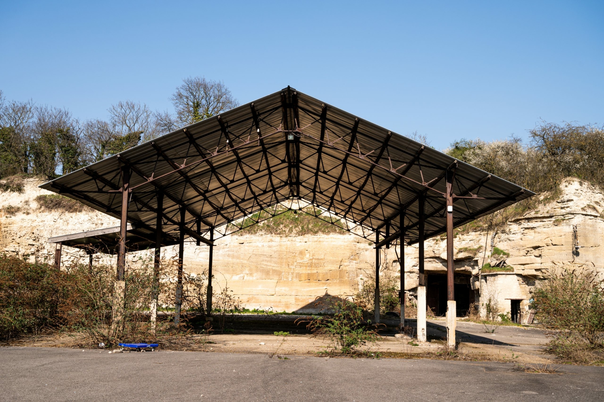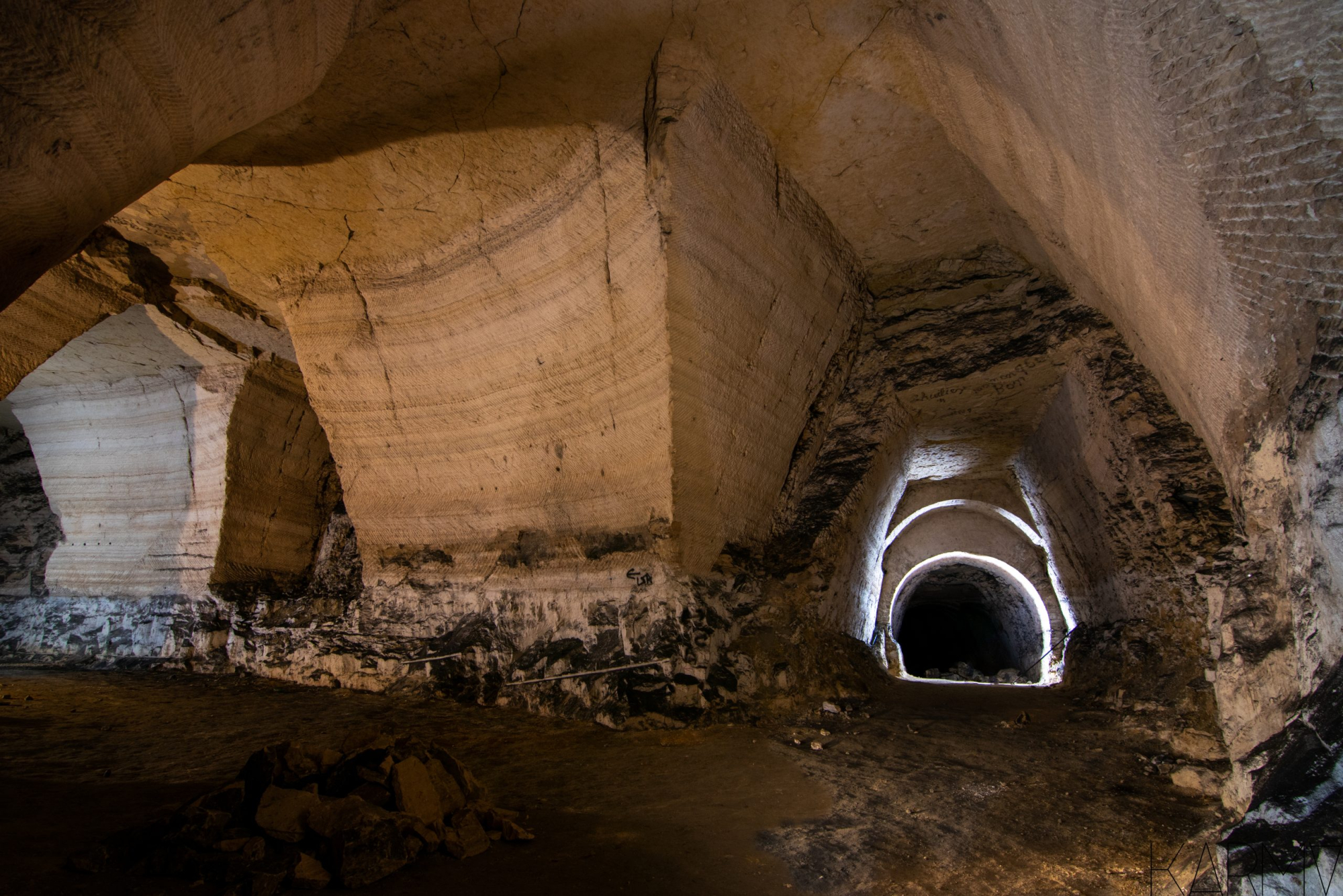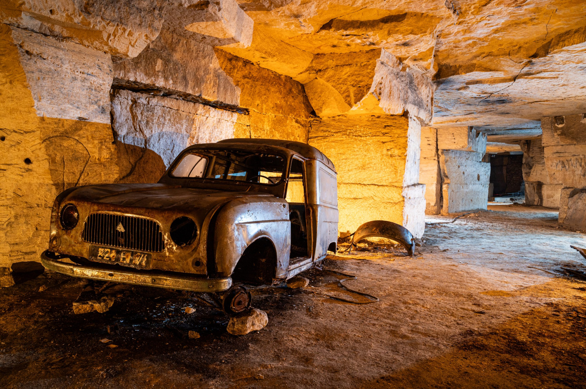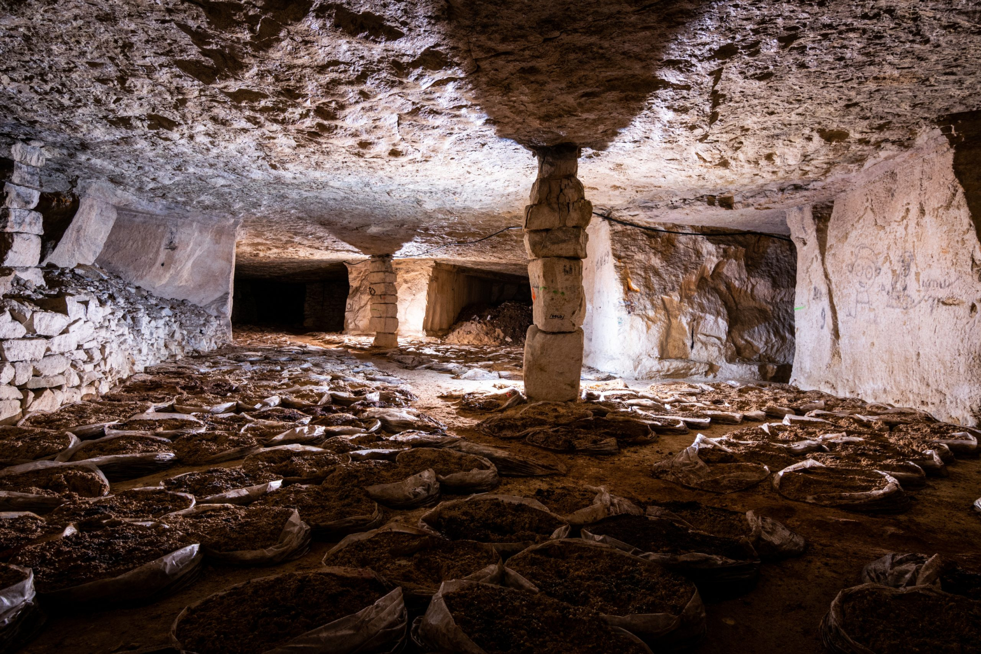 Piliers écaillés dans cette champignonnière. La surexploitation des sols cumulées à la surcharge des terrains de surface font flamber les piliers de masse de la carrière. Déjà très fragilisée par un premier effondrement en 1963 puis un second en 2001. C'est maintenant plus qu'une question de temps avant que cette zone se referme sur elle-même.