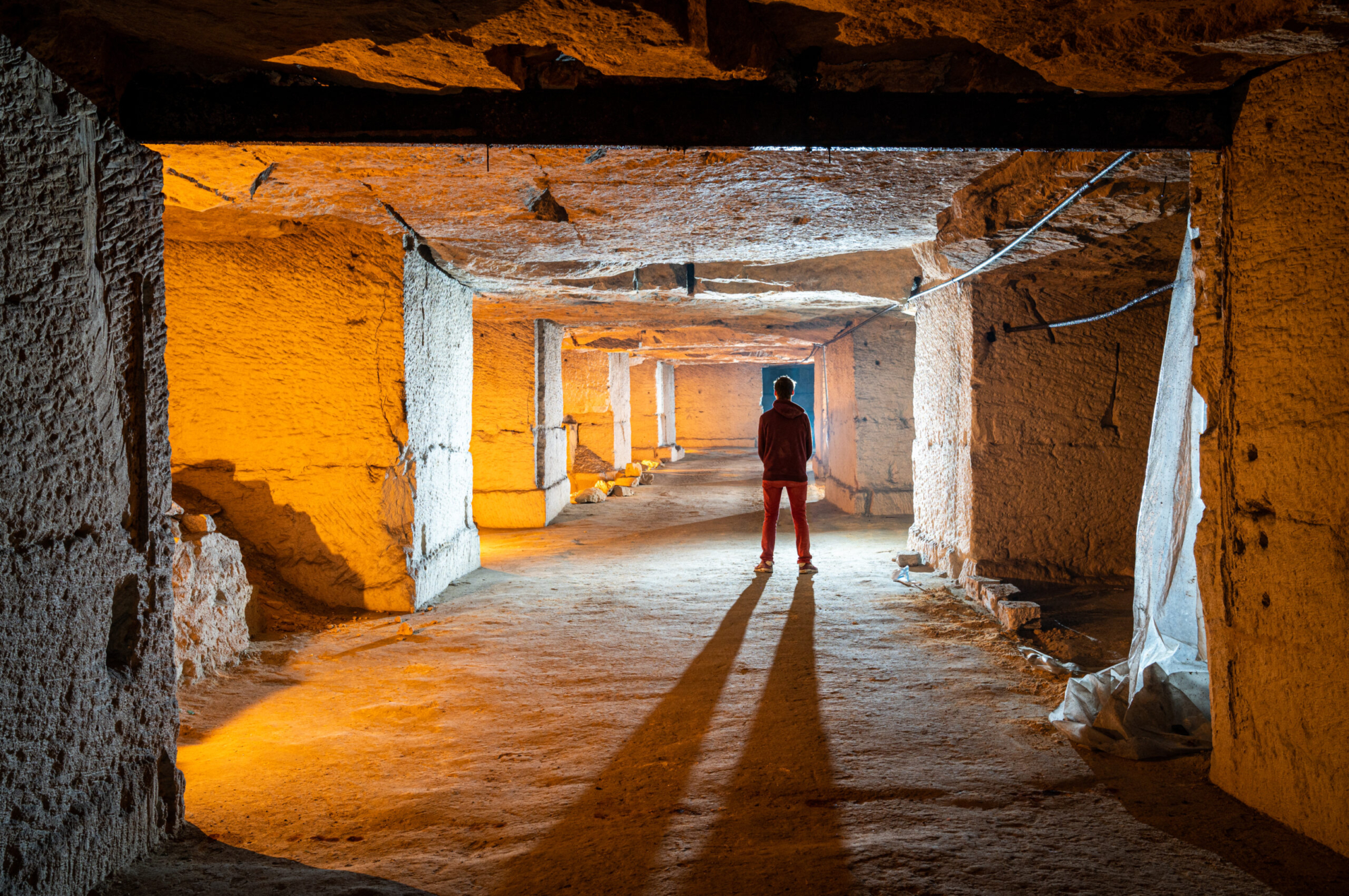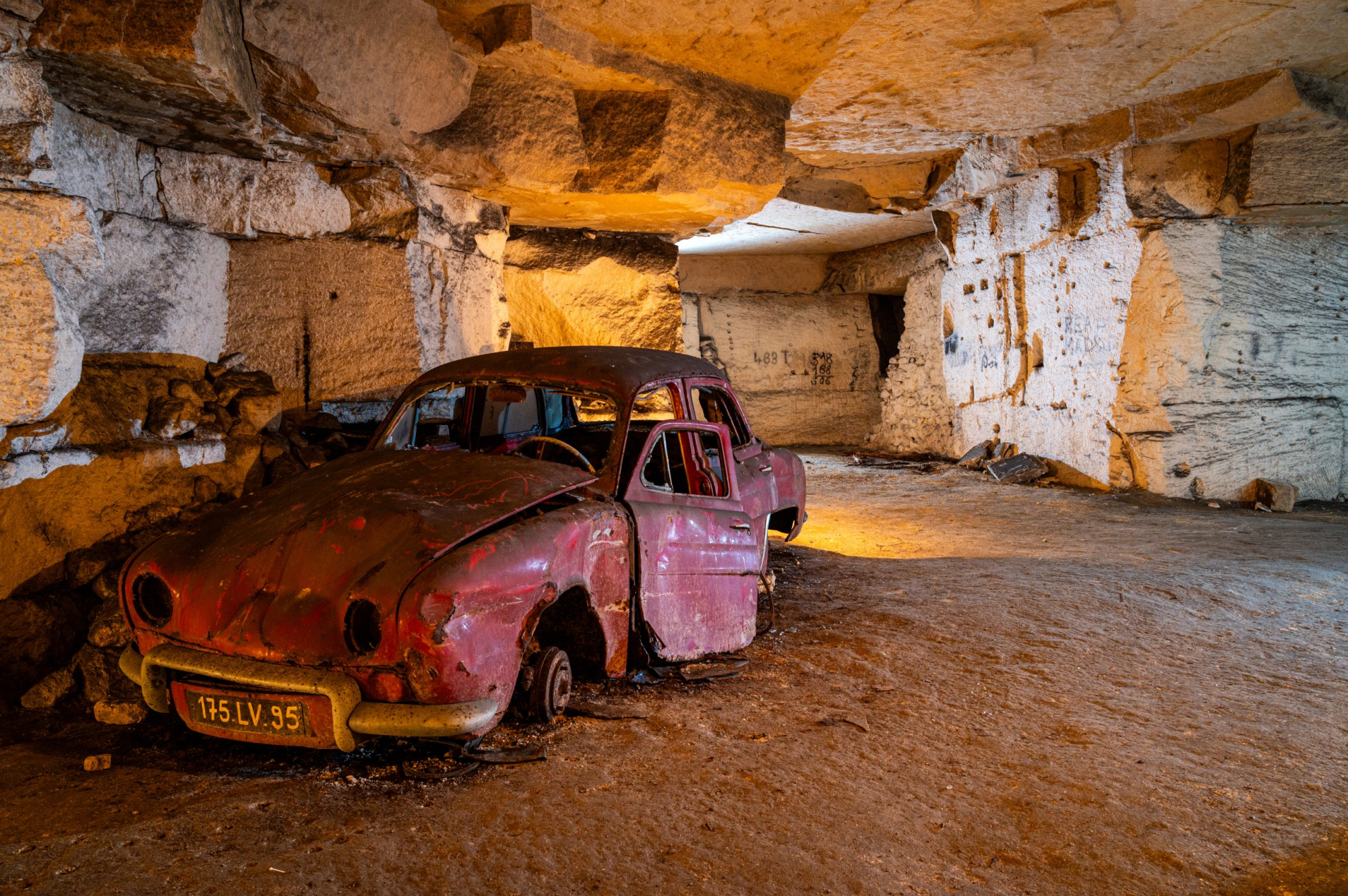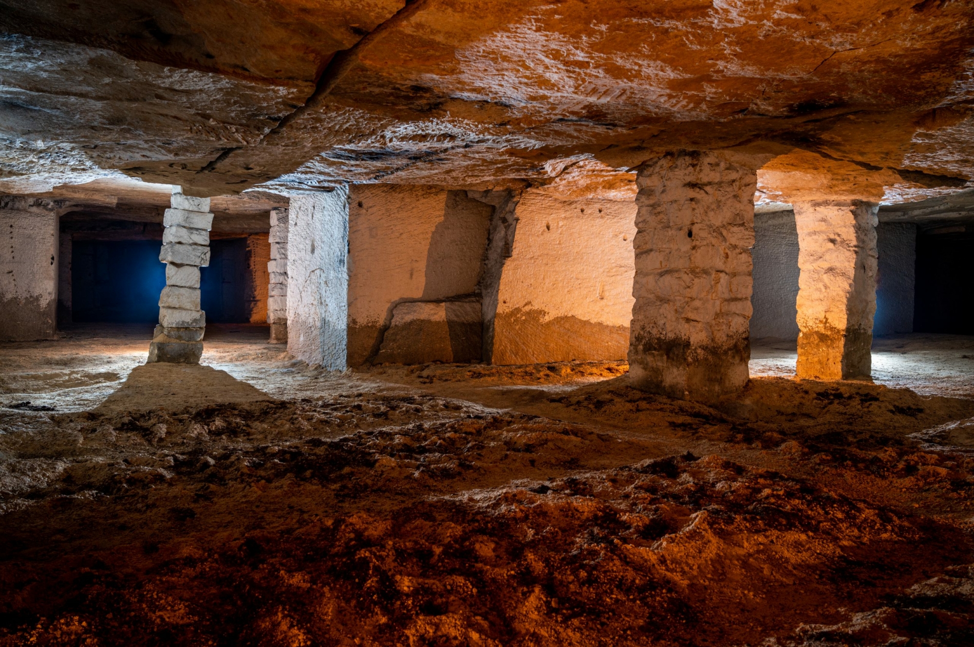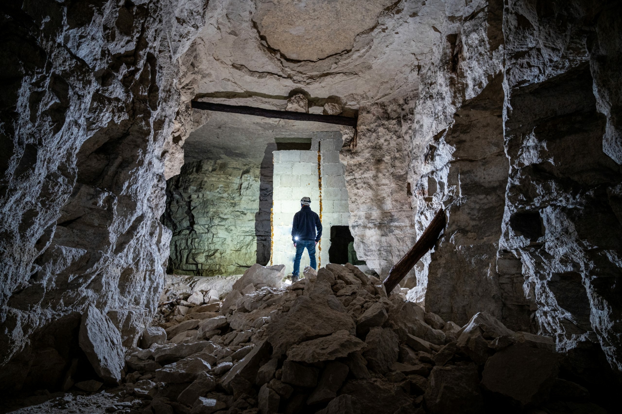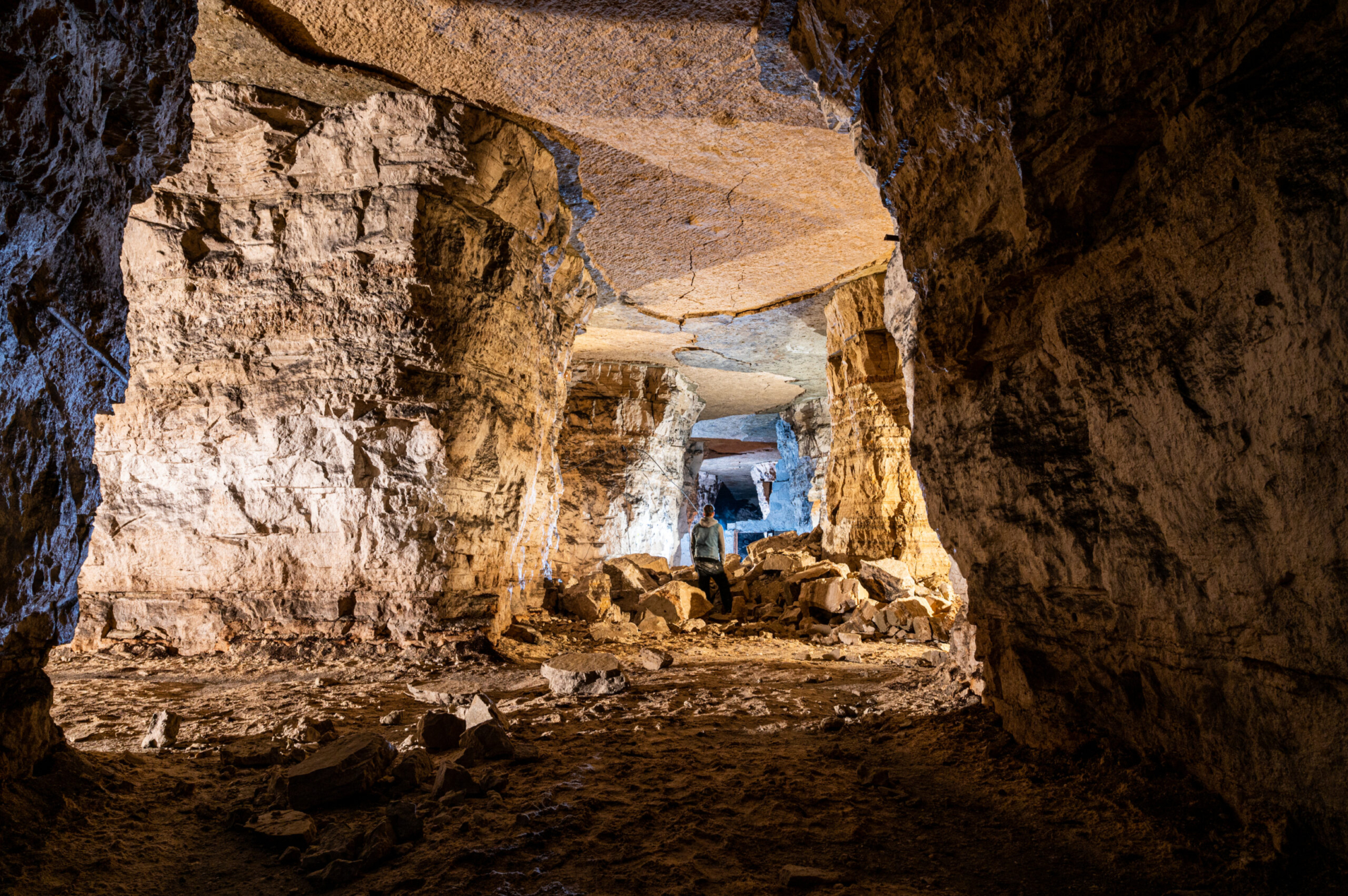 Piliers écaillés dans cette champignonnière. La surexploitation des sols cumulées à la surcharge des terrains de surface font flamber les piliers de masse de la carrière. Déjà très fragilisée par un premier effondrement en 1963 puis un second en 2001. C'est maintenant plus qu'une question de temps avant que cette zone se referme sur elle-même.