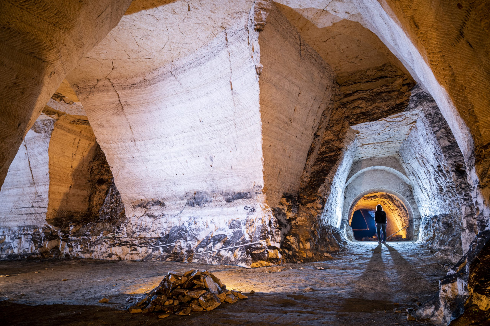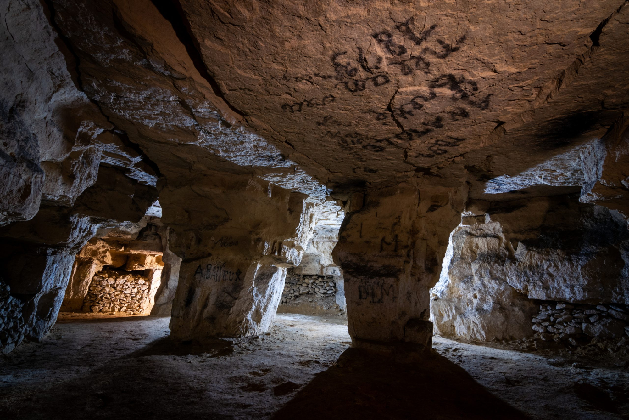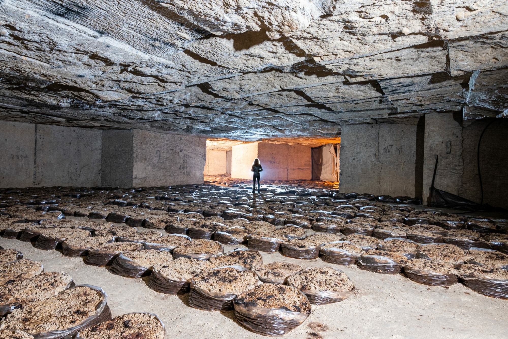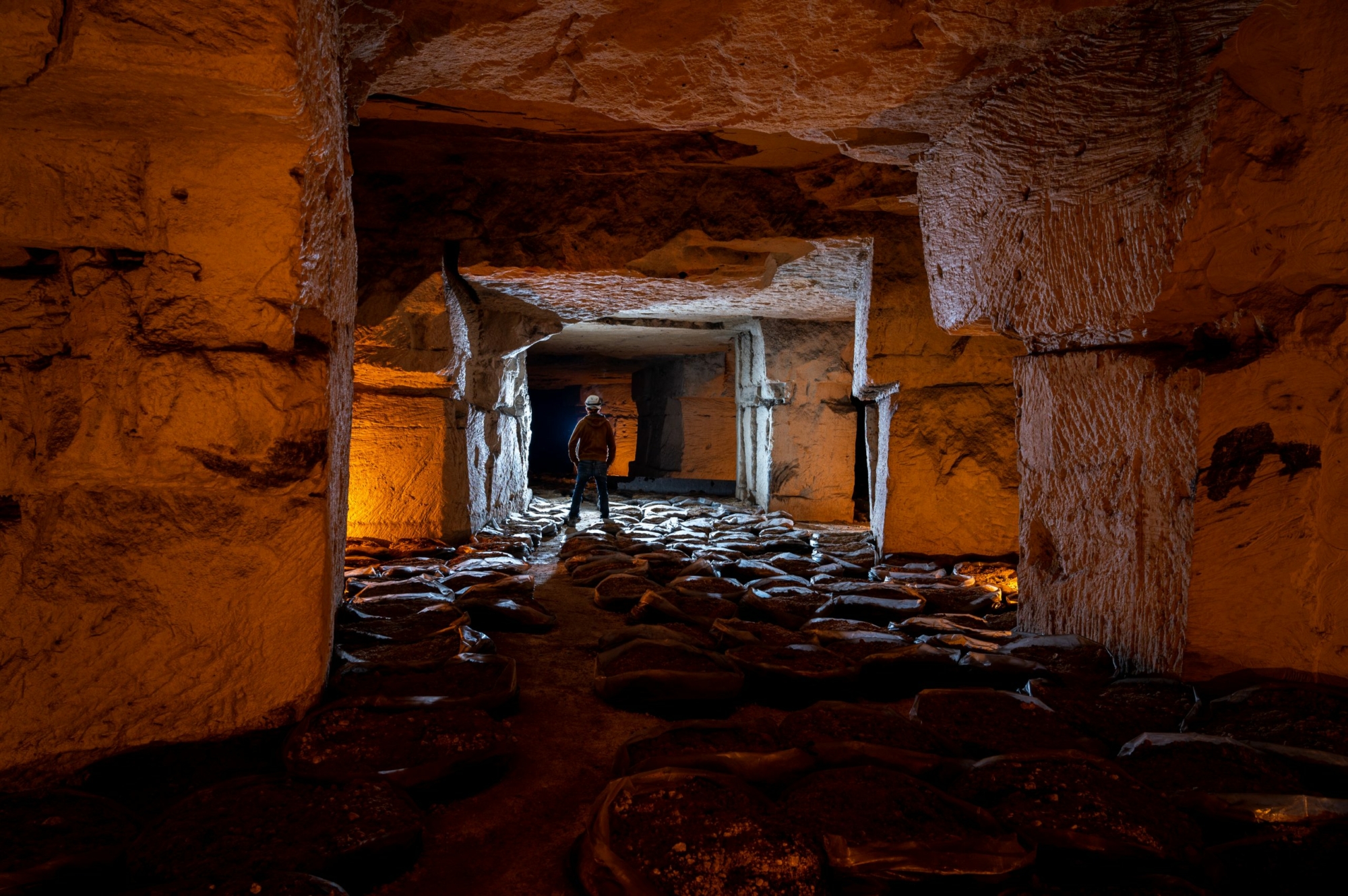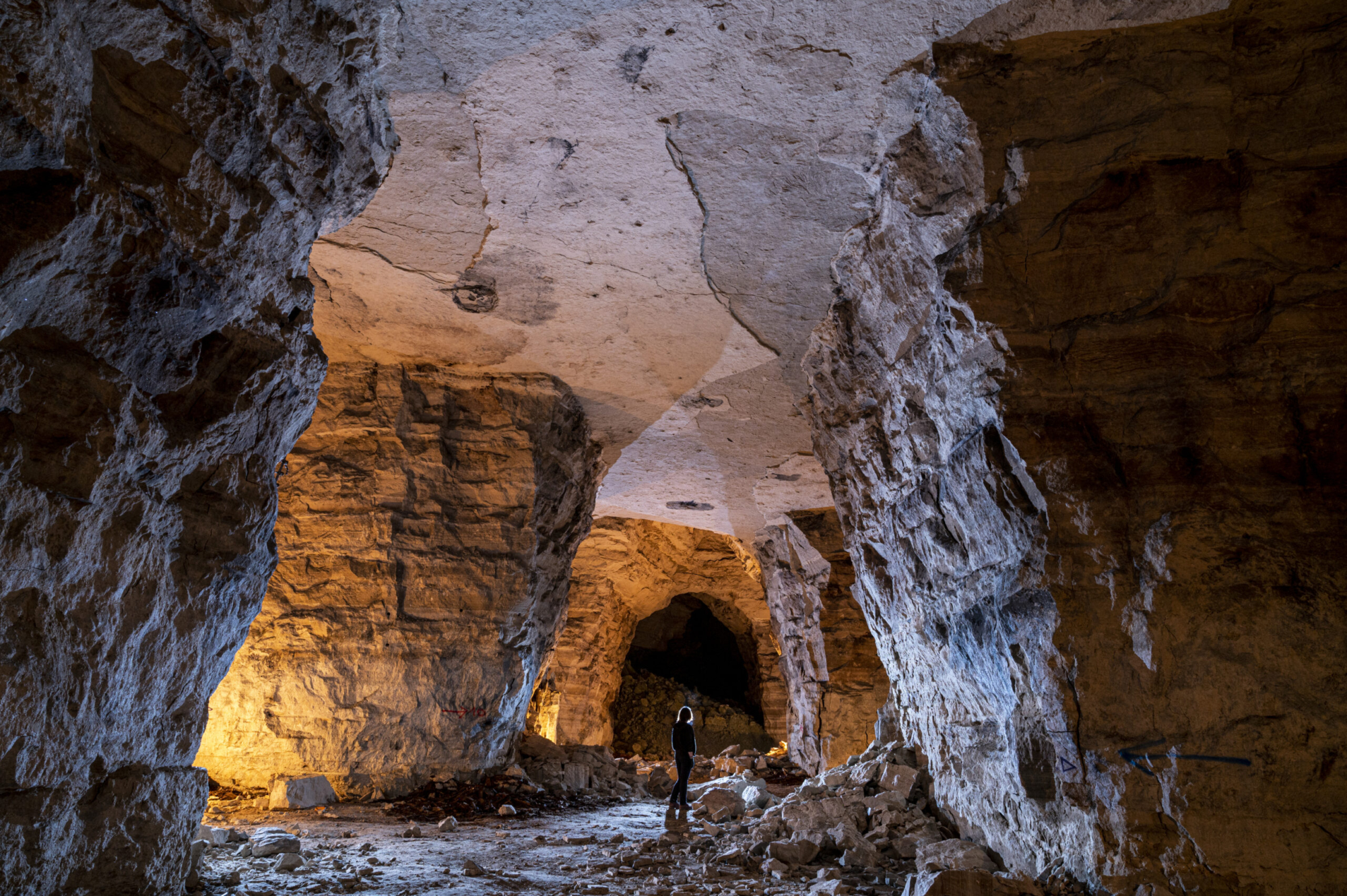 Piliers écaillés dans cette champignonnière. La surexploitation des sols cumulées à la surcharge des terrains de surface font flamber les piliers de masse de la carrière. Déjà très fragilisée par un premier effondrement en 1963 puis un second en 2001. C'est maintenant plus qu'une question de temps avant que cette zone se referme sur elle-même.