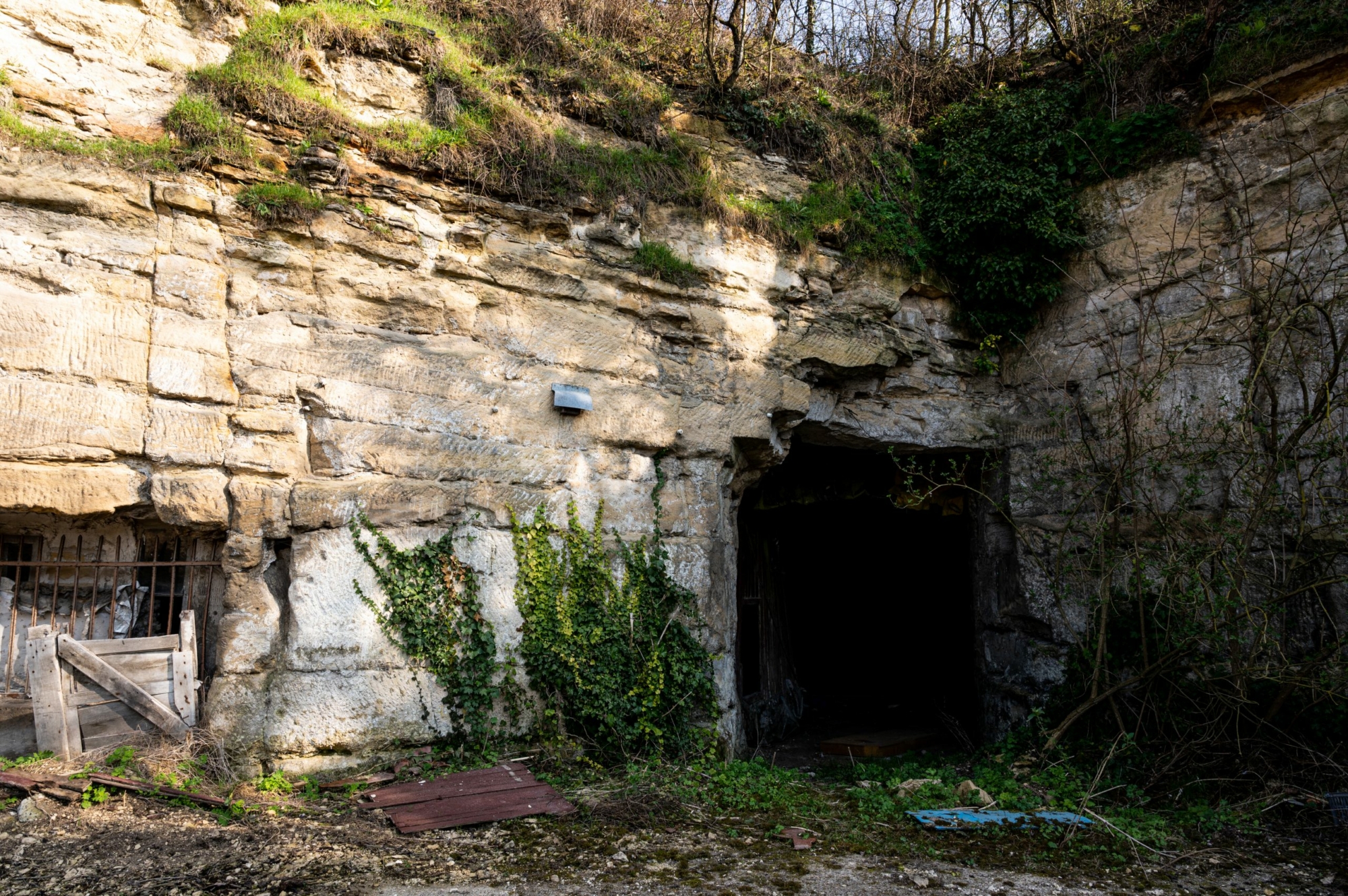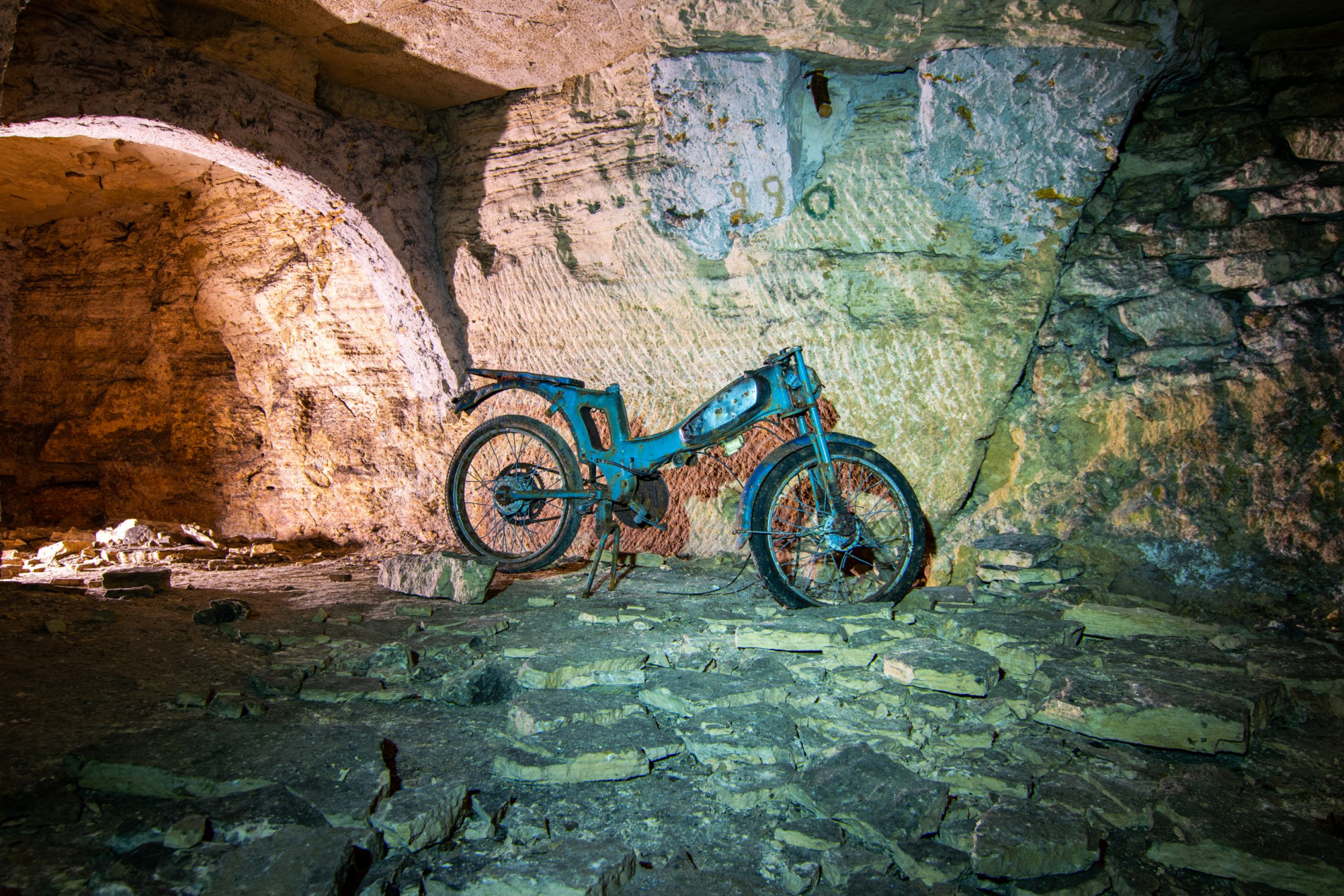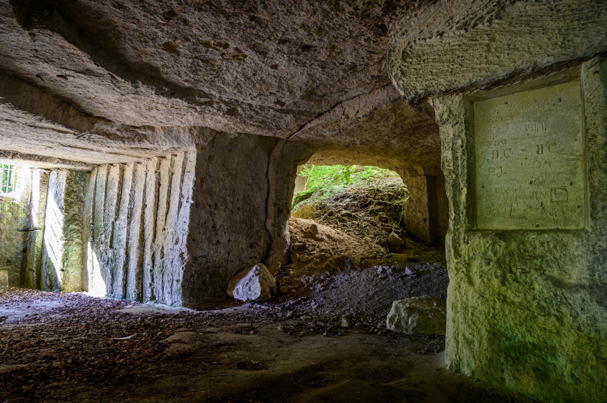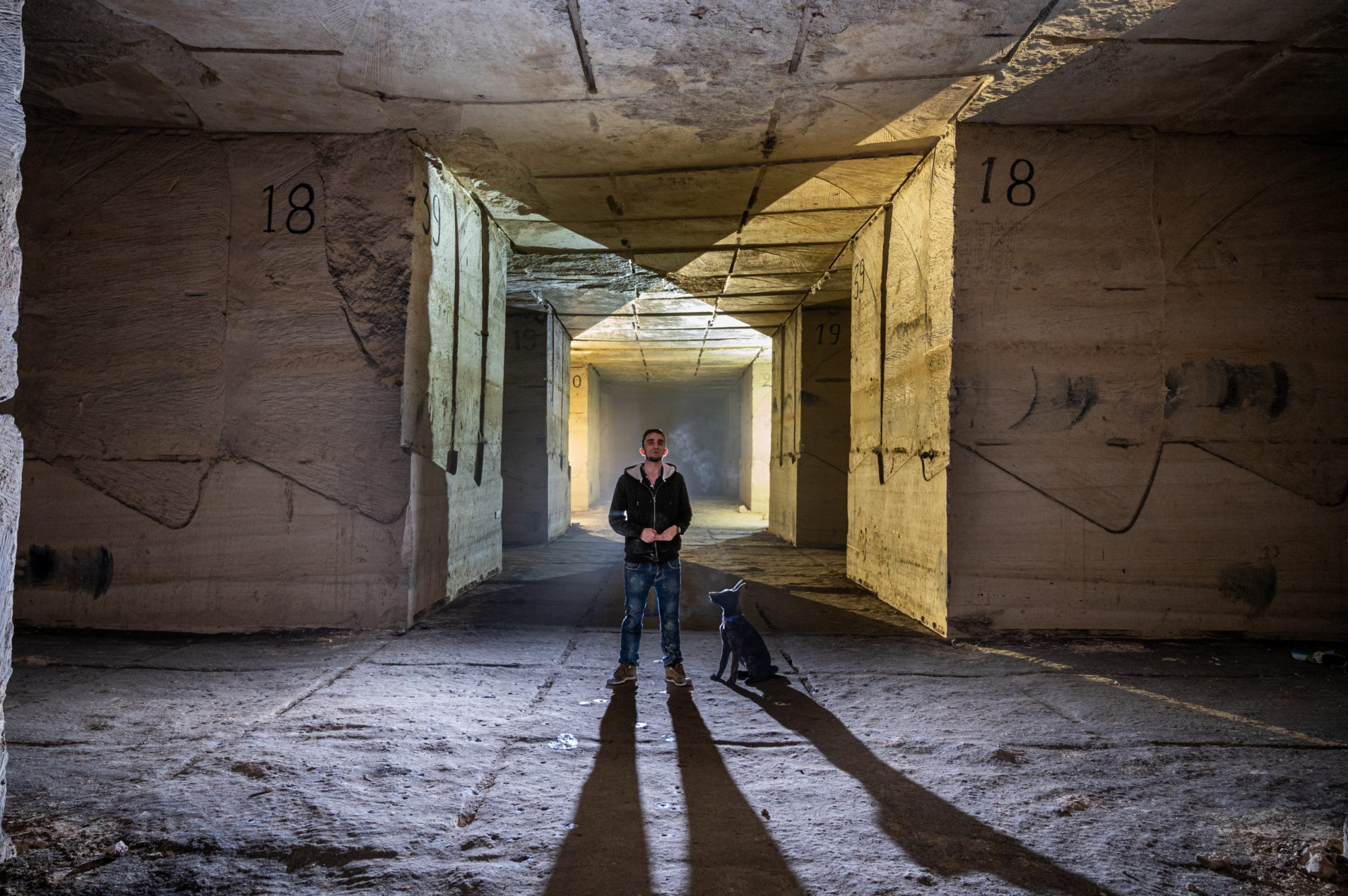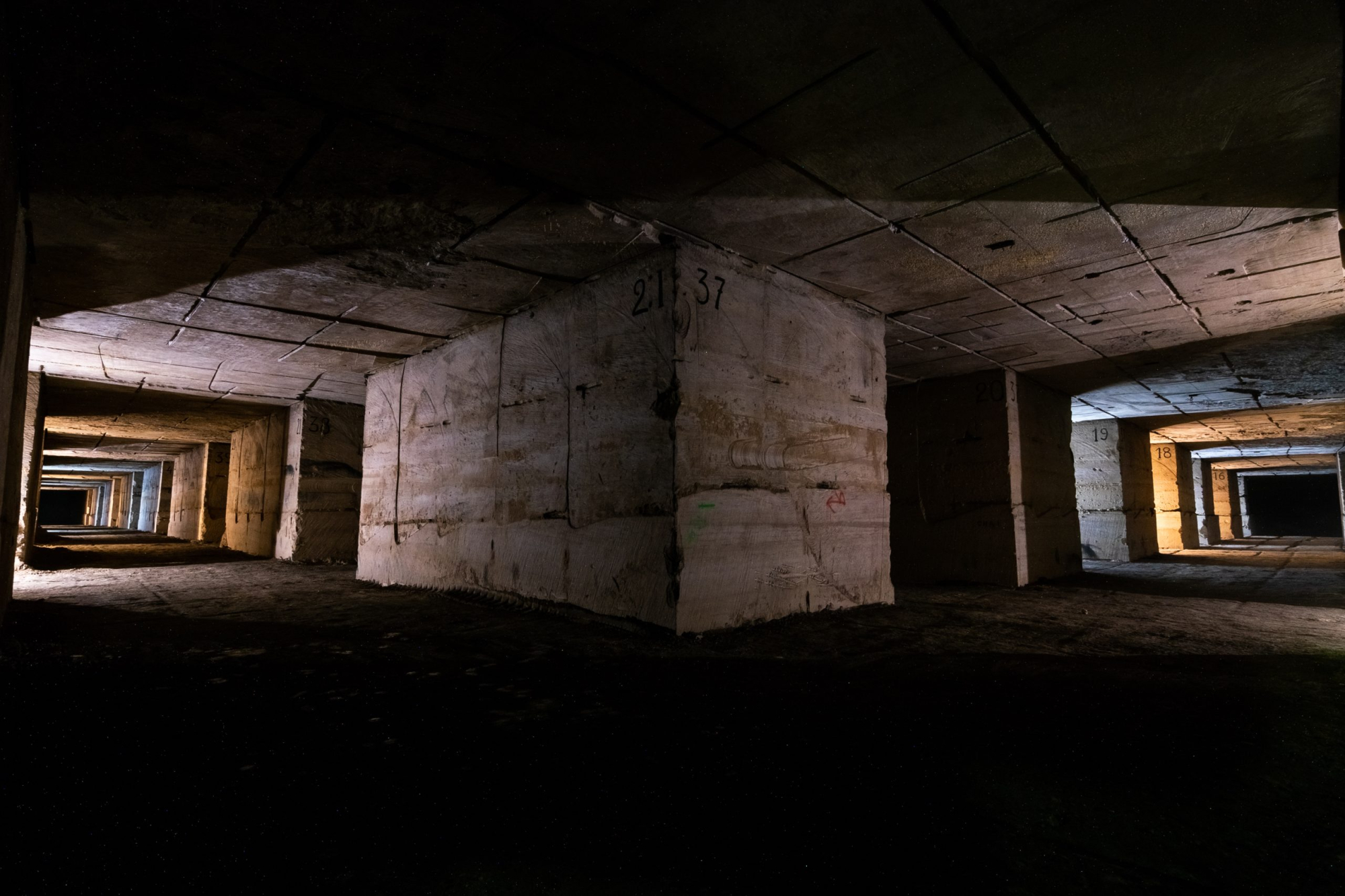 Piliers écaillés dans cette champignonnière. La surexploitation des sols cumulées à la surcharge des terrains de surface font flamber les piliers de masse de la carrière. Déjà très fragilisée par un premier effondrement en 1963 puis un second en 2001. C'est maintenant plus qu'une question de temps avant que cette zone se referme sur elle-même.