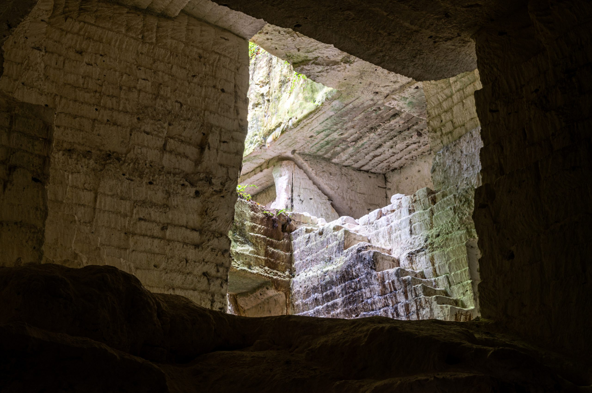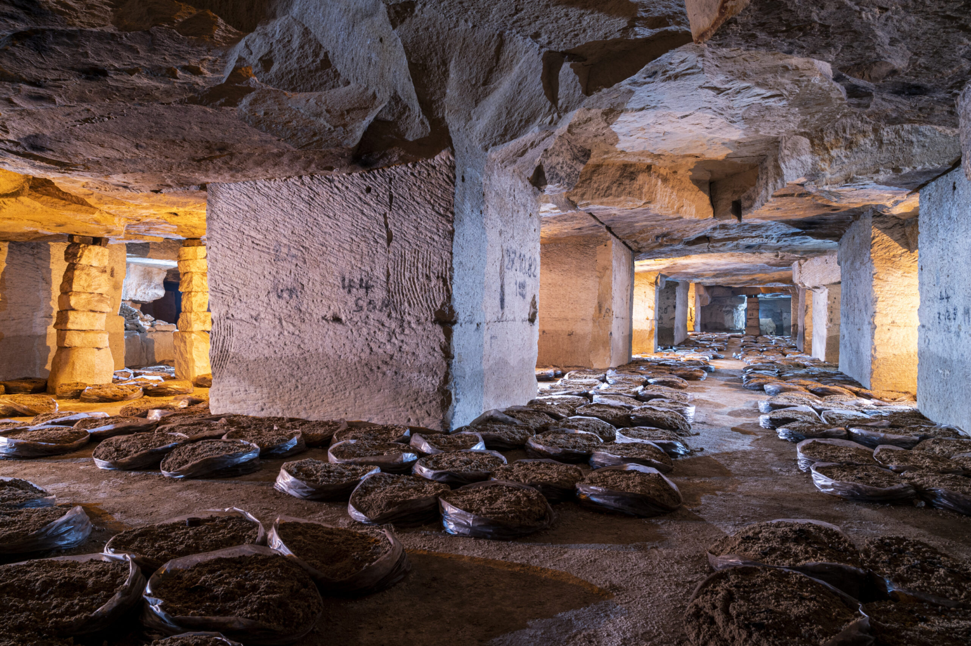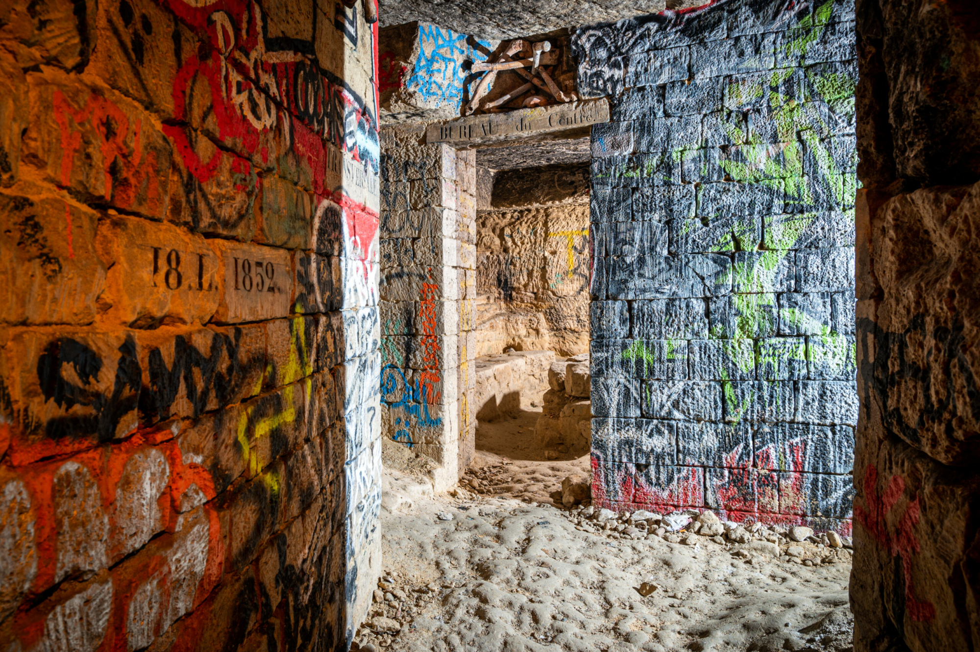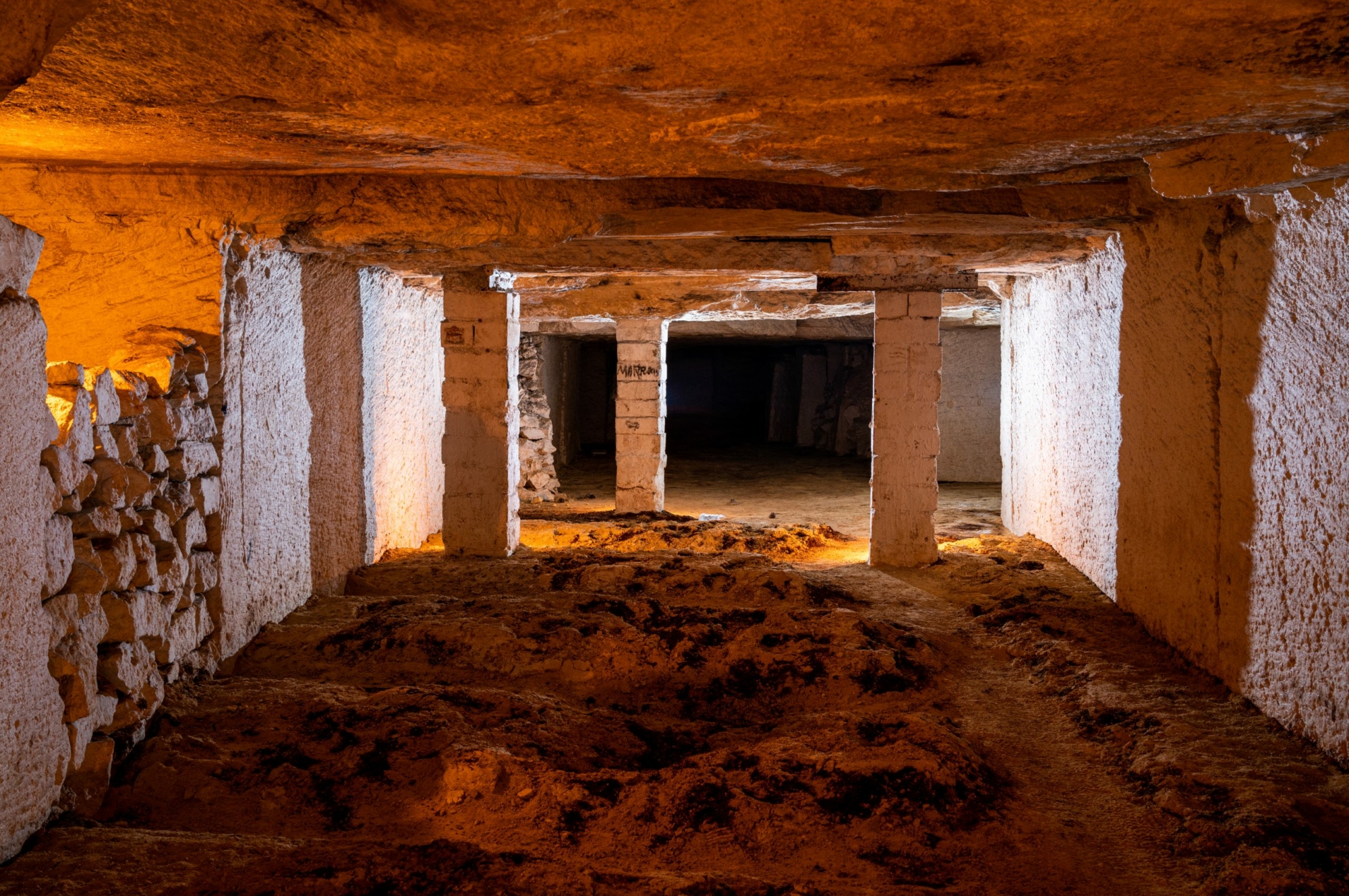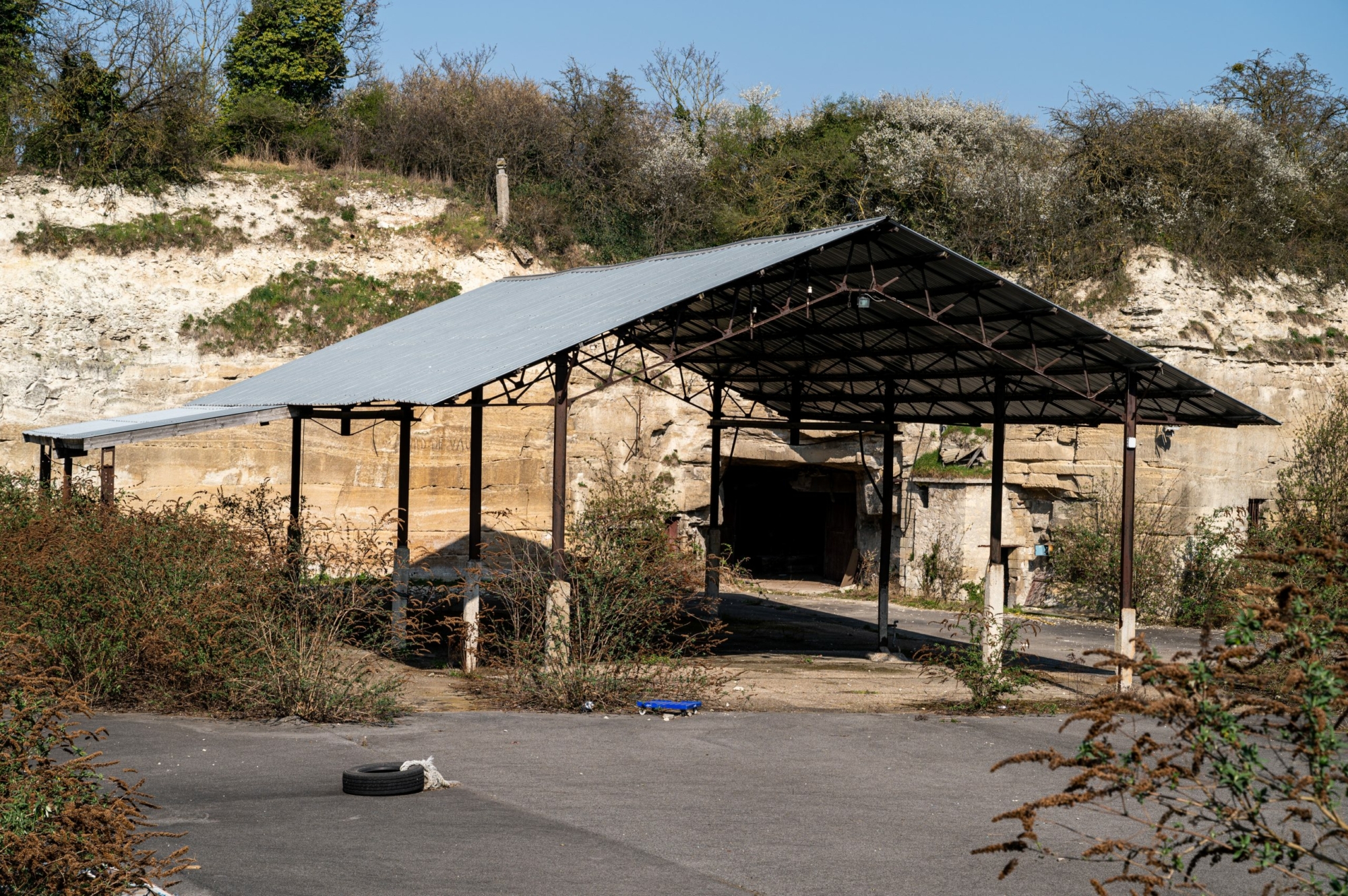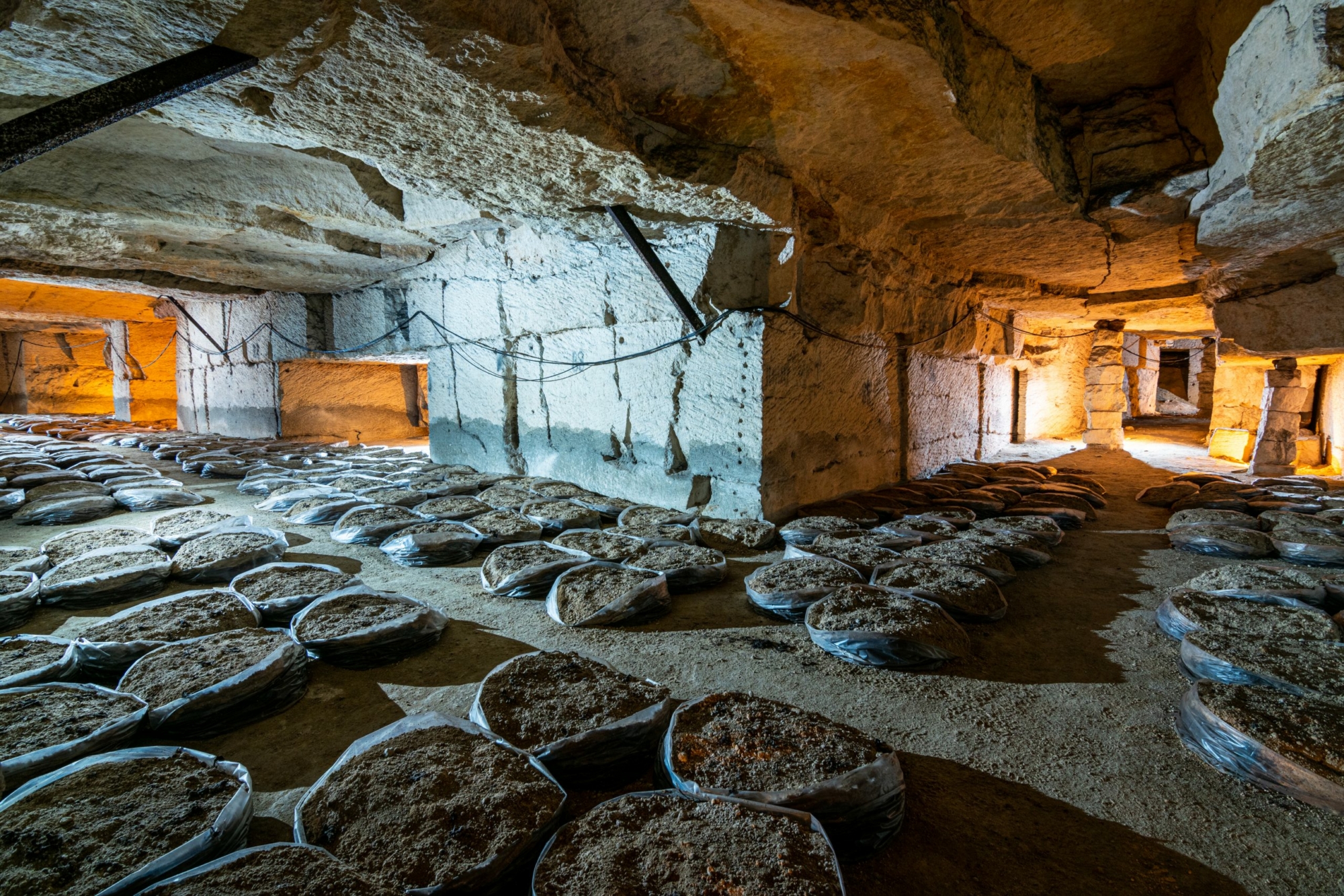 Piliers écaillés dans cette champignonnière. La surexploitation des sols cumulées à la surcharge des terrains de surface font flamber les piliers de masse de la carrière. Déjà très fragilisée par un premier effondrement en 1963 puis un second en 2001. C'est maintenant plus qu'une question de temps avant que cette zone se referme sur elle-même.