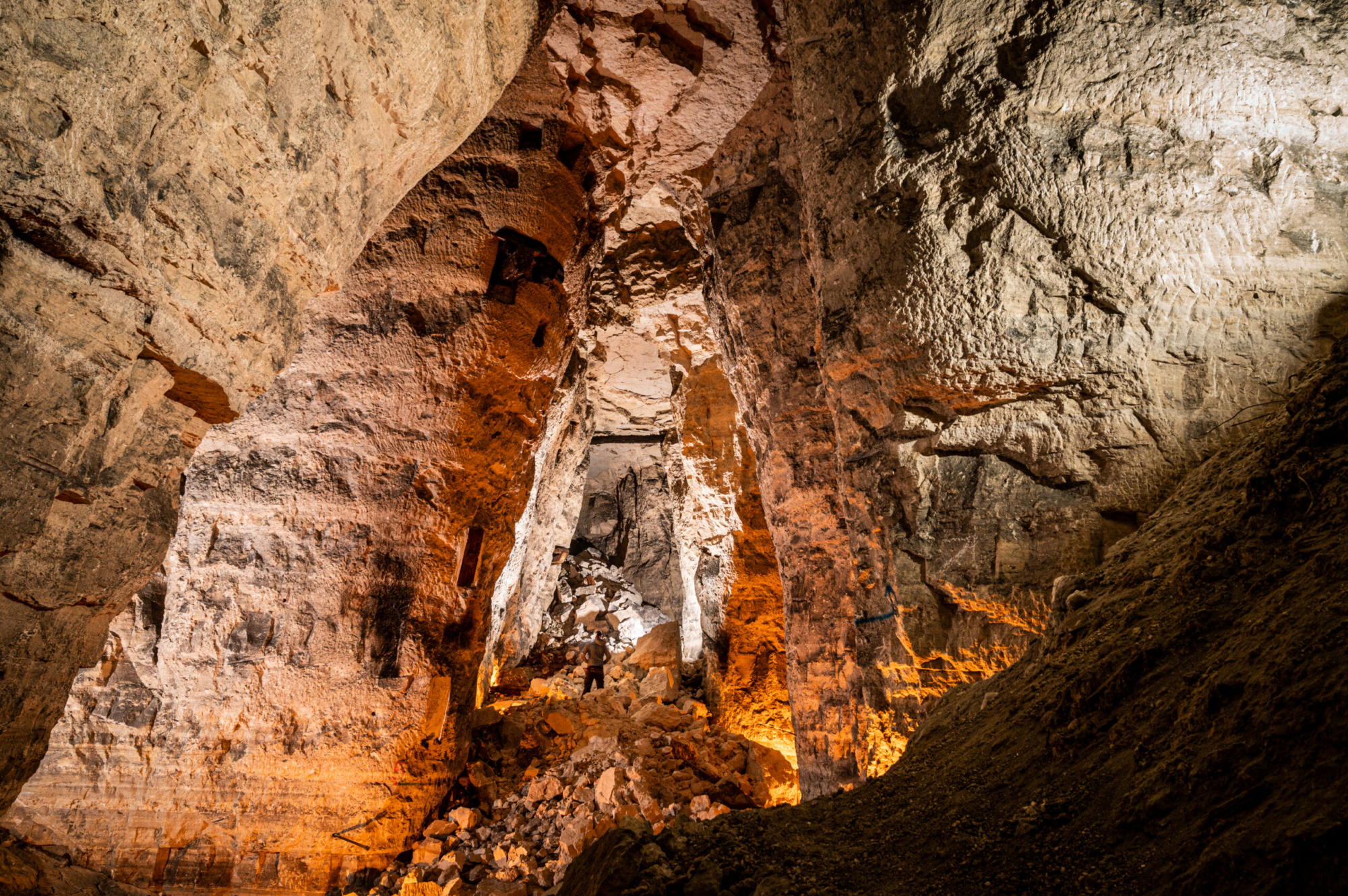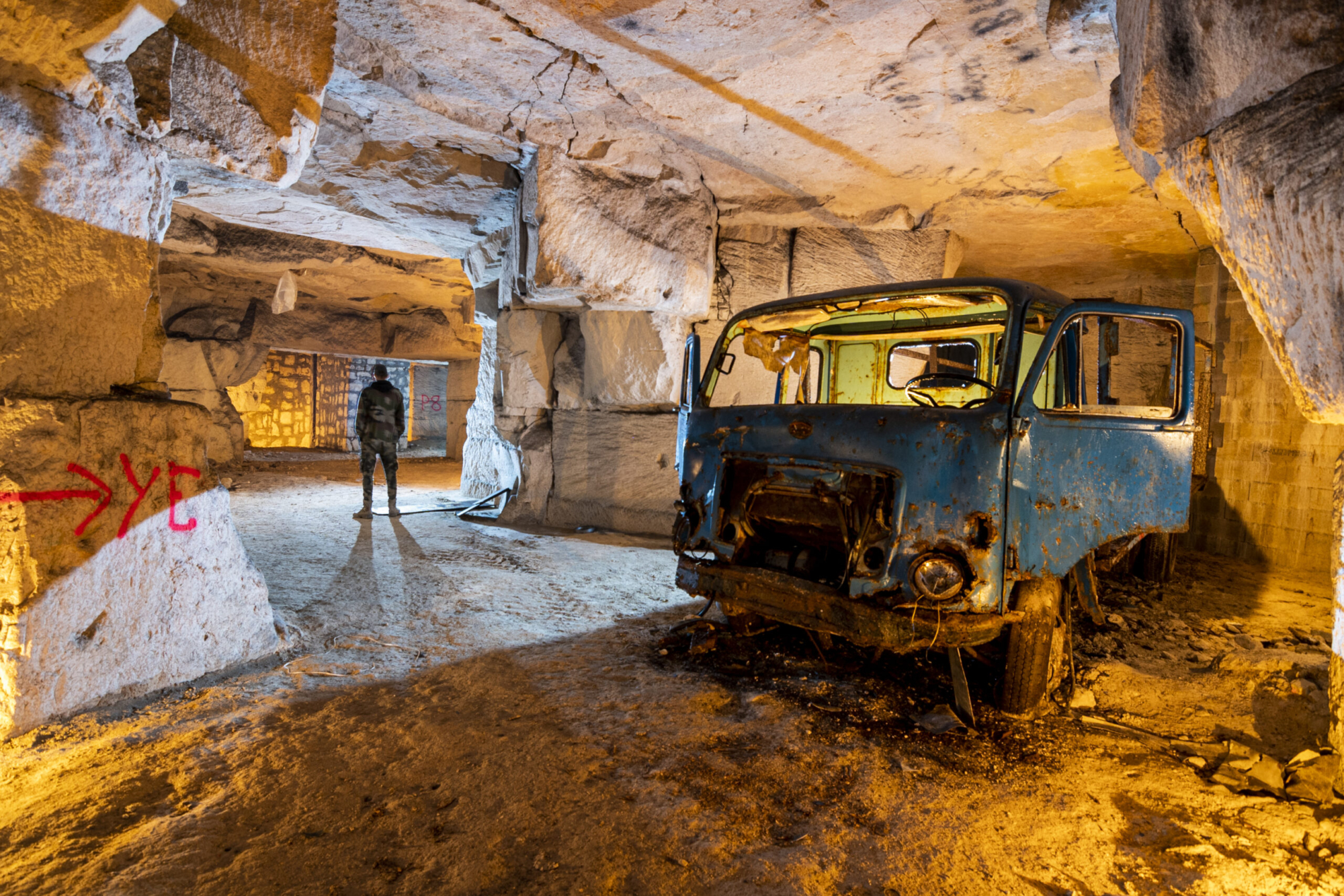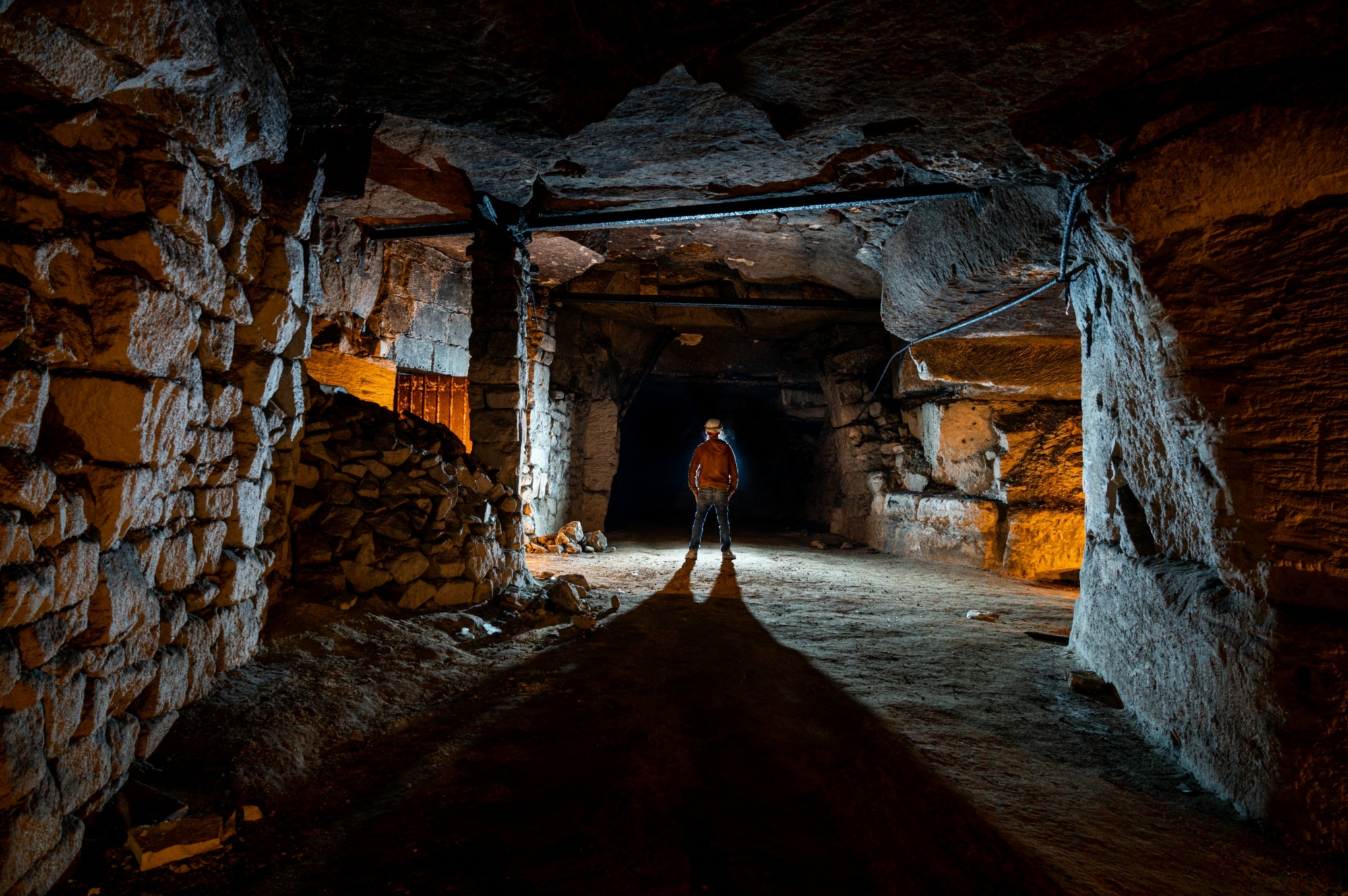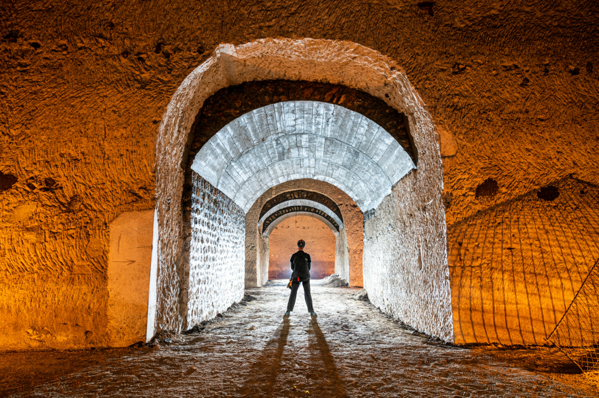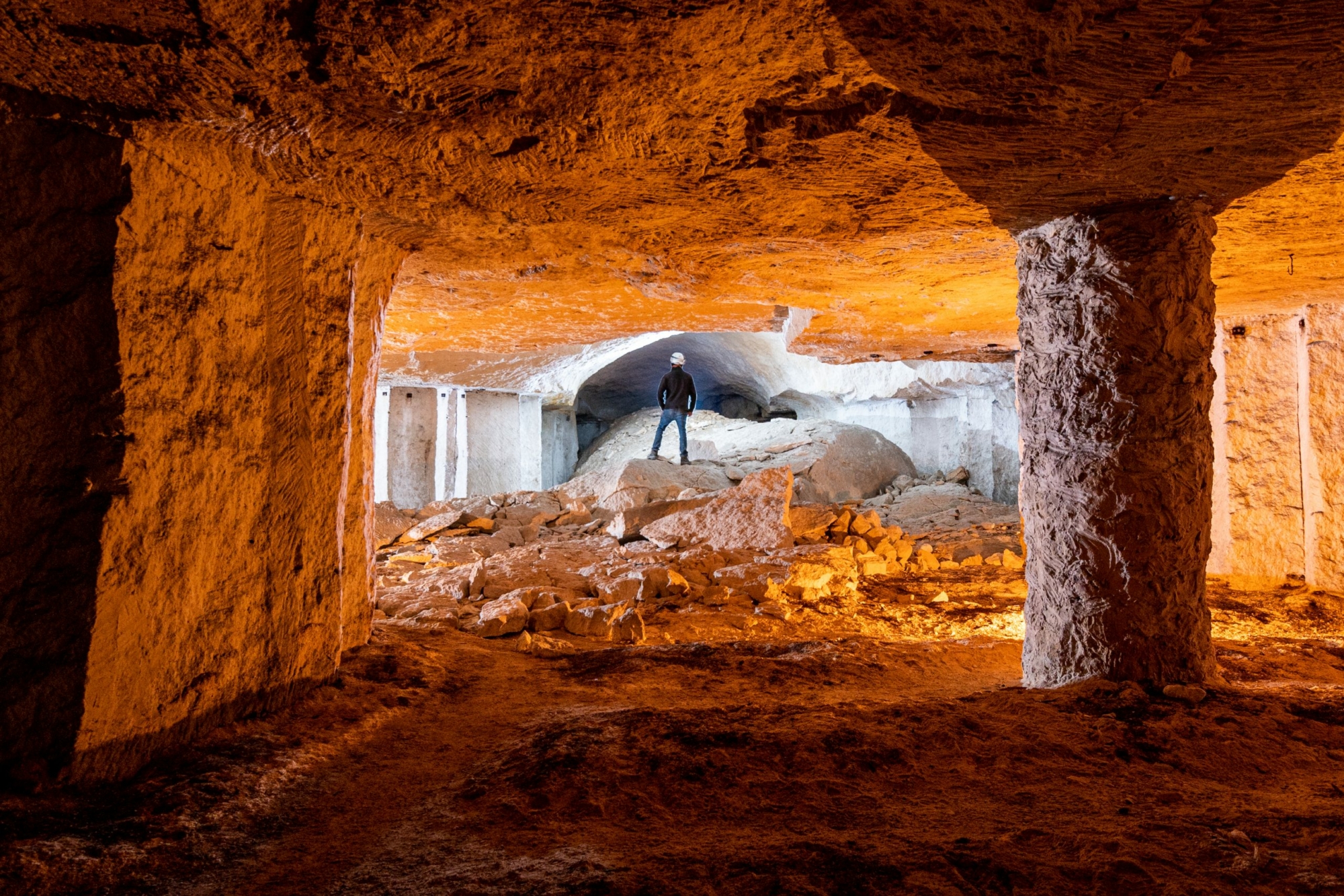 Piliers écaillés dans cette champignonnière. La surexploitation des sols cumulées à la surcharge des terrains de surface font flamber les piliers de masse de la carrière. Déjà très fragilisée par un premier effondrement en 1963 puis un second en 2001. C'est maintenant plus qu'une question de temps avant que cette zone se referme sur elle-même.