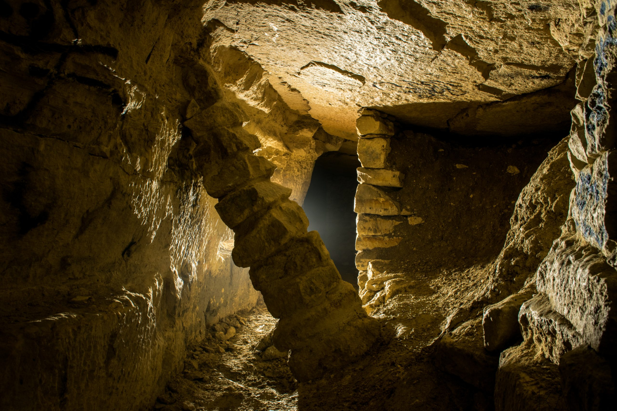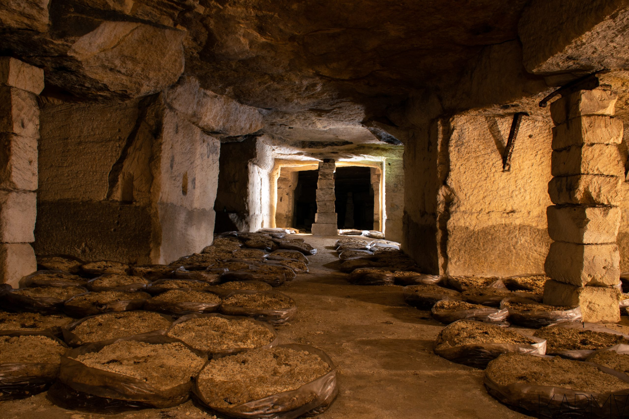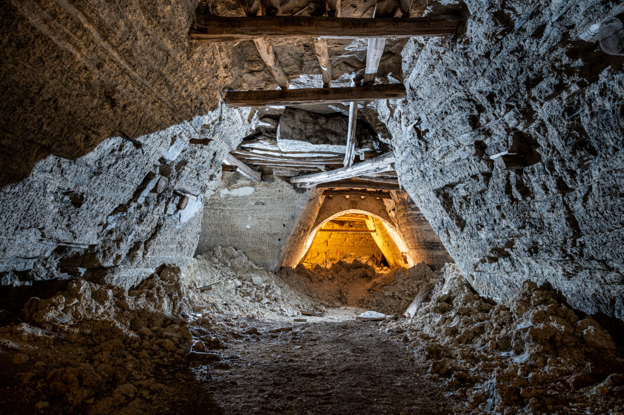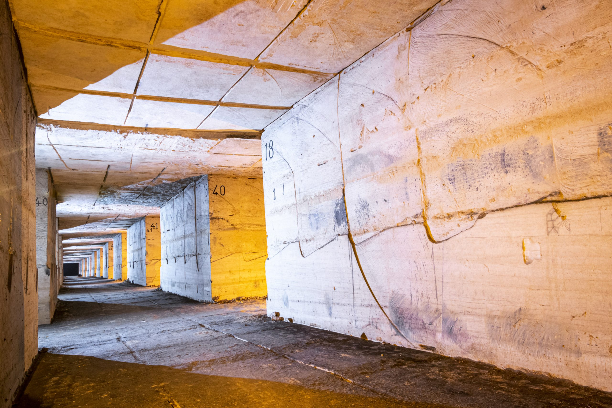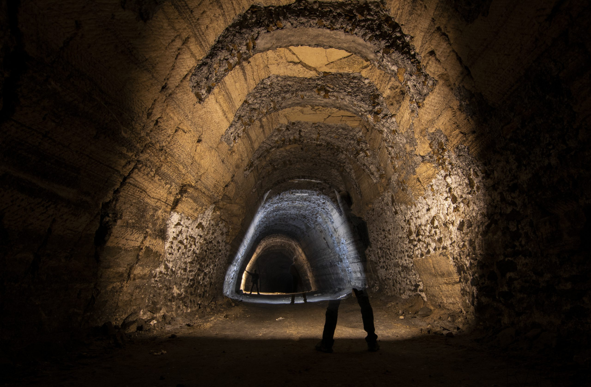 Piliers écaillés dans cette champignonnière. La surexploitation des sols cumulées à la surcharge des terrains de surface font flamber les piliers de masse de la carrière. Déjà très fragilisée par un premier effondrement en 1963 puis un second en 2001. C'est maintenant plus qu'une question de temps avant que cette zone se referme sur elle-même.