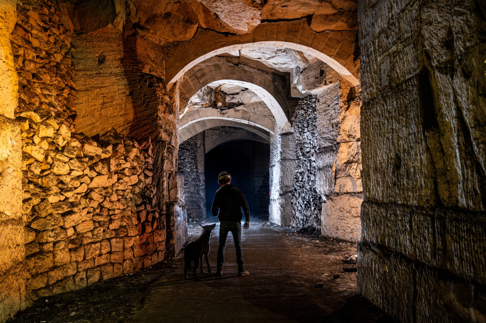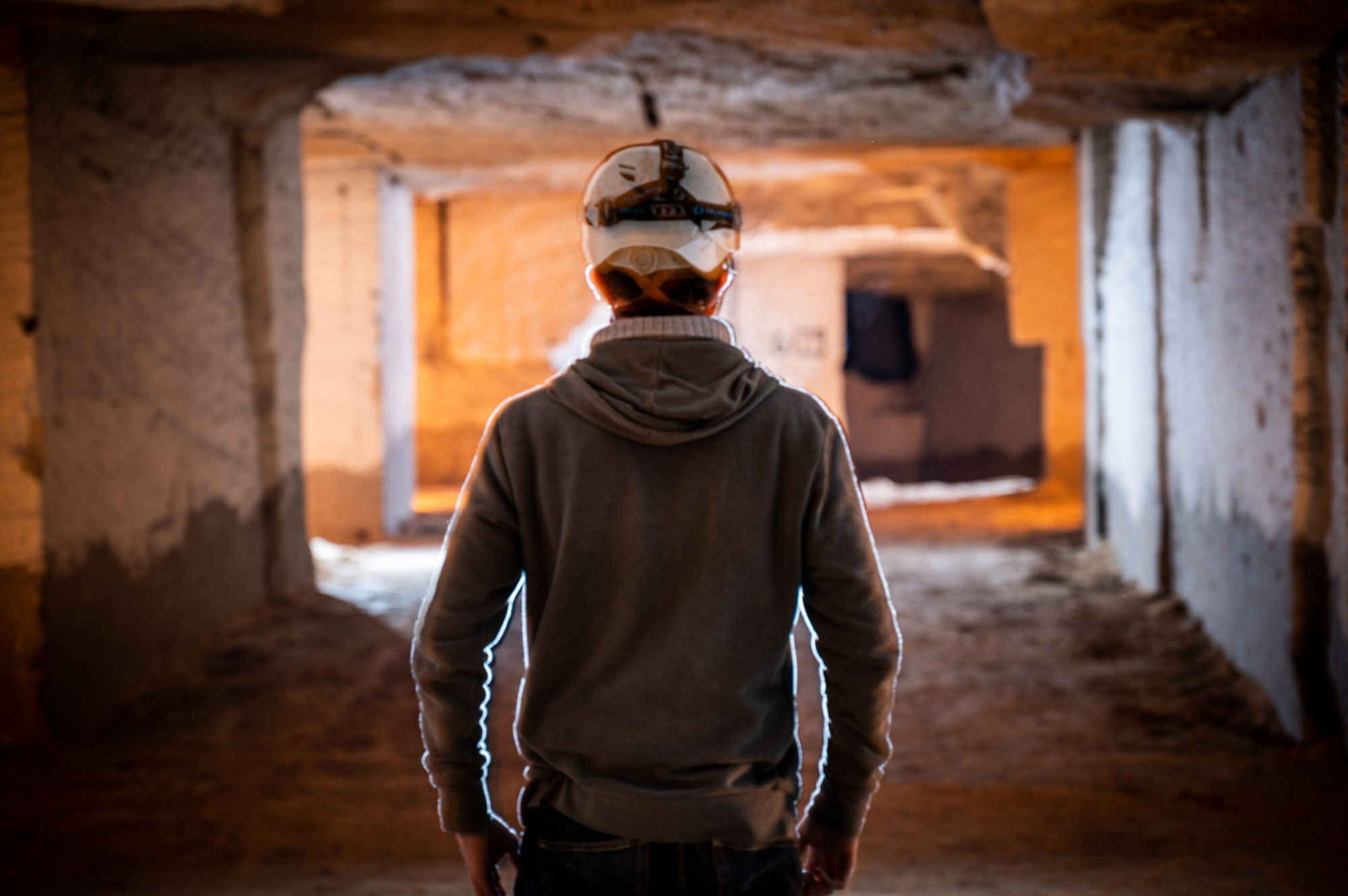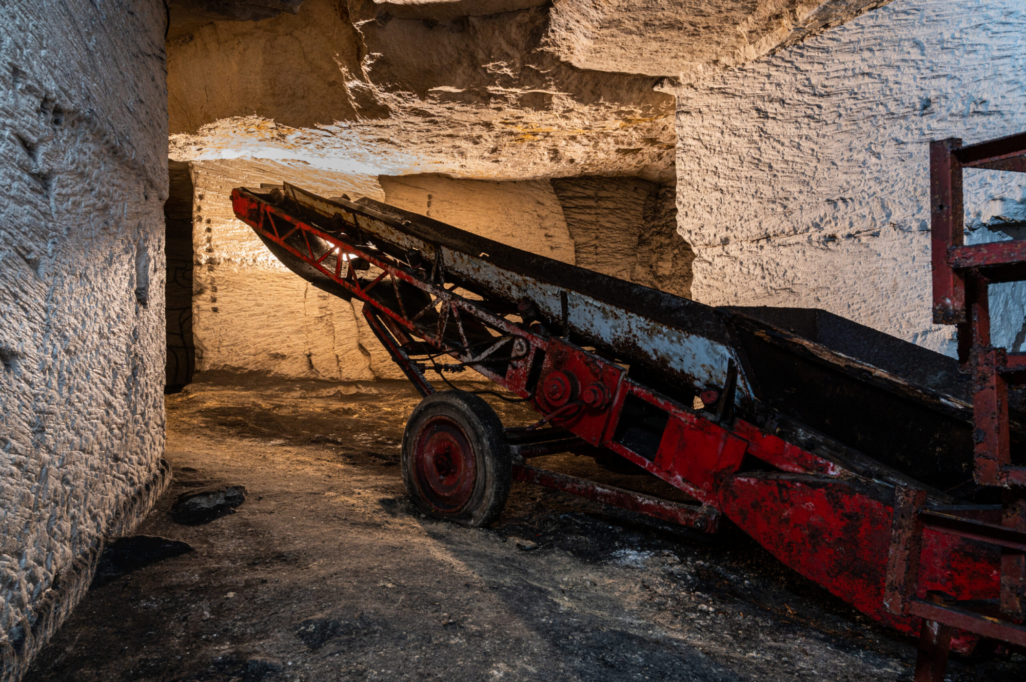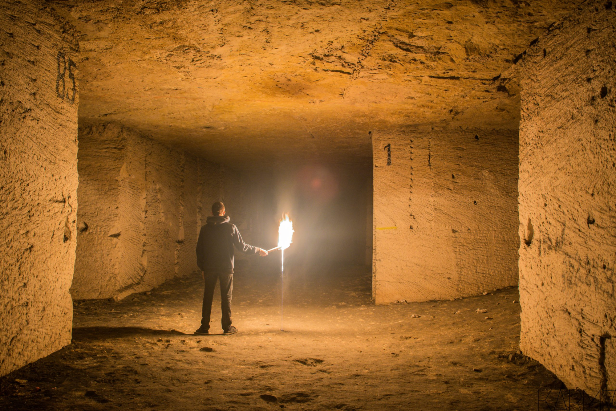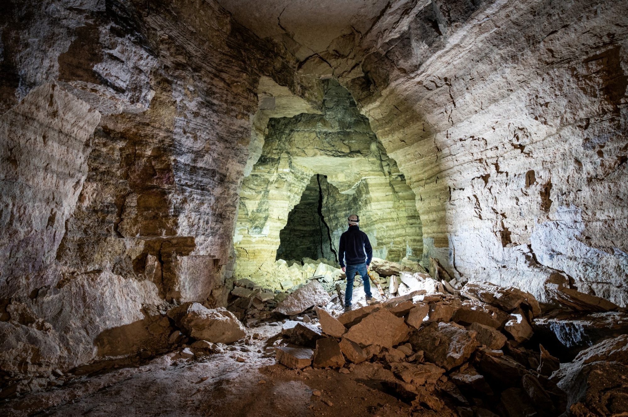 Piliers écaillés dans cette champignonnière. La surexploitation des sols cumulées à la surcharge des terrains de surface font flamber les piliers de masse de la carrière. Déjà très fragilisée par un premier effondrement en 1963 puis un second en 2001. C'est maintenant plus qu'une question de temps avant que cette zone se referme sur elle-même.