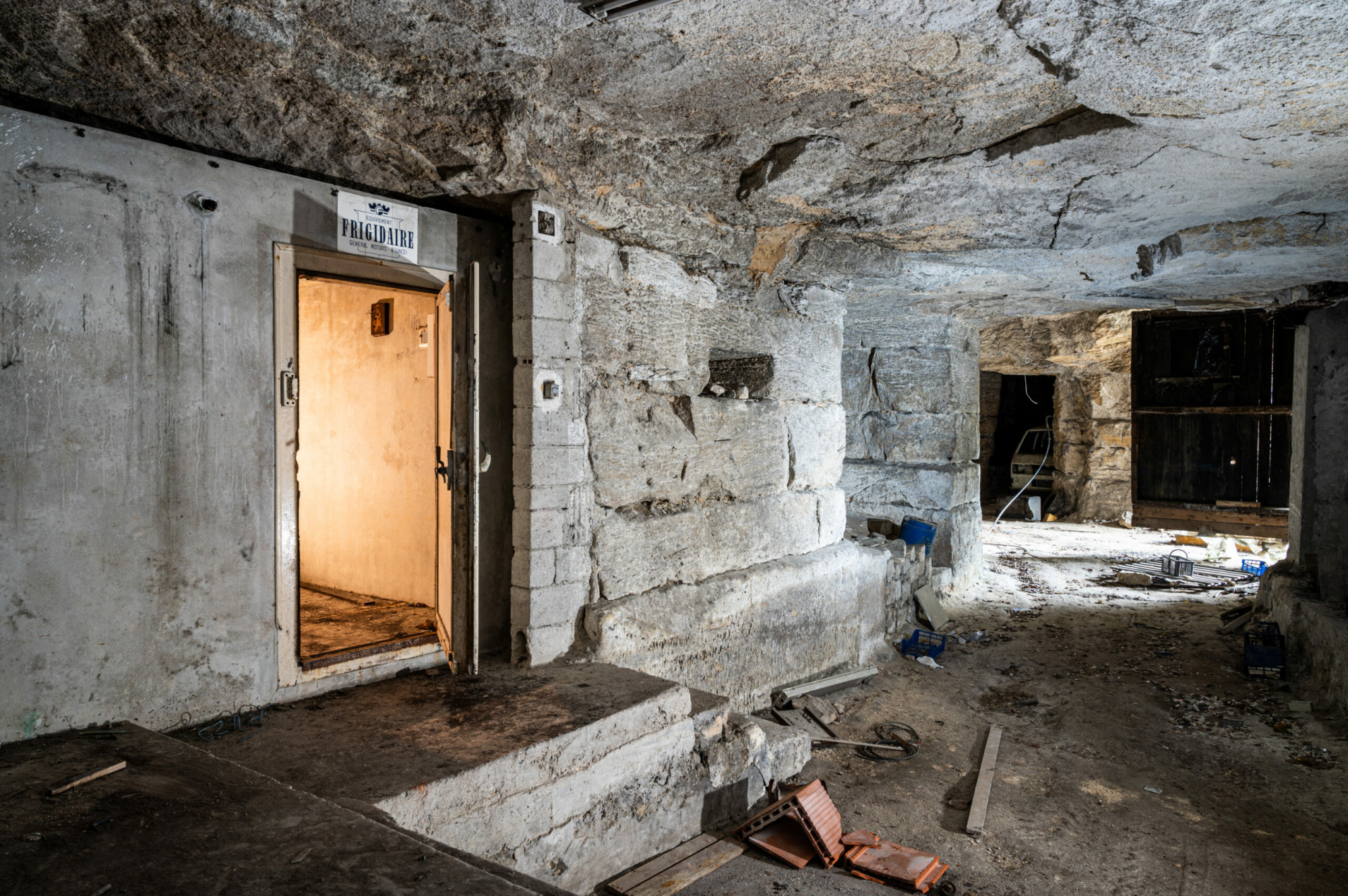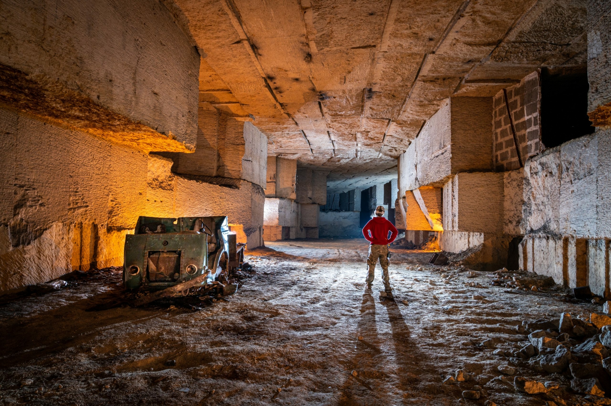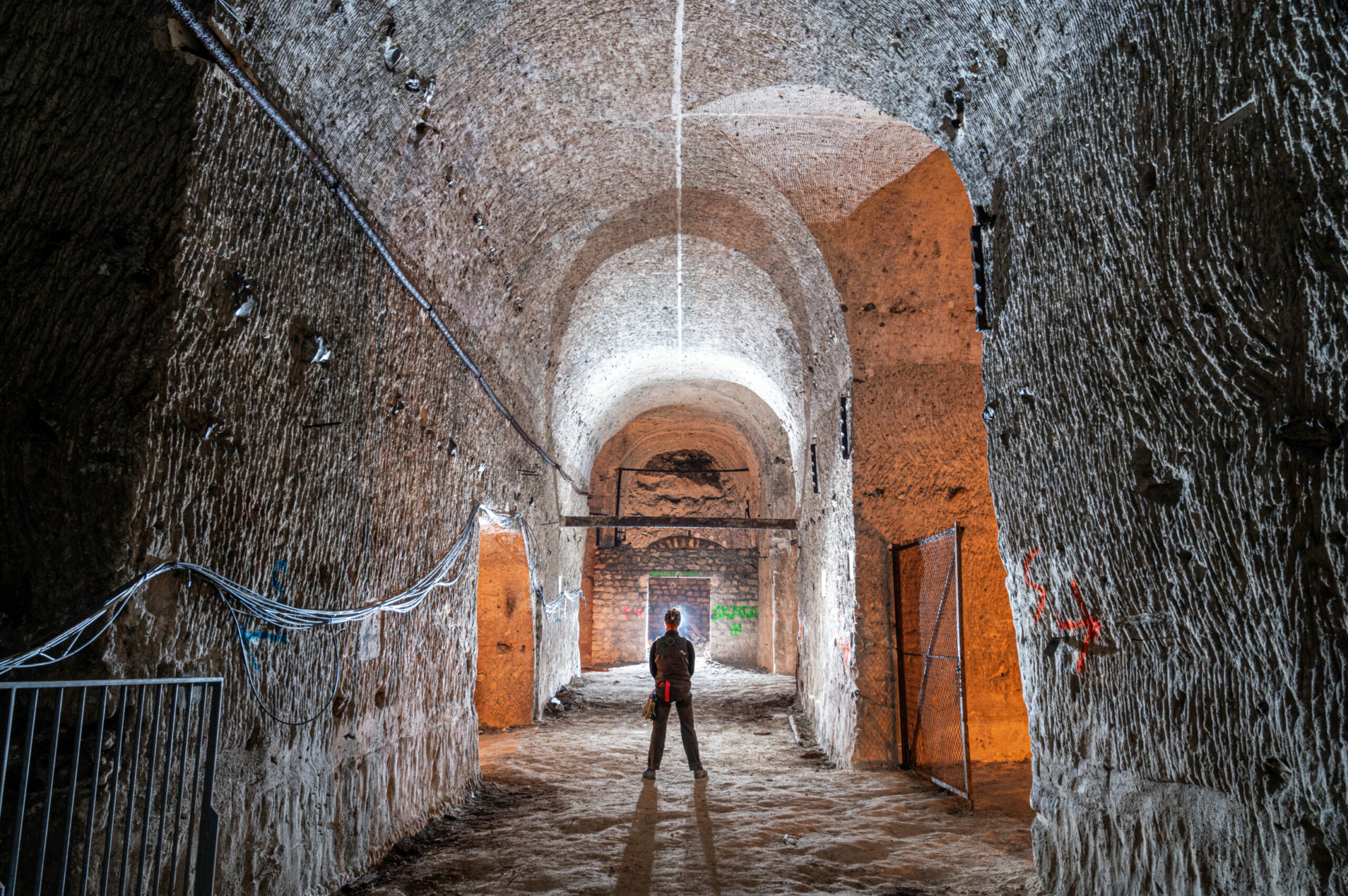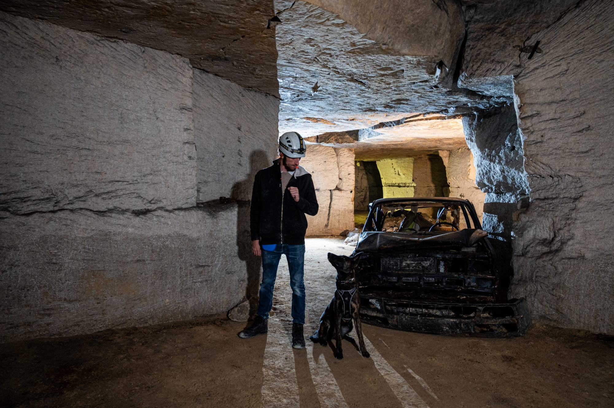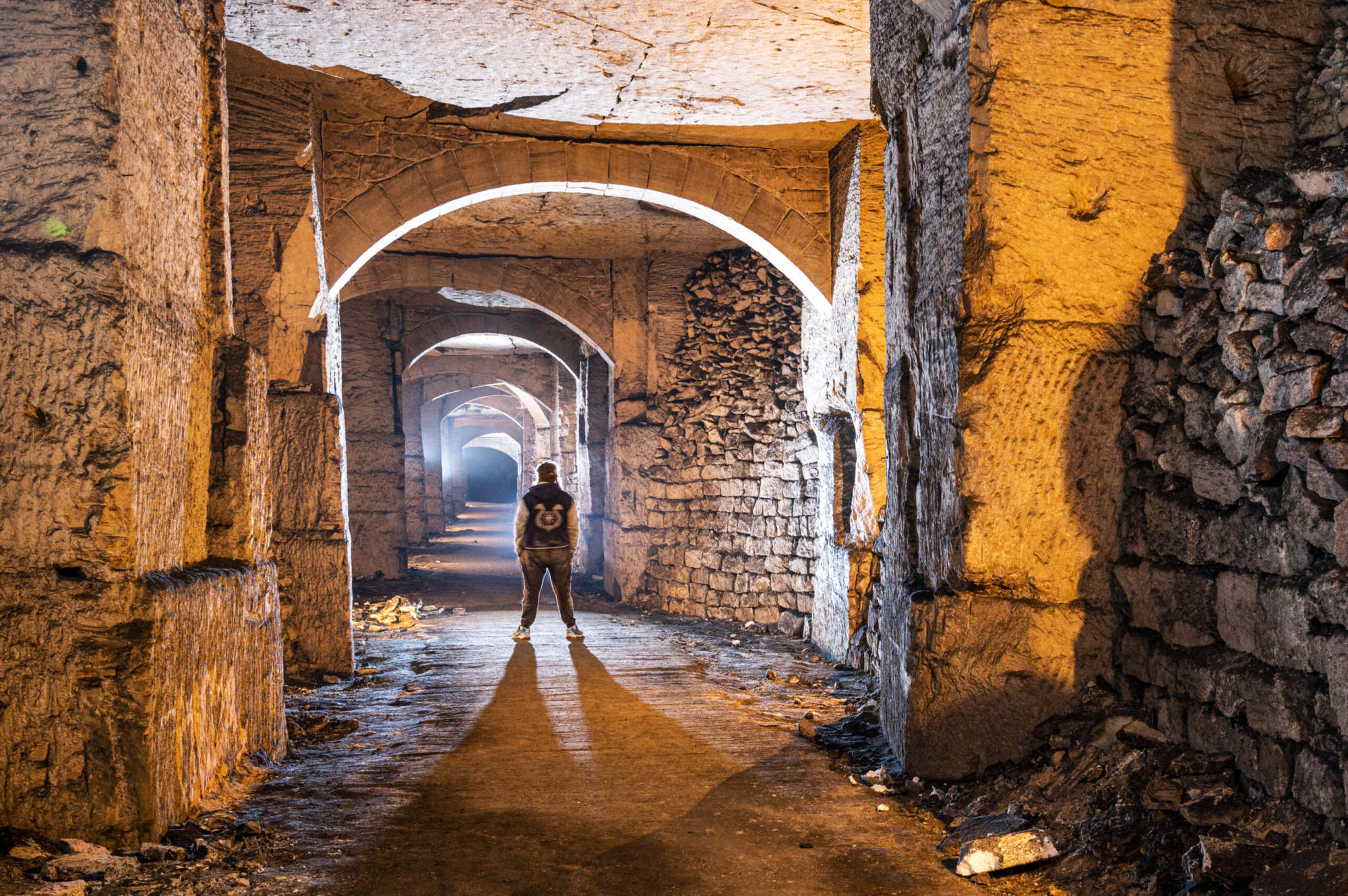 Piliers écaillés dans cette champignonnière. La surexploitation des sols cumulées à la surcharge des terrains de surface font flamber les piliers de masse de la carrière. Déjà très fragilisée par un premier effondrement en 1963 puis un second en 2001. C'est maintenant plus qu'une question de temps avant que cette zone se referme sur elle-même.
