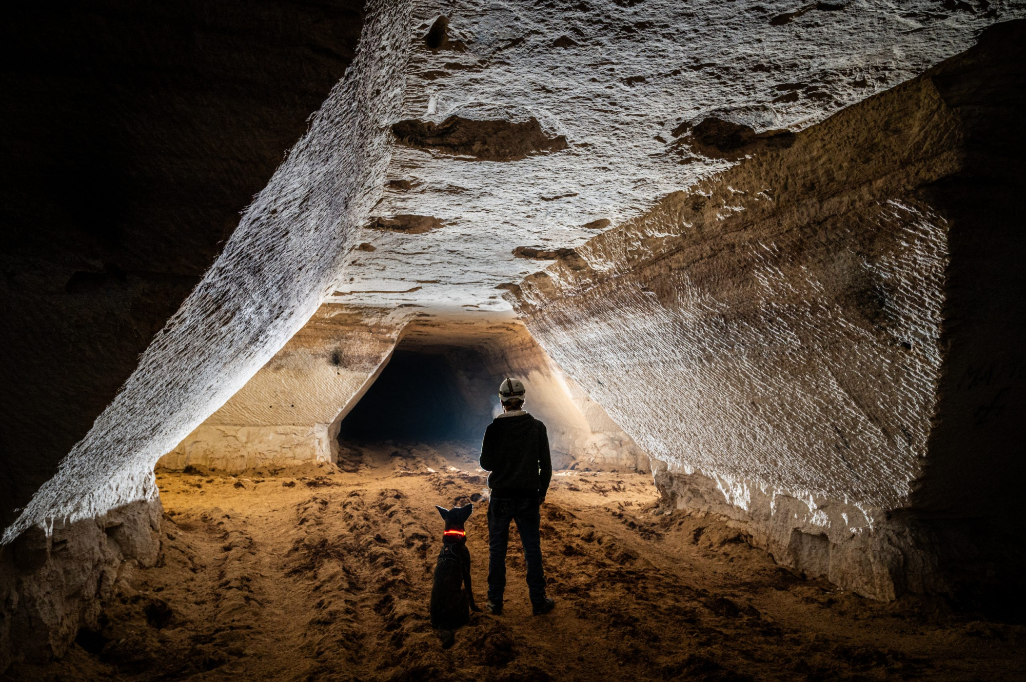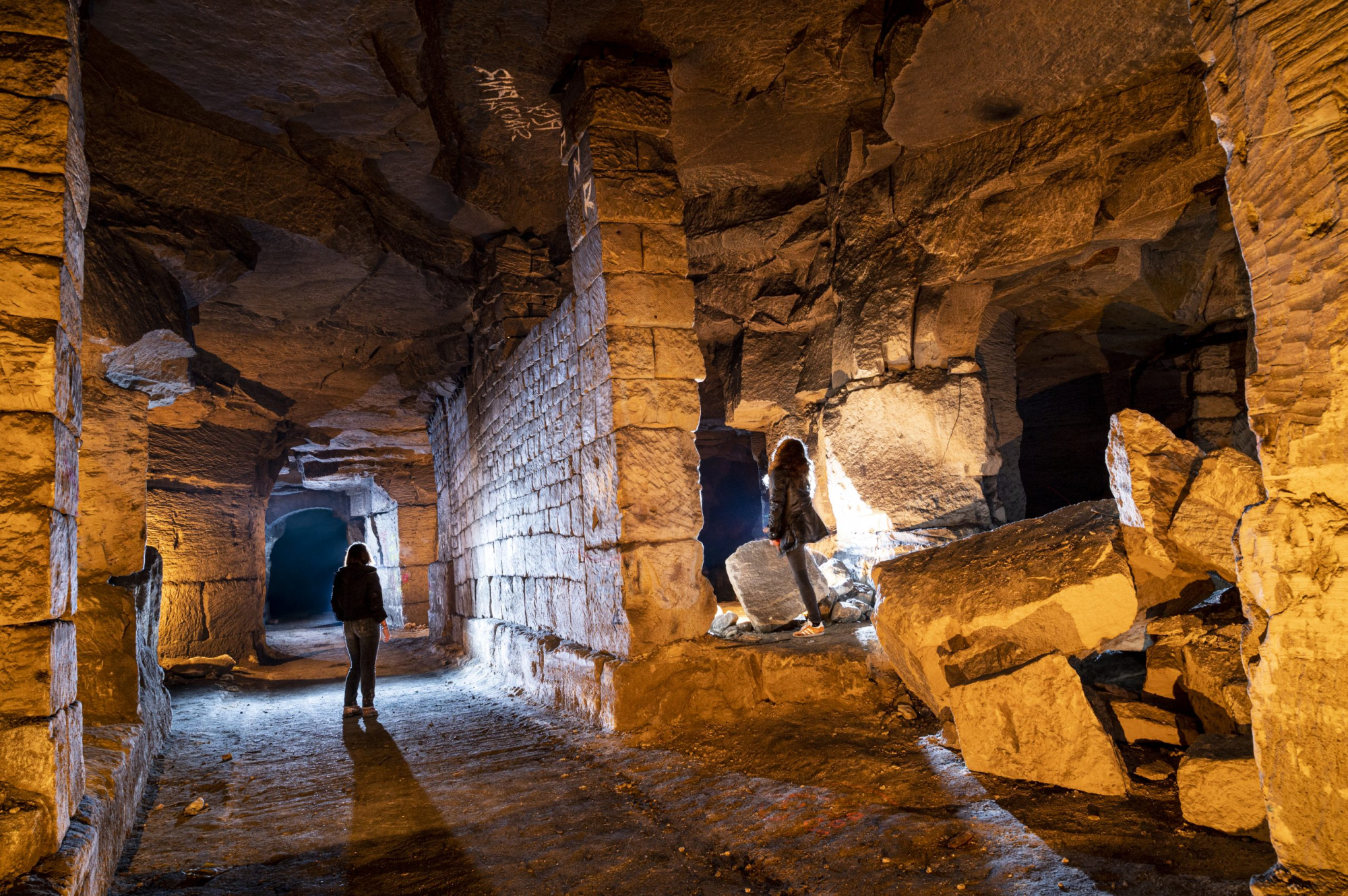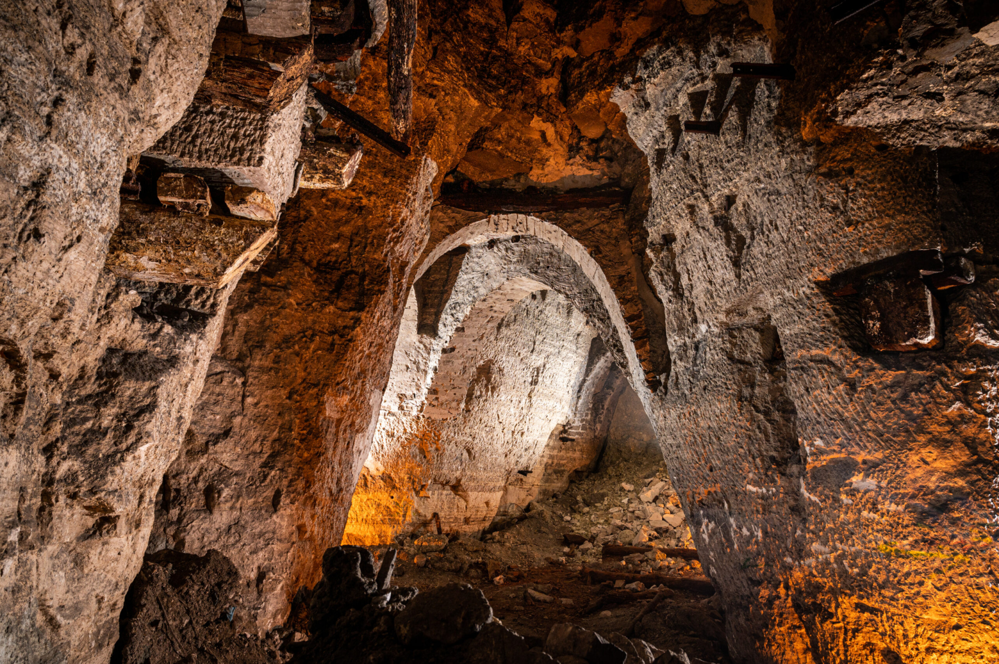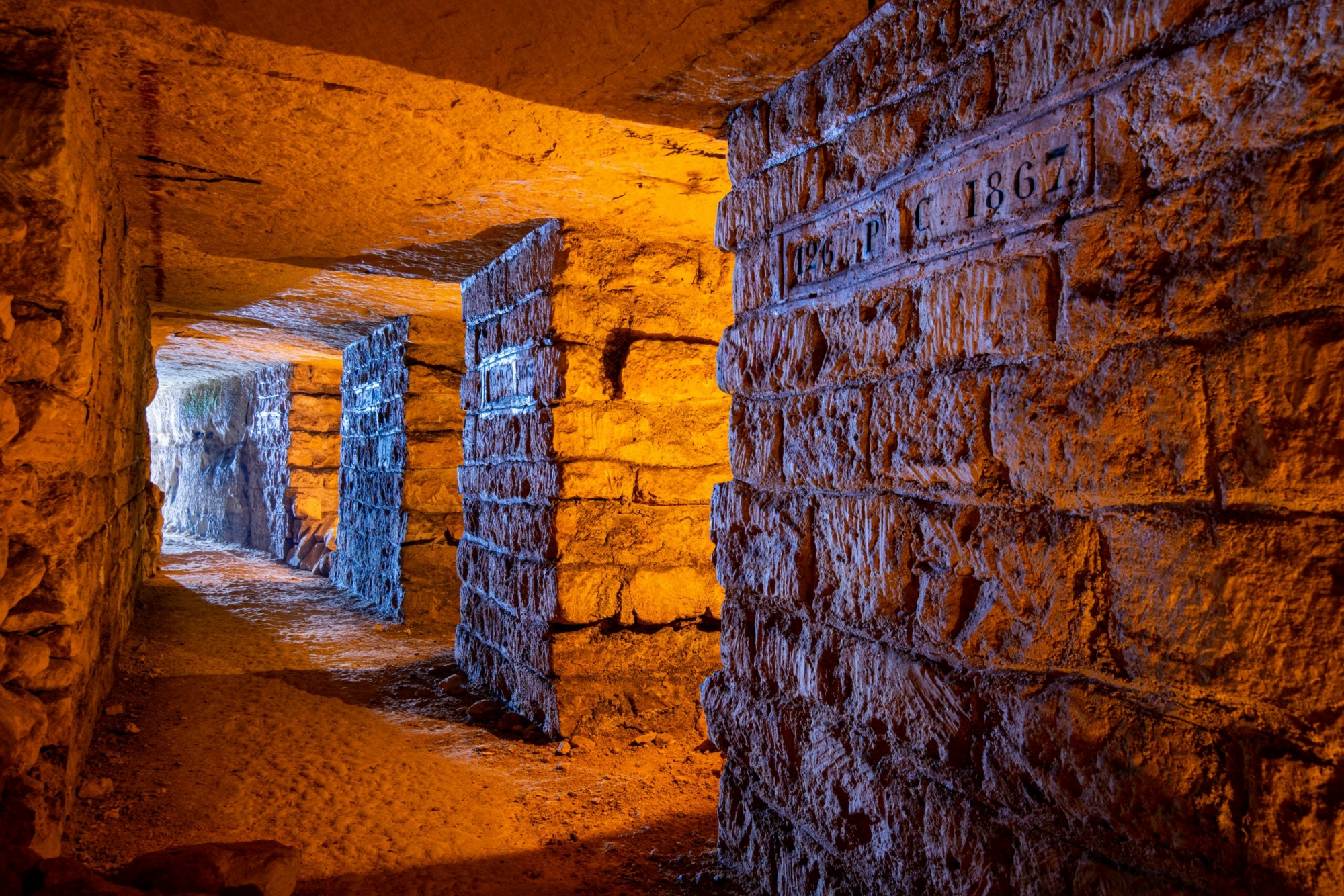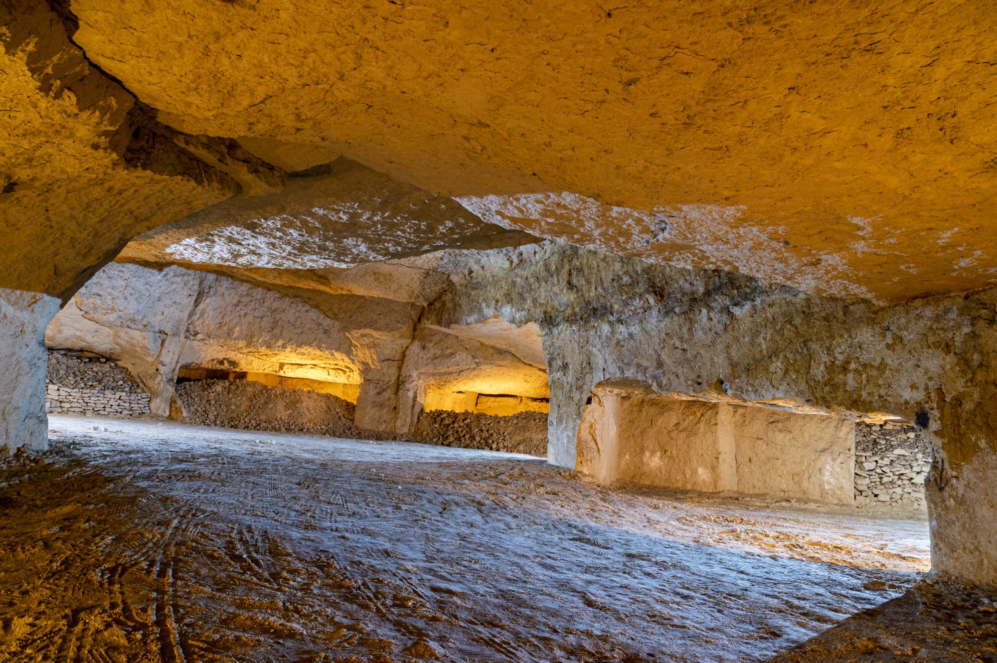 Piliers écaillés dans cette champignonnière. La surexploitation des sols cumulées à la surcharge des terrains de surface font flamber les piliers de masse de la carrière. Déjà très fragilisée par un premier effondrement en 1963 puis un second en 2001. C'est maintenant plus qu'une question de temps avant que cette zone se referme sur elle-même.