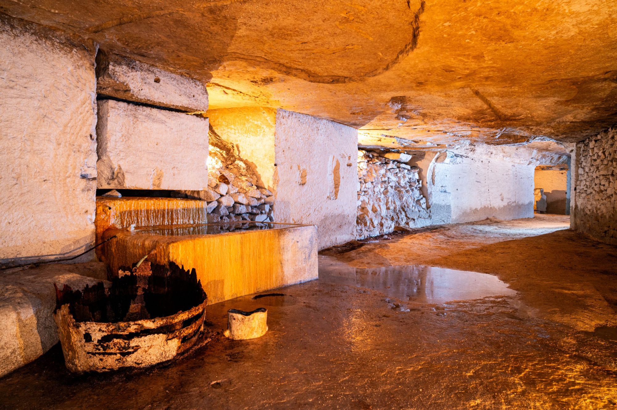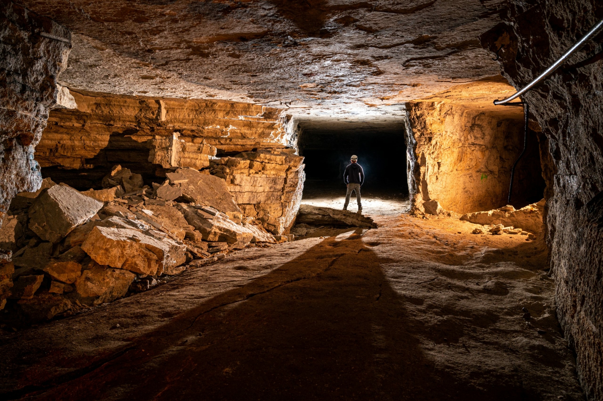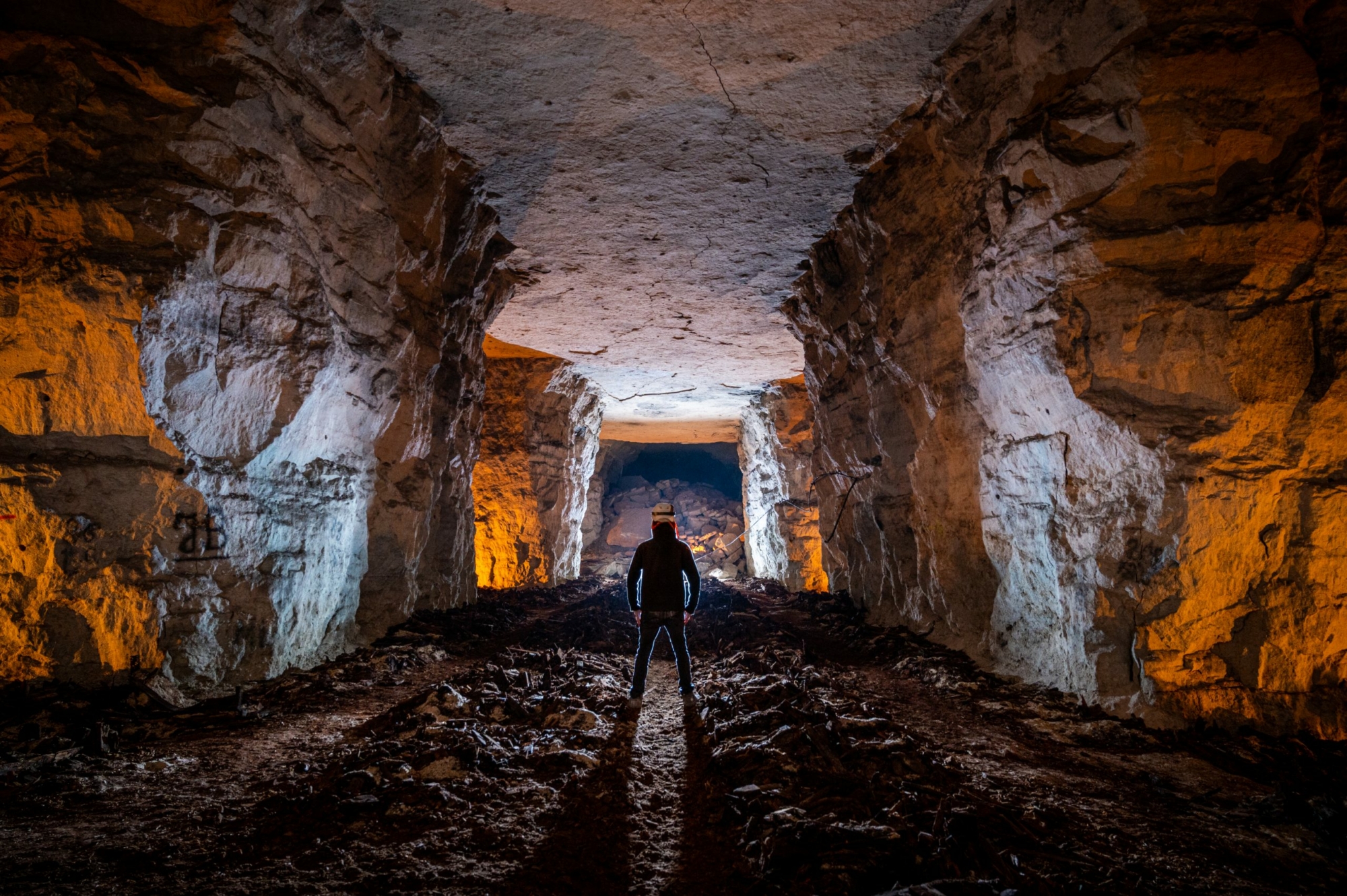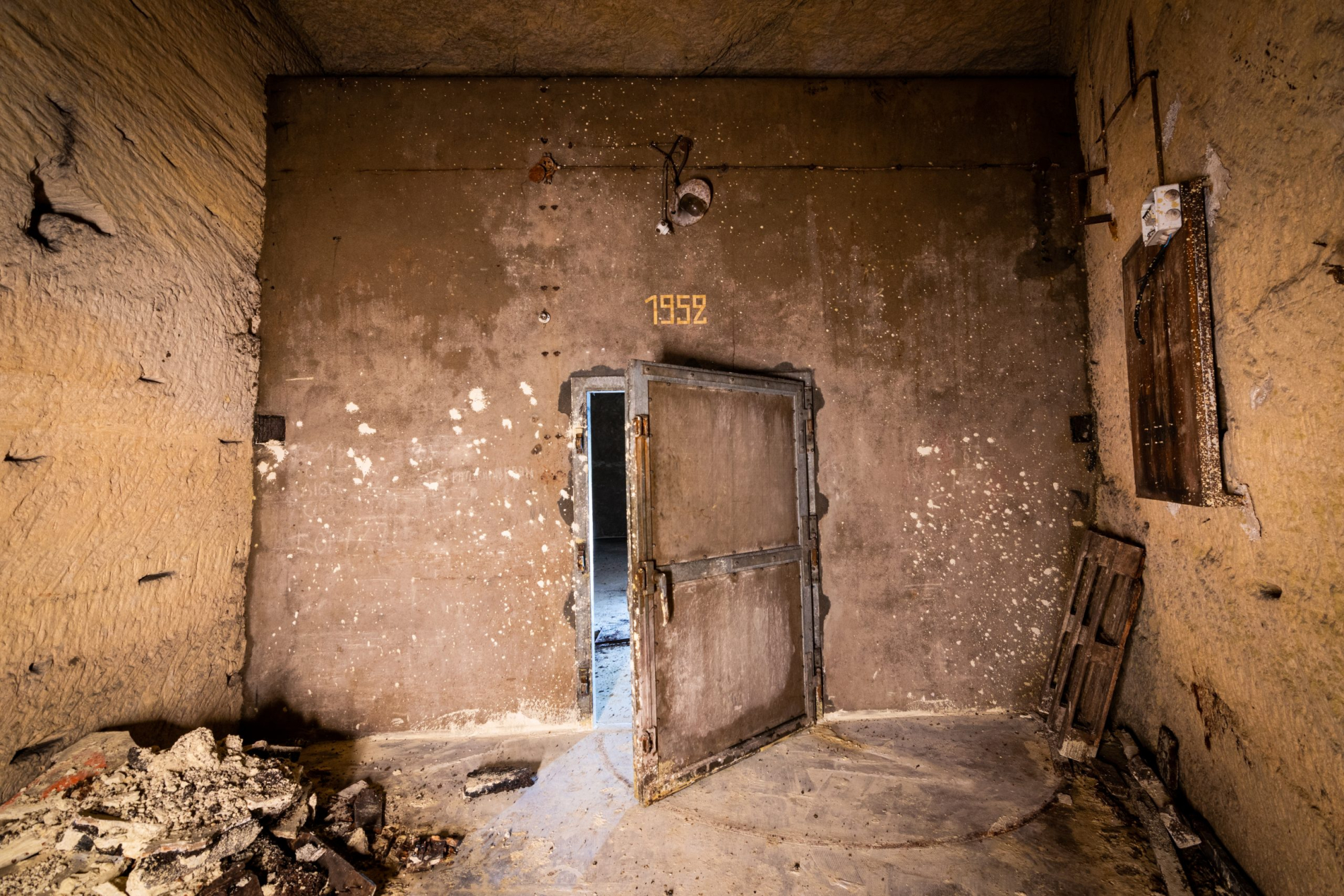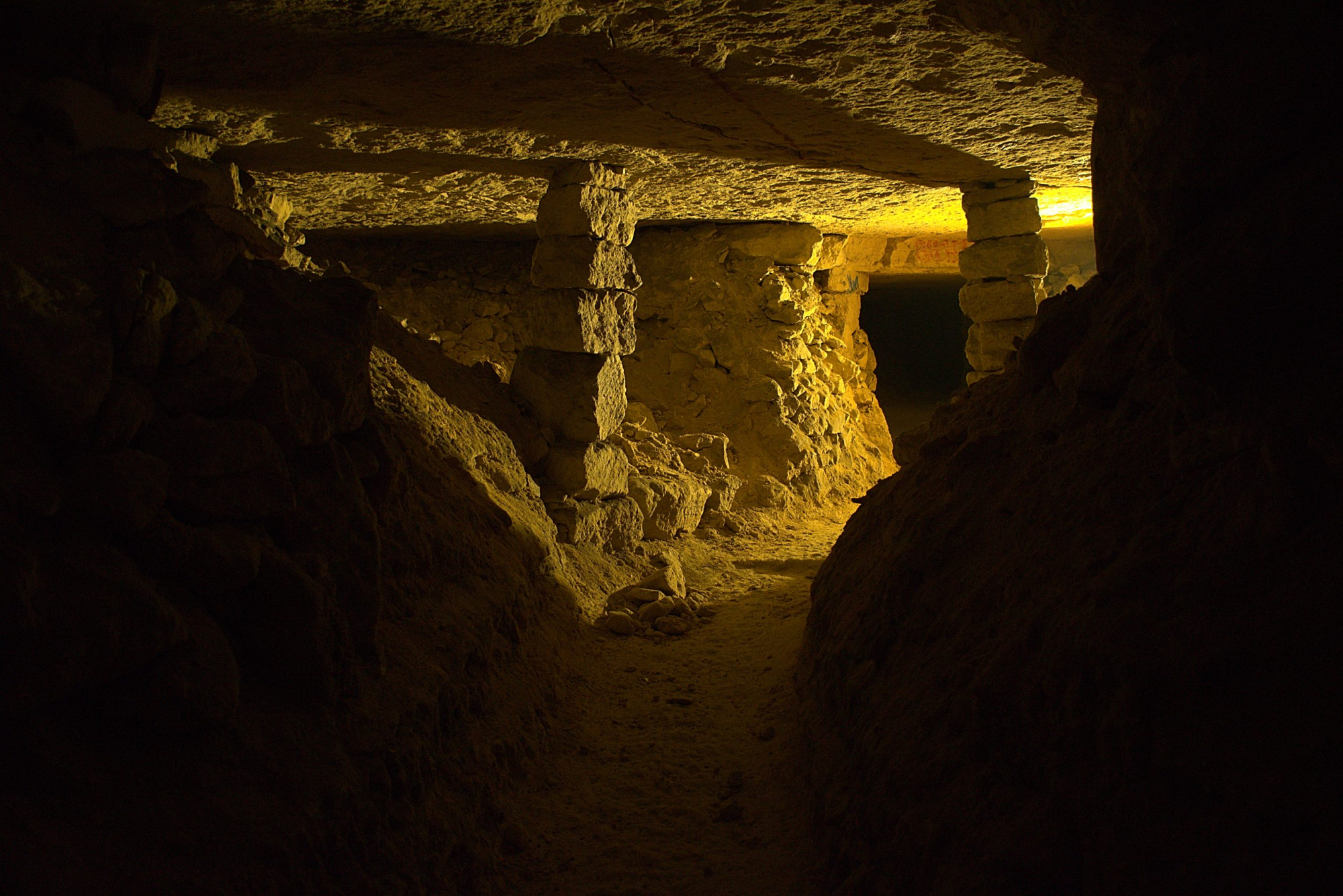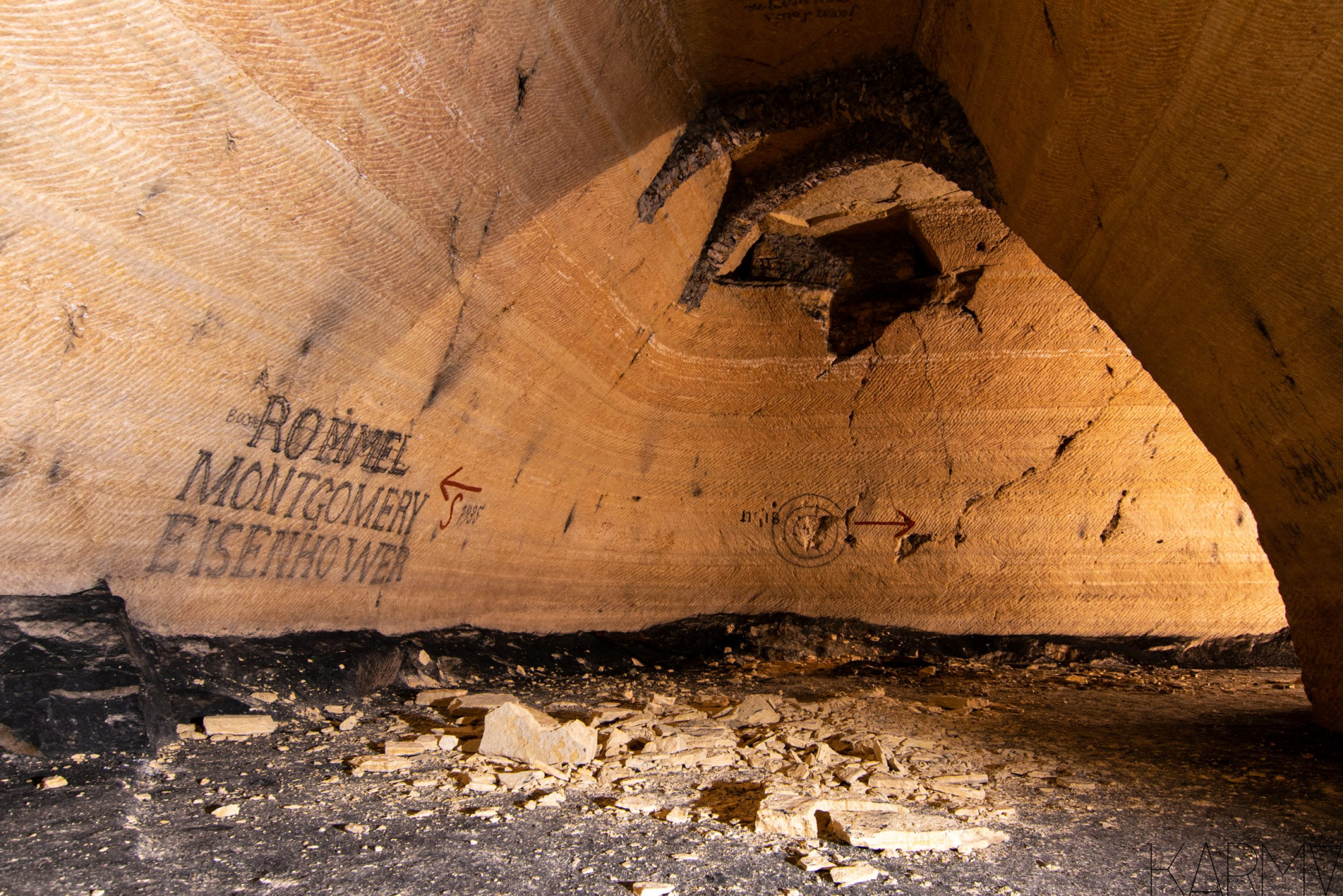 Piliers écaillés dans cette champignonnière. La surexploitation des sols cumulées à la surcharge des terrains de surface font flamber les piliers de masse de la carrière. Déjà très fragilisée par un premier effondrement en 1963 puis un second en 2001. C'est maintenant plus qu'une question de temps avant que cette zone se referme sur elle-même.