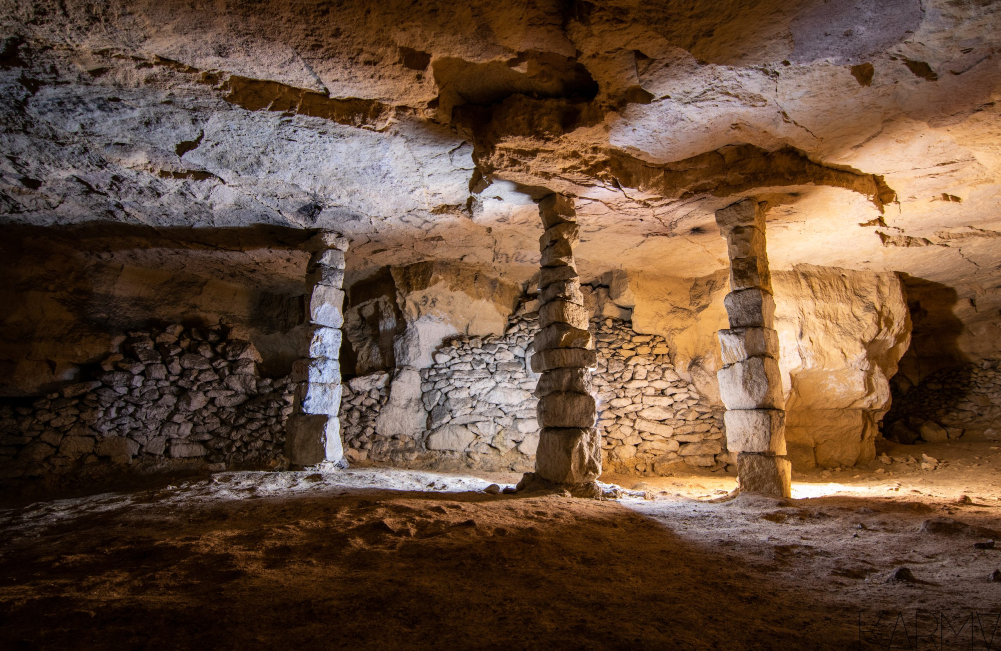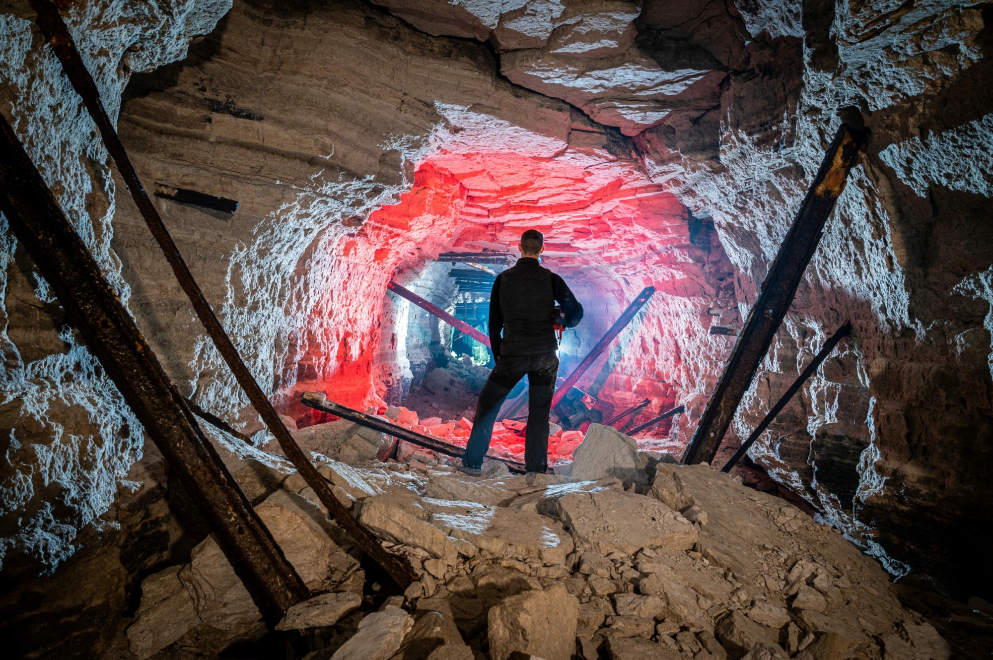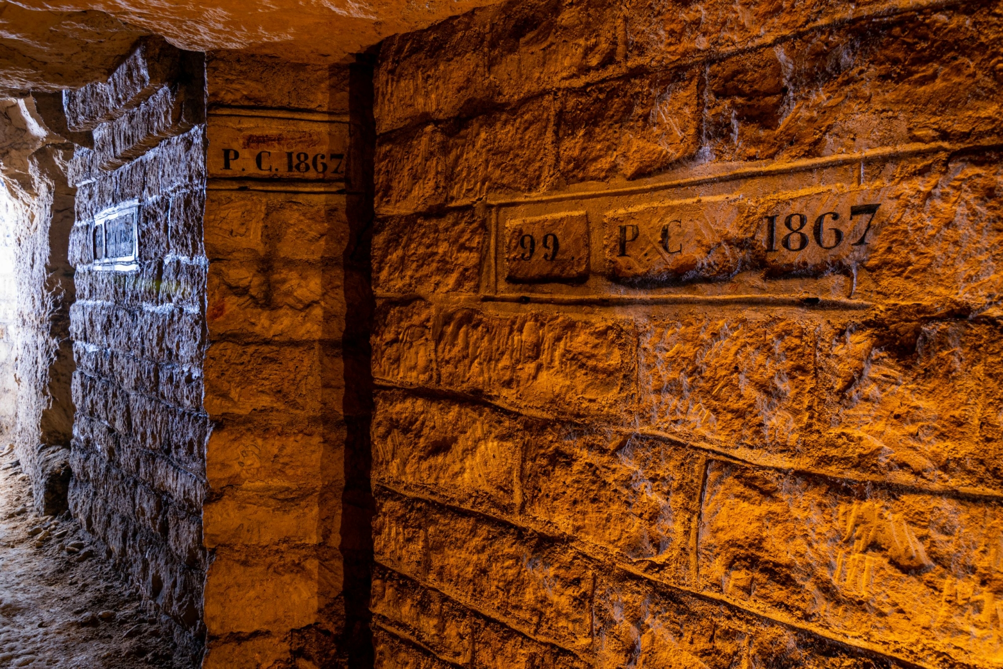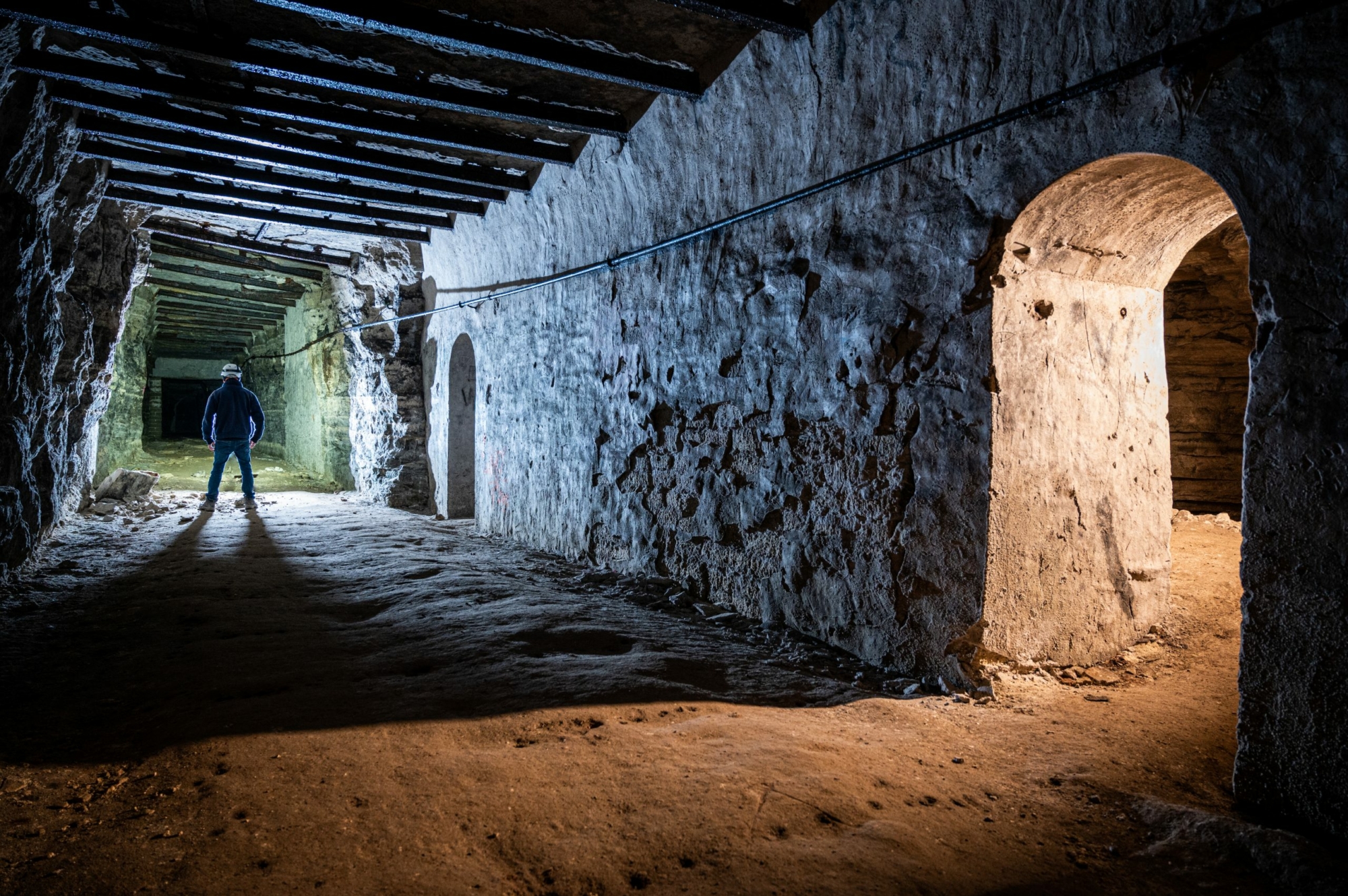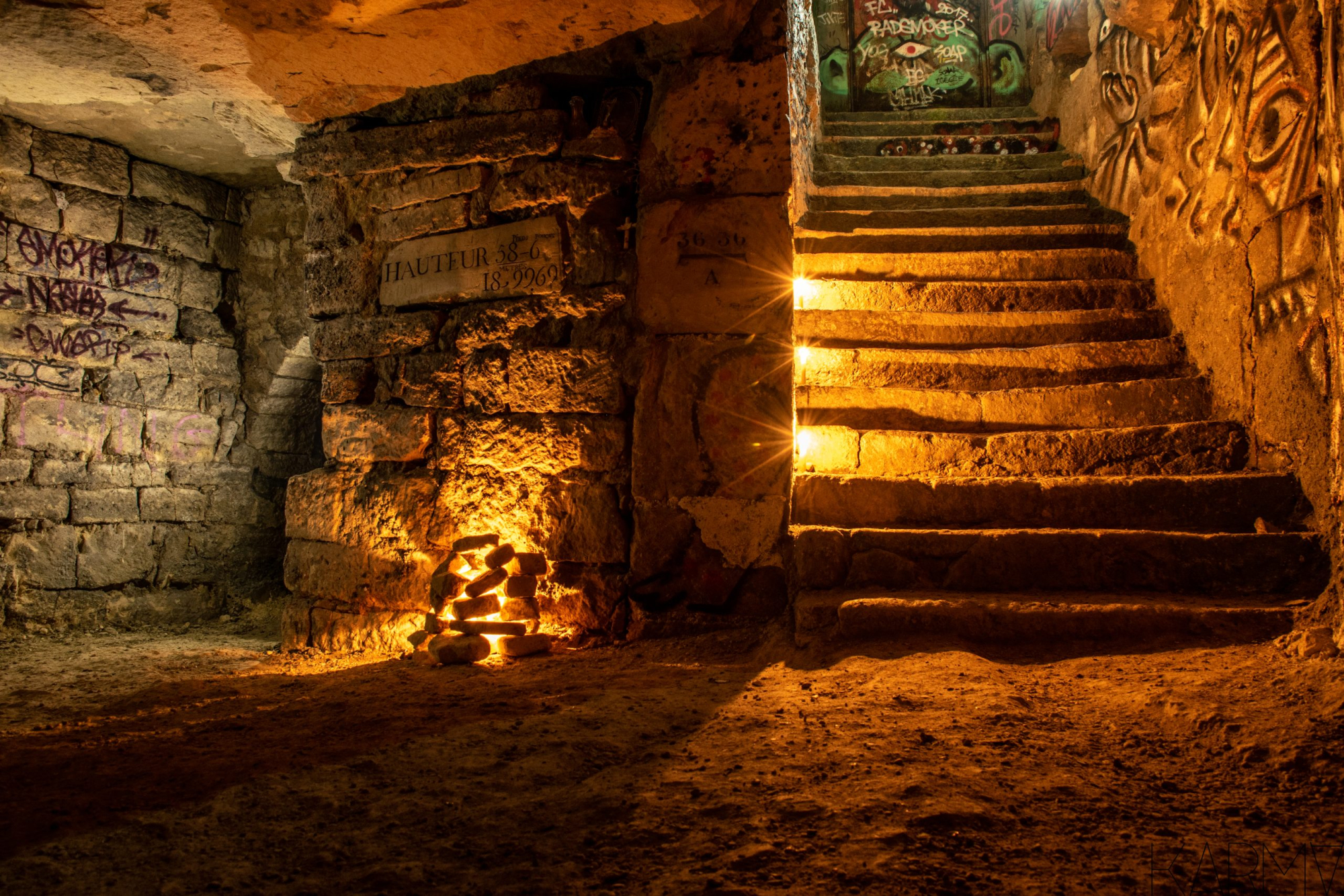 Piliers écaillés dans cette champignonnière. La surexploitation des sols cumulées à la surcharge des terrains de surface font flamber les piliers de masse de la carrière. Déjà très fragilisée par un premier effondrement en 1963 puis un second en 2001. C'est maintenant plus qu'une question de temps avant que cette zone se referme sur elle-même.